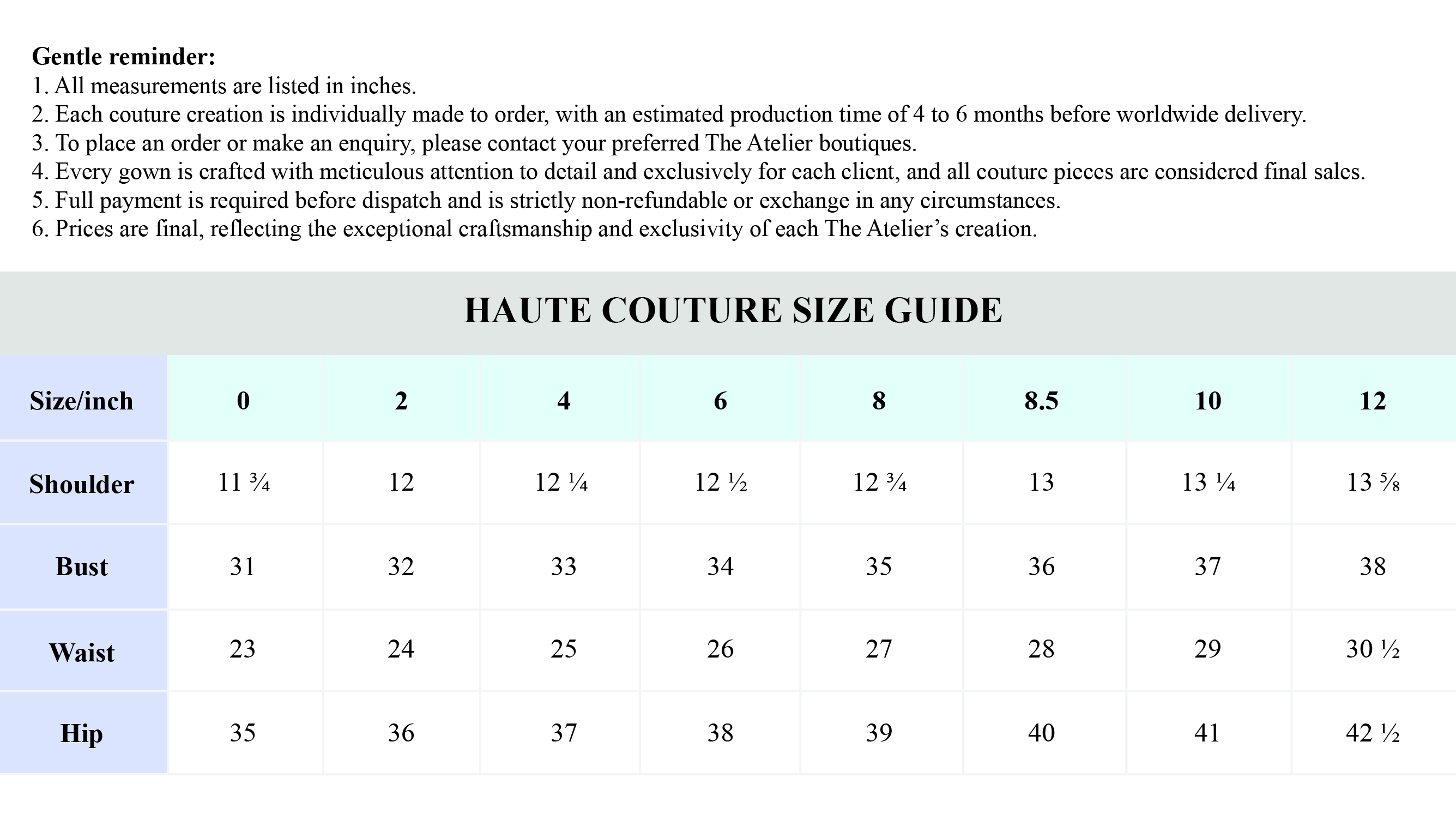 Please Note:Prices are for reference only and may vary depending on order details and boutique location. Our couture bridal and evening gowns are custom-made and typically require 4 to 6 months for production. To place an order, or for rental services and further assistance, please contact your preferred boutique.