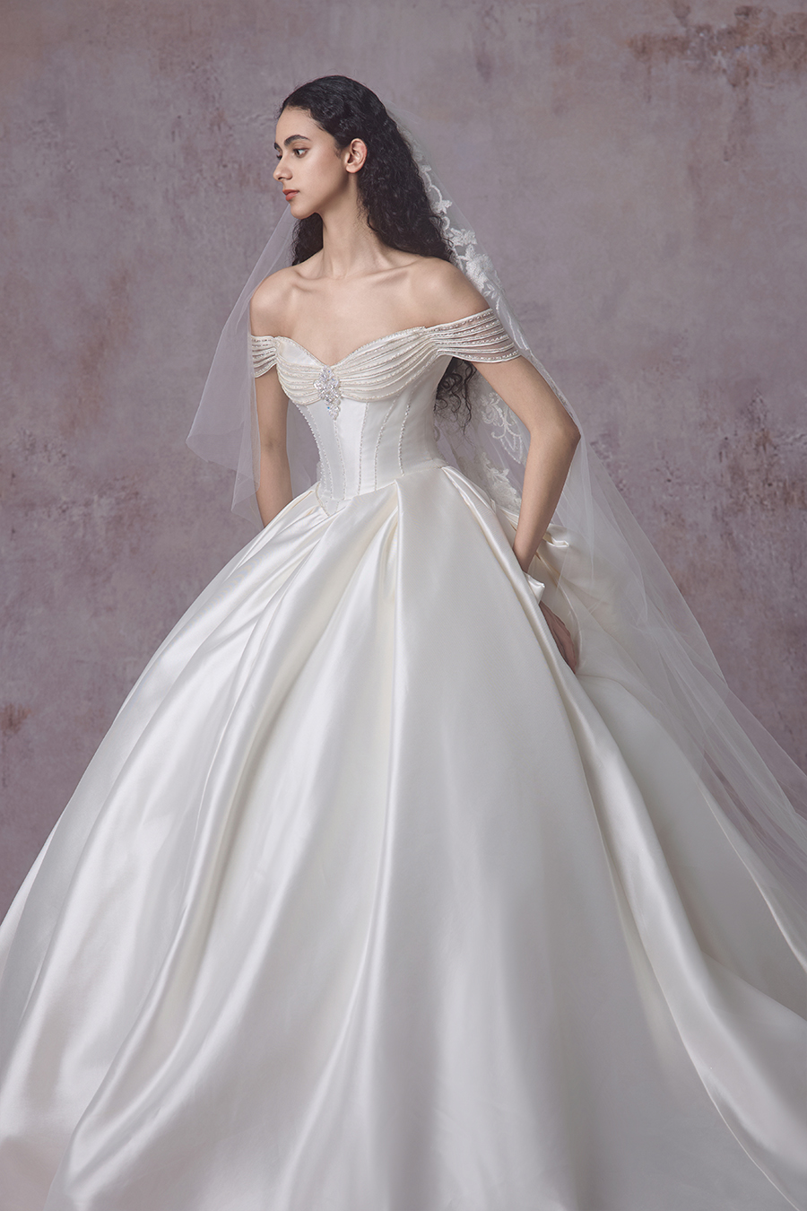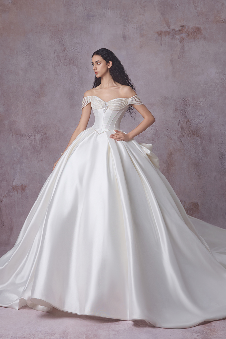 Ethereal and pure, the gown blooms like a mystical flower in a secret dreamscape, unfolding in silence yet casting a soft, enigmatic glow. Enya emerges in fluid, understated lines that whisper of quiet elegance, her beauty touched with an otherworldly grace. Draped in the purity of imported silk satin, she embodies the serenity of minimalism, yet unfurls into a voluminous silhouette that echoes the grandeur of vintage couture with an eternal dream delicately woven into fabric. Along the shoulders, satin piping is sculpted into an exquisite off-shoulder design, revealing a neckline of refined elegance and eternal grace. The waistline tapers with flawless precision, wide above and narrowing below, tracing the body’s curves to celebrate the delicacy of a slender waist. At the neckline, delicate zircon stones glisten, scattering jewelled light that lends a halo of opulent radiance. The oversized bow at the back becomes the gown’s crowning jewel, amplifying its sculptural presence while enveloping it in a profound aura of romance, leaving the wearer luminous, captivating, and unforgettable.