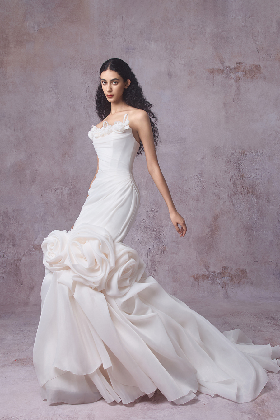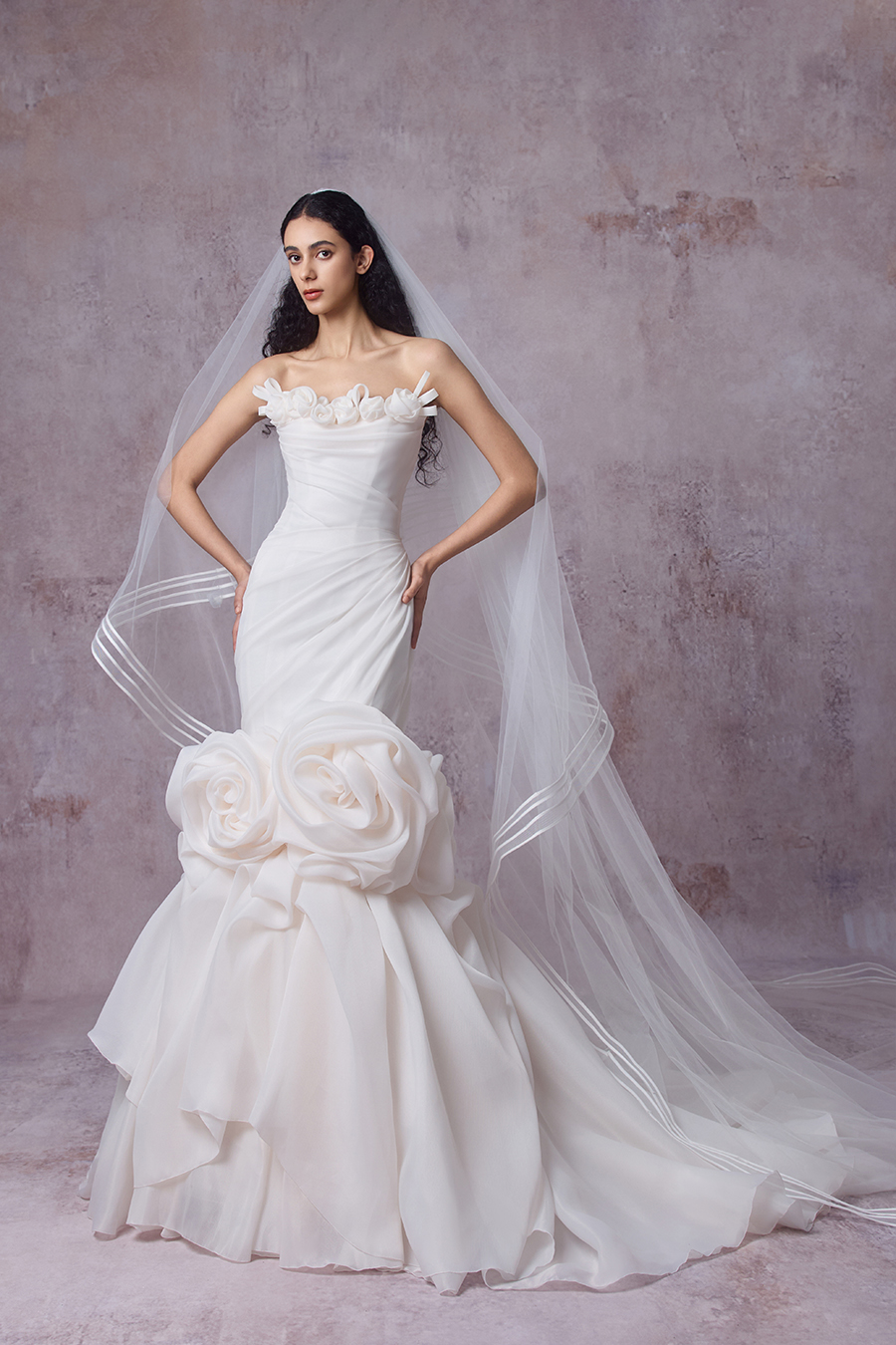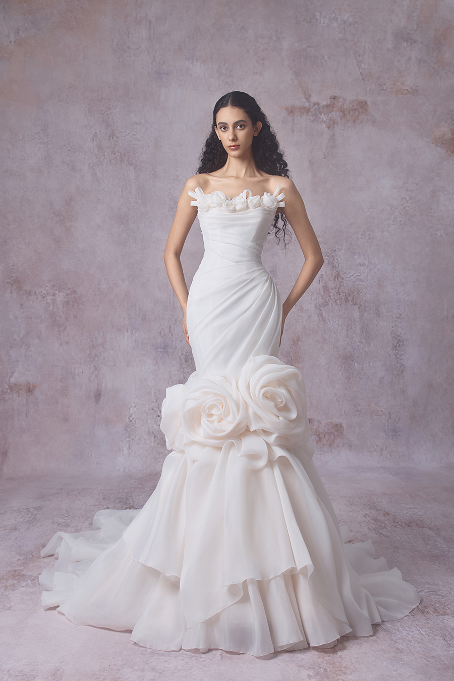 The rose has always been a timeless symbol of love , it is tender yet resilient, whispering stories of romance and grace . For this creation, Clematis carefully selects imported organza, a fabric known for its airy volume, delicate sheen, and fluid drape that together bring the gown to life with poetic lightness . The bodice is sculpted along the natural waistline with meticulous three-dimensional tailoring, forming soft, fluid pleats that echo the rose motifs of the skirt, creating a seamless harmony between structure and romance . The handcrafted roses and the floral adornments along the bustline bloom with lifelike dimension , as if unfolding in nature’s embrace. While the skirt, layered with softly curled wave-like hems, enhances the sense of depth and movement, revealing an elegance that feels both graceful and alive. The gentle hue of baby pink amplifies Clematis’s tender essence, weaving a dreamy and romantic aura that lingers with soft affection and timeless grace.