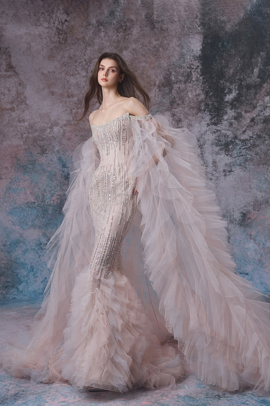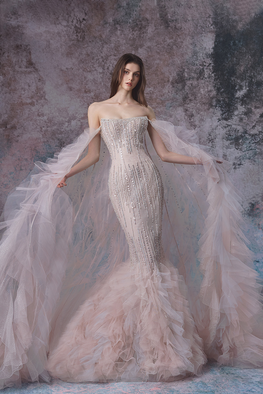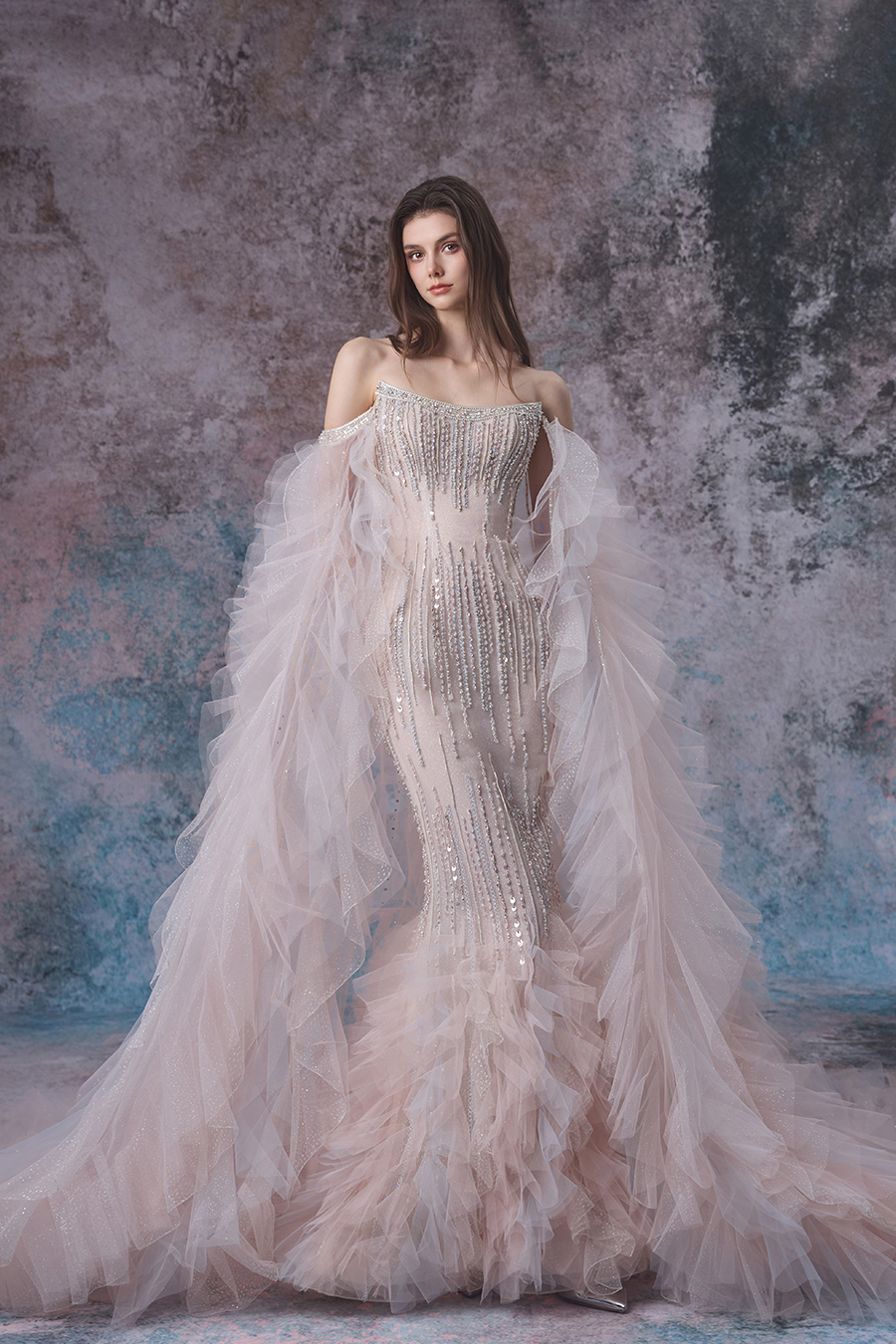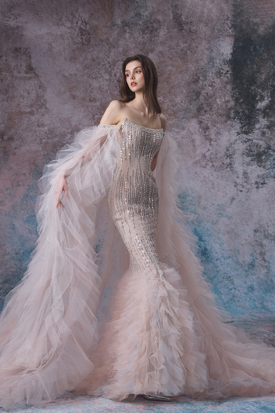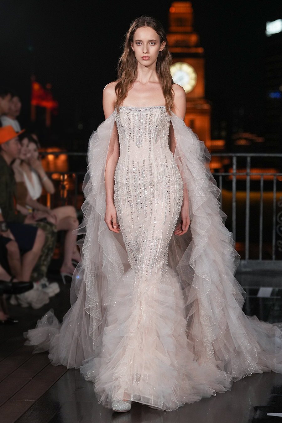 Close your eyes, what will come to your mind? The inspiration for Oviya comes from the softness and agility of tides, with delicate patterns interwoven with pressed strips and machine embroidery techniques on the skirt, and heavy beading embellished like stars. At the hem of the skirt, the shimmering mesh cleverly splices pink and gray into a lotus leaf shape, and the detachable lotus leaf floating yarn is light and agile. Inspired by the gentle and dynamic nature of tides, the fish tail cut fits the curve, like waves gently embracing. The whole body sparkles with beads and fine diamonds, like sparkling waves. The soft chiffon shawl is like tidal mist, layered and dreamy. The combination of sheer fabric and sequins is both firm and soft, possessing both the power of tides and the gentleness of femininity. Wearing it is like wearing the romantic and mysterious charm of the sea, and it will surely shine brightly on important
