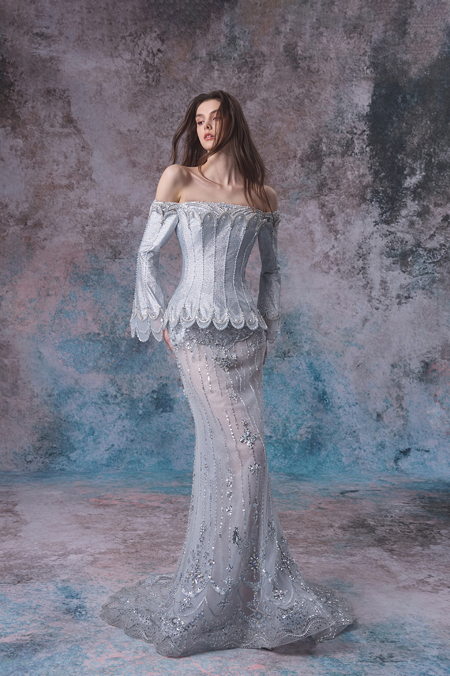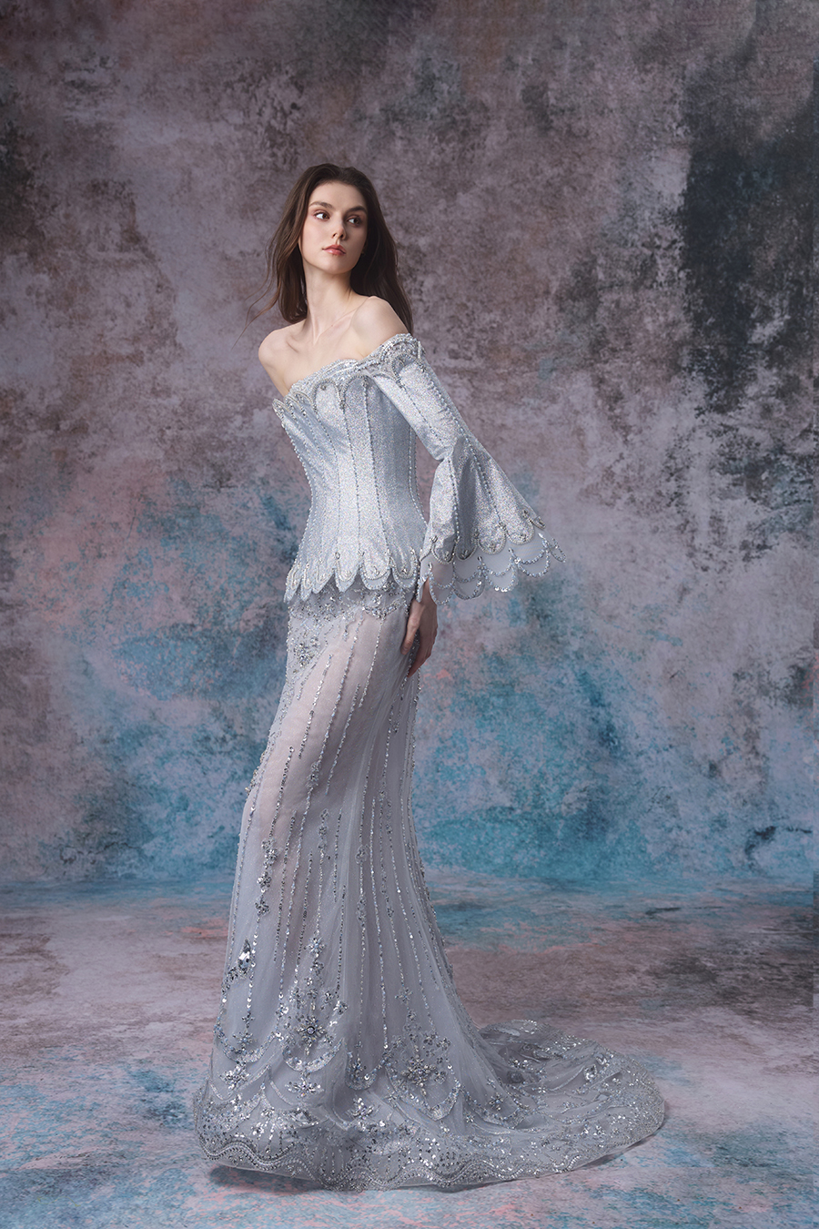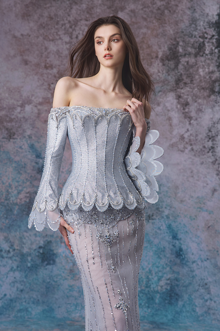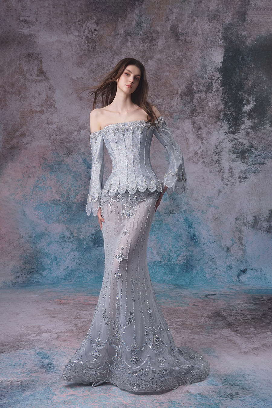 Adelina, She is like a soft veil enveloping a light blue tide within reach. Designers draw inspiration from the rhythm of tides and the magnificence of the ocean. Stand up with a straight shoulder and elegantly showcase the shoulder and neck lines, with long sleeves and a slim fishtail skirt that complement each other, creating a gentle contour that resembles the ebb and flow of tides. The decorative craftsmanship is unparalleled, with exquisite bead embroidery covering the skirt like stars falling into the waves, sparkling with dreamy radiance; Lace outlines the contours, adding a romantic touch, like delicate patterns left by tides. The blend of transparent gauze and exquisite decoration creates a hazy and mysterious ocean atmosphere.