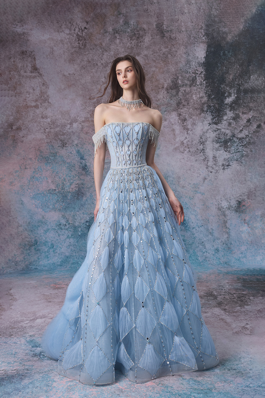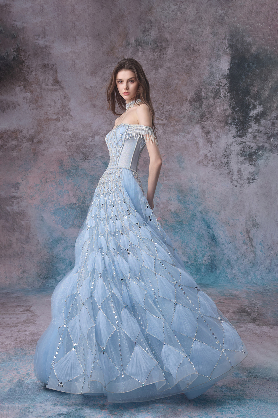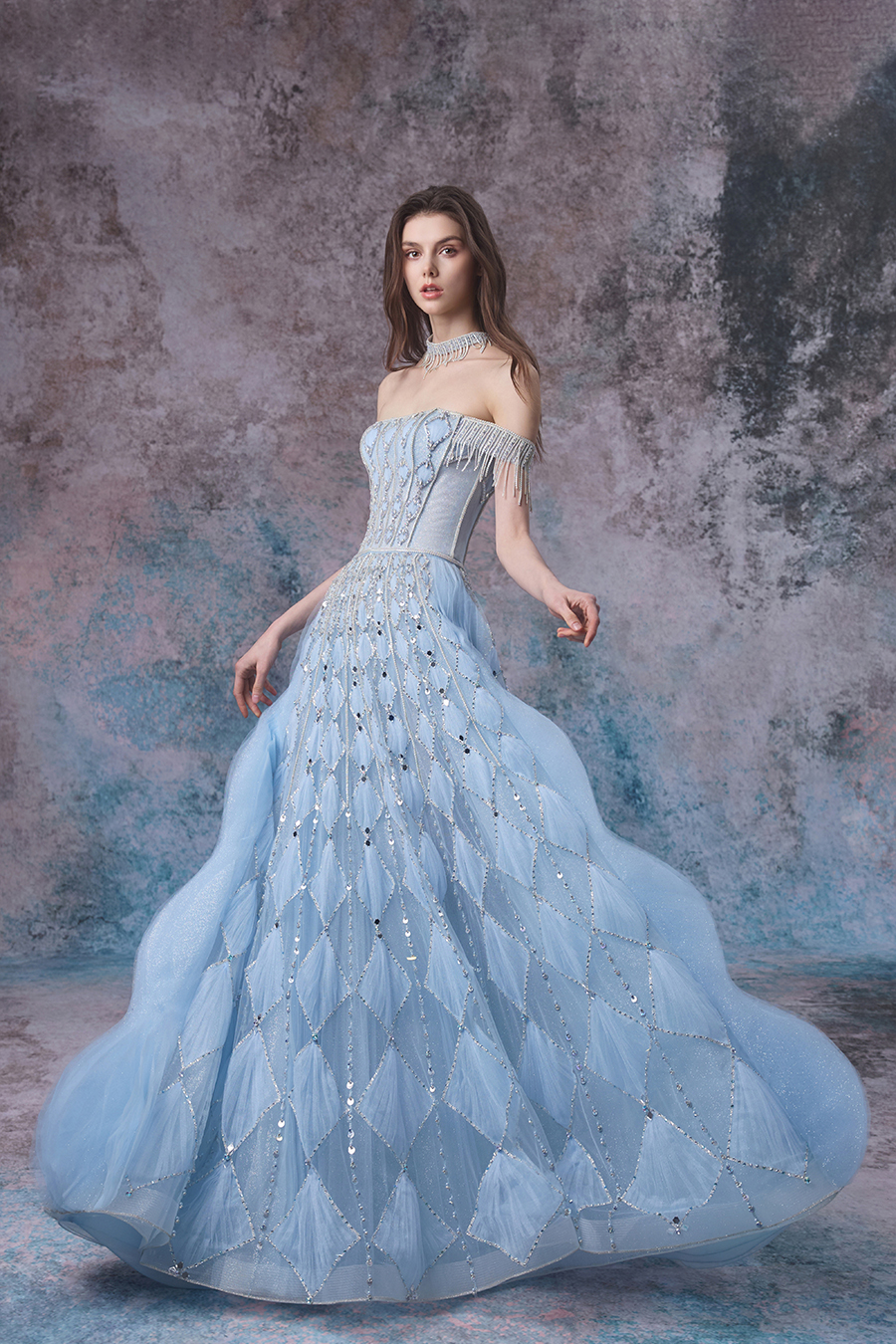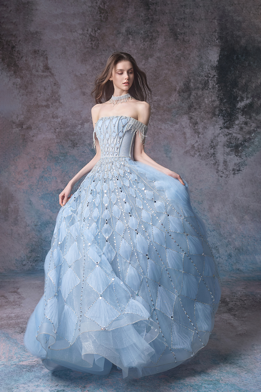 In the dreamy blue sea, the gentle sound of the tides caresses the beach, embodying the romantic relationship between Belvadora and the ocean that has lasted for thousands of years. This dress features a diamond themed pattern, gradually arranged from small to large. On each diamond, the radial pleating process is exquisite, the silver Türkiye fabric is more luxurious, and diamond lenses are arranged orderly in the middle of the diamond lattice. At the one shoulder sleeve, zircon diamond bars are arranged in tassels, swaying gracefully. The off shoulder design showcases the elegant shoulder line of women, with a high waisted cut that elongates the body, resembling tidal undulations. In terms of structural craftsmanship, exquisite tailoring and layered chiffon create a flowing texture, dancing lightly like the sea waves. Swarovski drill choker on the neck is set against crystal and beadwork, simulating foam of spray. As a whole, it shines brightly in the darkness, showcasing the blend of Belvadora's softness and grandeur.
