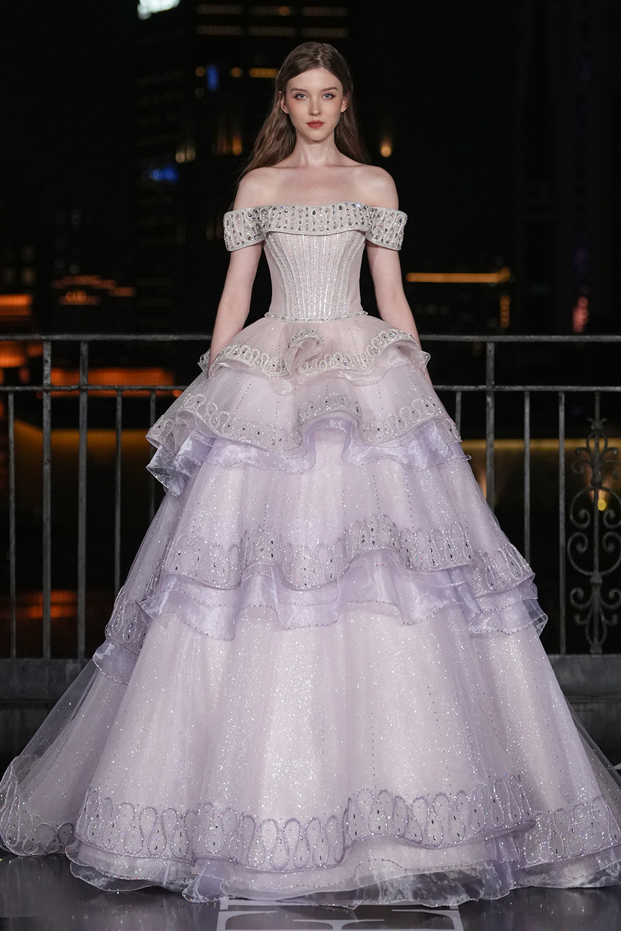 Zaria, Interpreting a unique charm with a distinctive posture. The entire piece is crafted with S-shaped line elements, creating a dreamy pink and purple cake skirt. Each layer of lotus leaf edge is overlaid with shimmering mesh and smoothie fabric, with exquisite silver embroidery lines and sparkling Swarovski crystal diamonds on the edges. At the S-shaped line of the one shoulder, there is a large moonlight pink diamond key nail bead that shines brilliantly. The simple yet elegant one shoulder design showcases the lines of the collarbone and shoulders; The fluffy skirt is like a tidal surge, with rich layers and a romantic atmosphere. The decorative craftsmanship is exquisite, with fine beads and delicate diamond decorations covering the skirt, resembling tidal waves; Layers upon layers of lace, like patterns after the tide recedes. Multiple techniques blend together to perfectly present the mysterious and gentle beauty of the ocean. Wearing it, it's like hearing the whispers of the tide, shining with a unique radiance like an ocean elf at important moments.