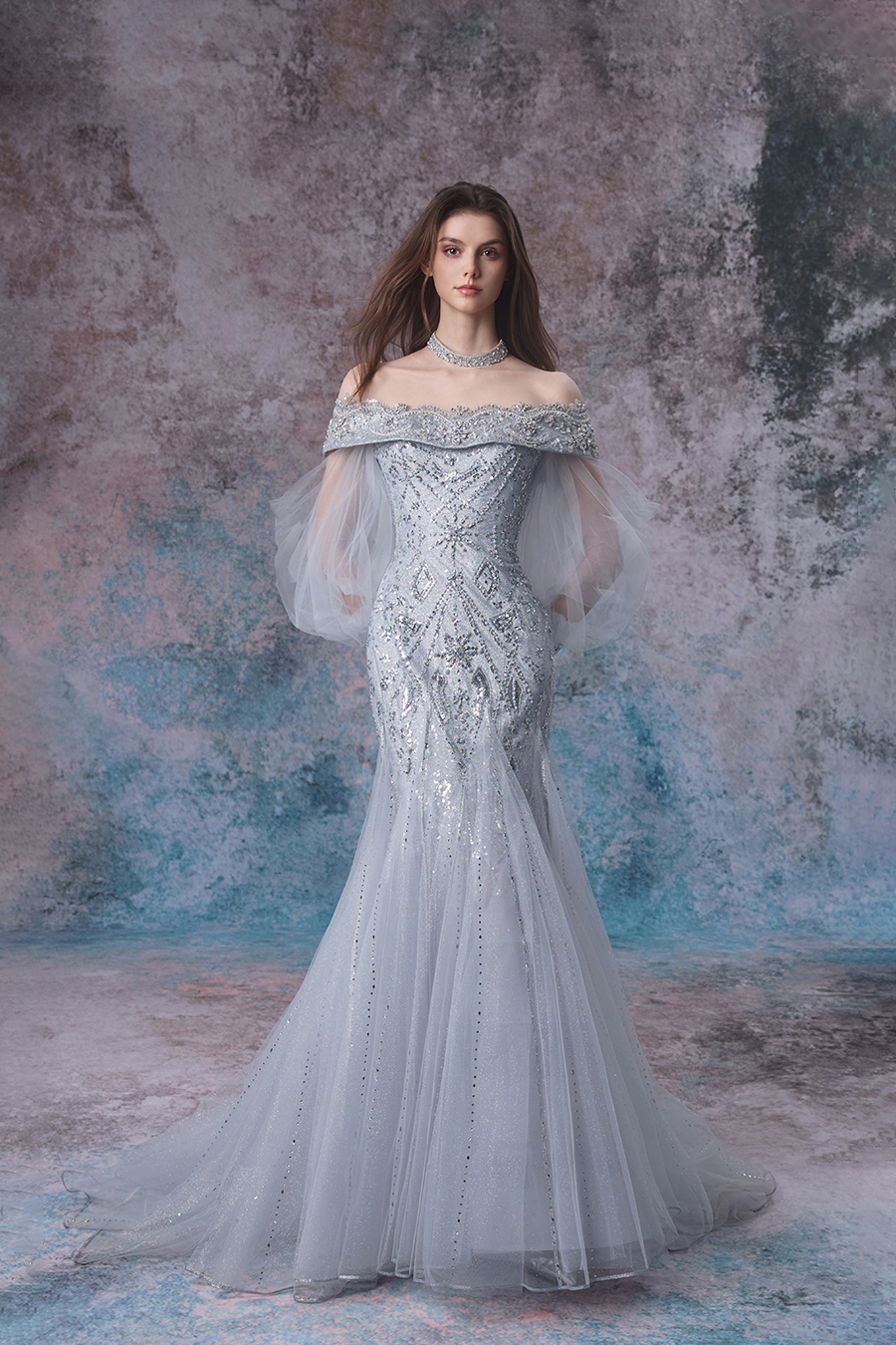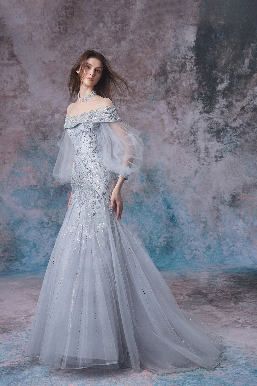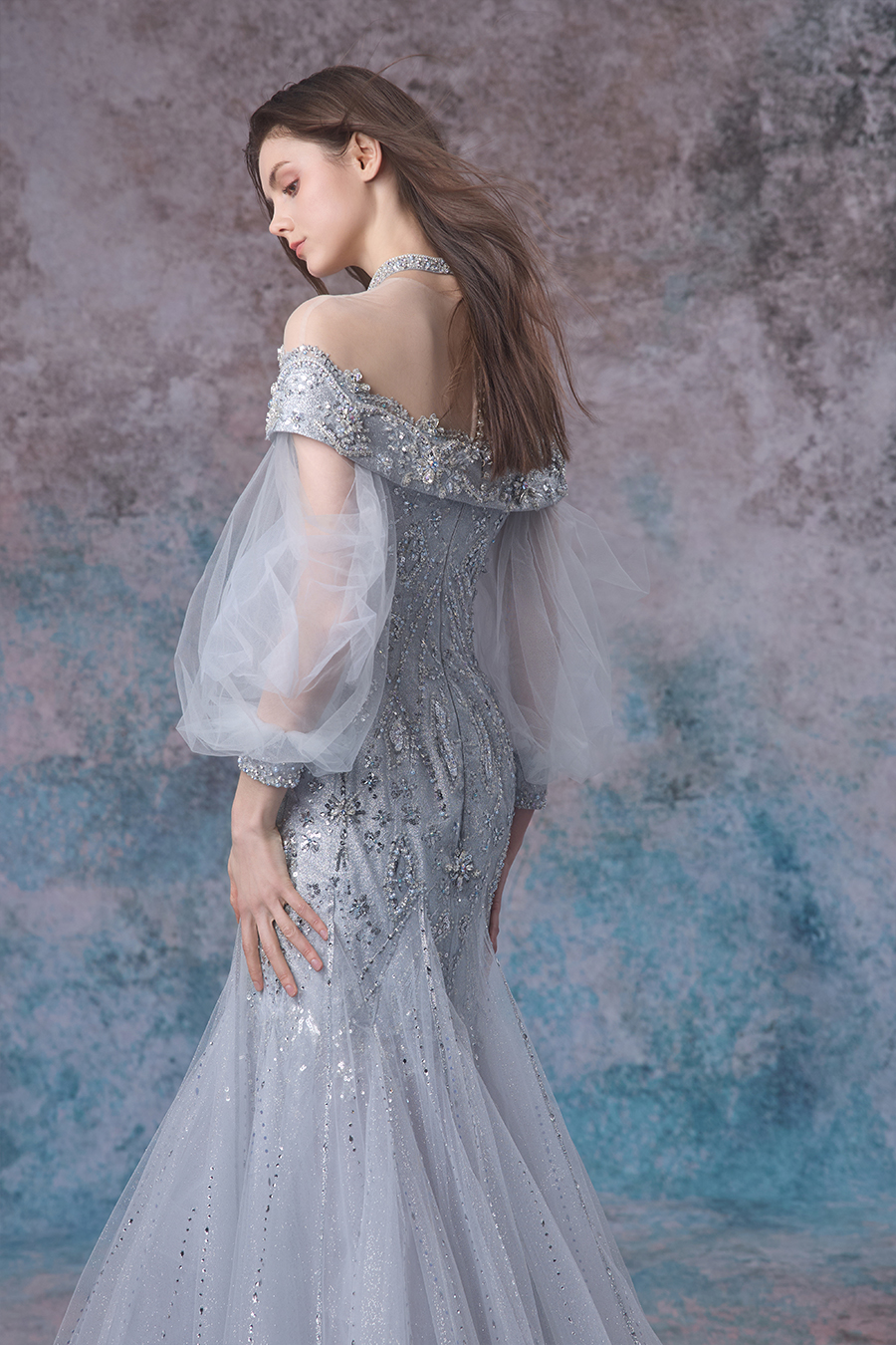 Noemi's inspiration comes from the undulating rhythm and gentle charm of tides. One shoulder stands up in a magnificent manner, delicately cut with lantern sleeves and cleverly spliced at the waist, using provincial road transfer to shape slender waist limbs. The fish tail is divided by curved cutting lines, swaying gracefully while walking. The decorative craftsmanship is even more exquisite, with three-dimensional bead seams using beads of different sizes to simulate the layers of waves. High temperature rhinestones are dotted like stars, reflecting a brilliant light under the light, shining like tides. The layered gauze, like sea mist swirling, perfectly presents the agility and softness of the tide, showcasing a dreamy romance.