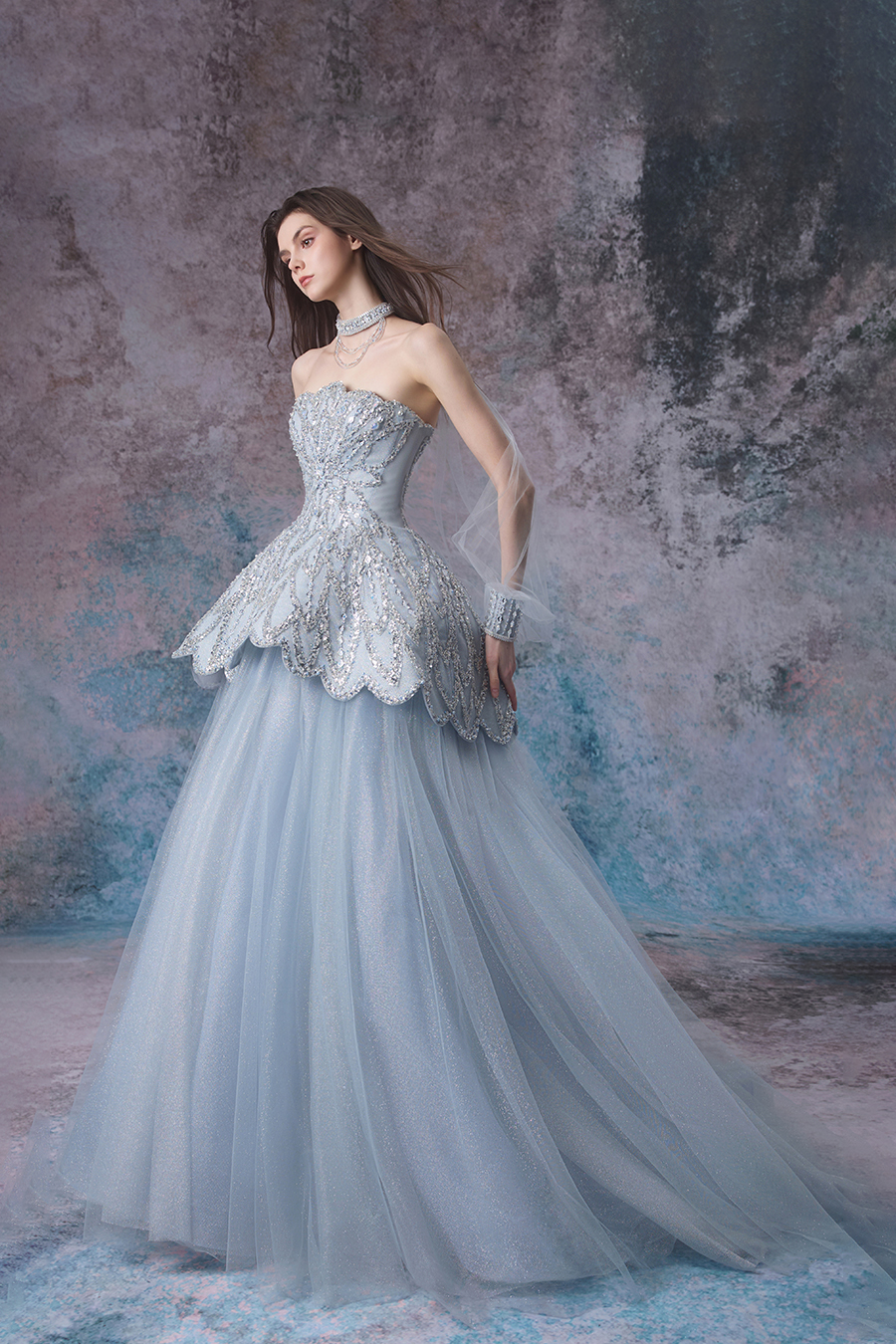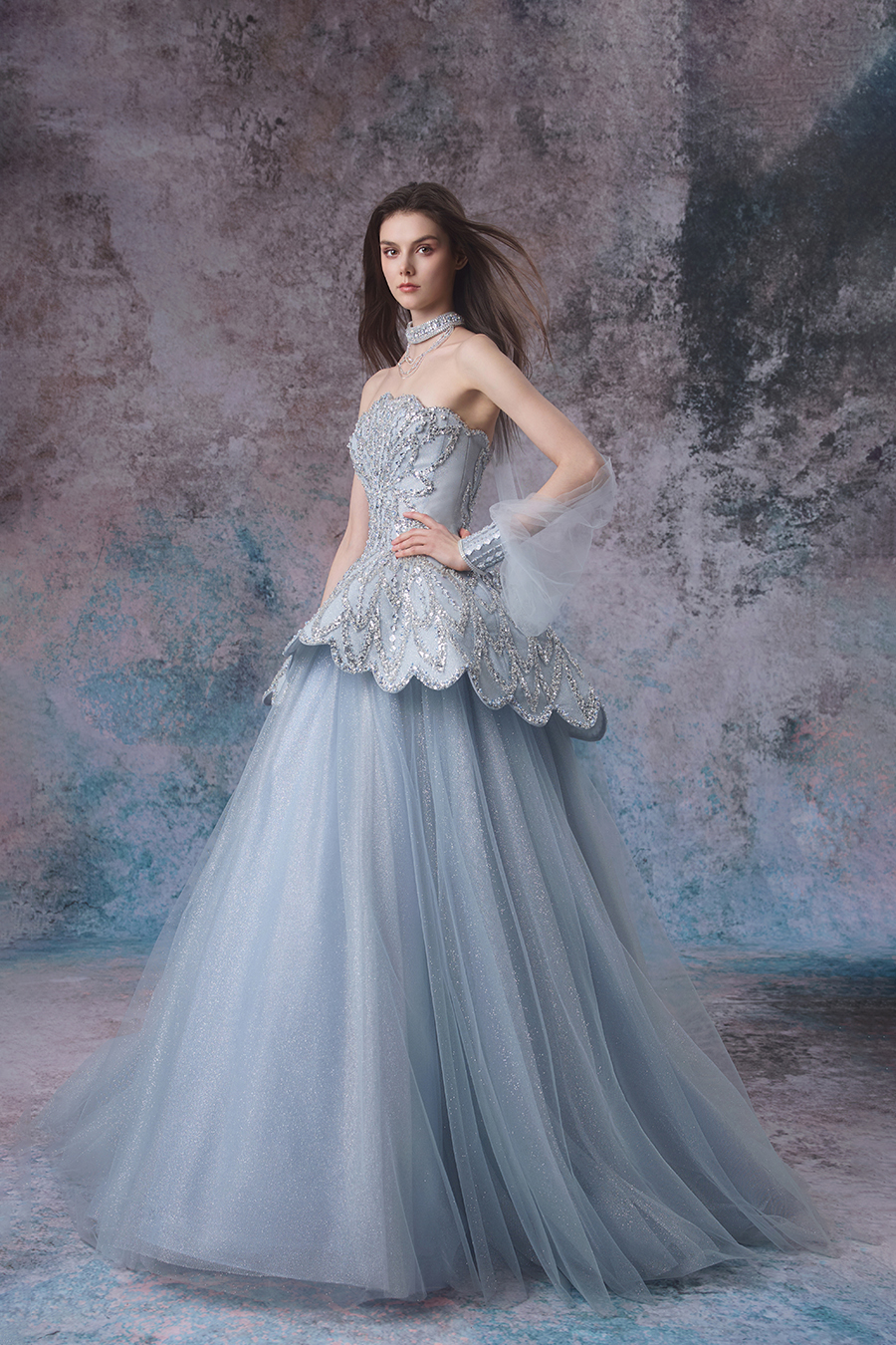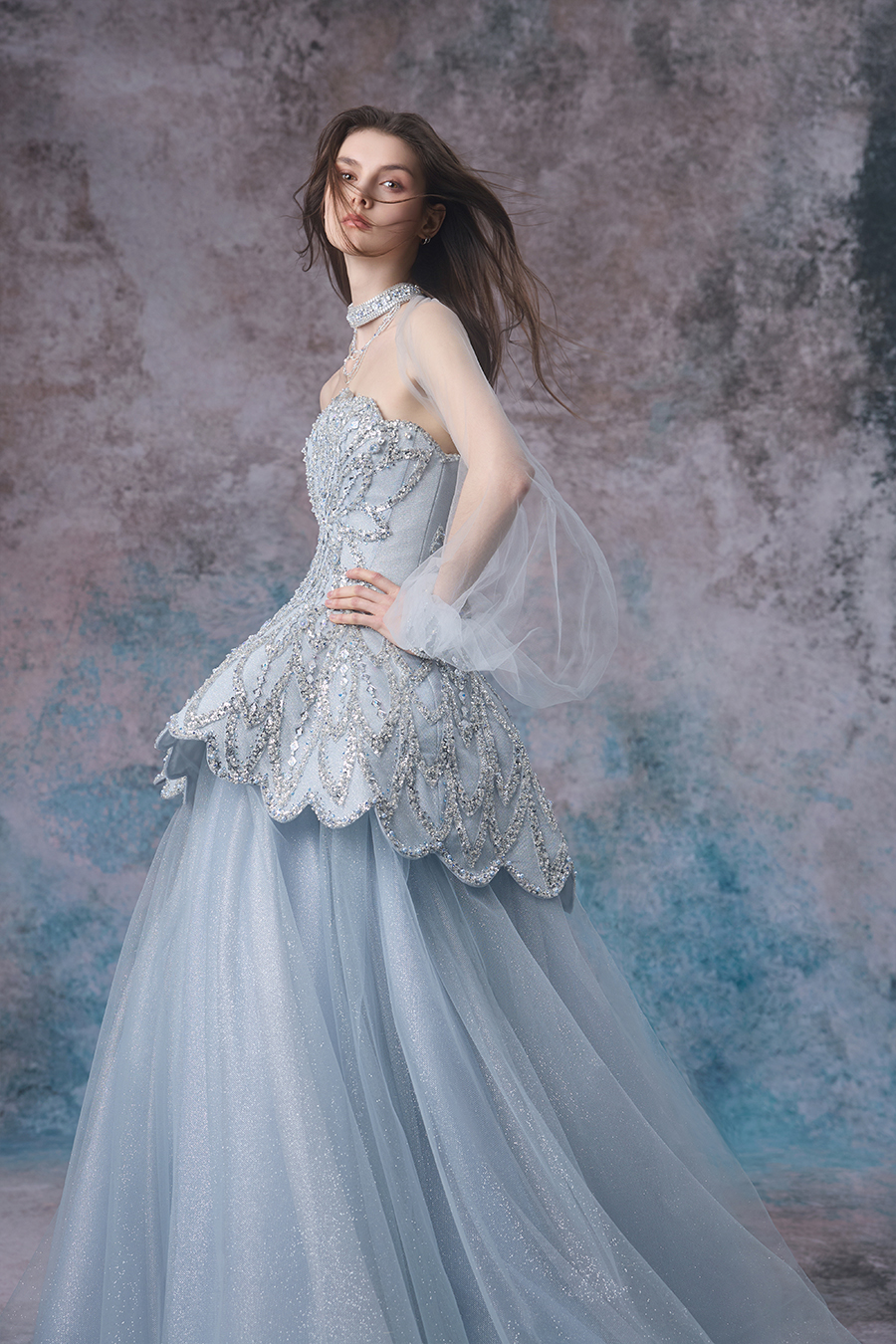 In the deep and dreamlike abyss, inspiration rises like sparkling bubbles, gracefully dancing from the enchanting realm of tides and light and shadow. Lavinia highlights elegance with a one shoulder silhouette and a grand A-line skirt. The structural craftsmanship is quite ingenious, with a close fitting chest lining and fishbone support on the upper body, shaping it into a firm and sturdy shape; The waist is spliced and trimmed horizontally, outlining a slender waistline. The skirt is gradually spread out from the inside out with multiple layers of different hardness mesh, and the outer layer of mesh is pleated according to the tidal wave direction to create a dynamic sense of hierarchy. In terms of decoration, it is adorned with bead embroidery and sequins, simulating scattered shadows of waves. The neck bead chain echoes, showcasing the romance and agility of tides.
