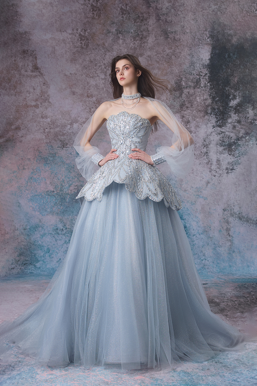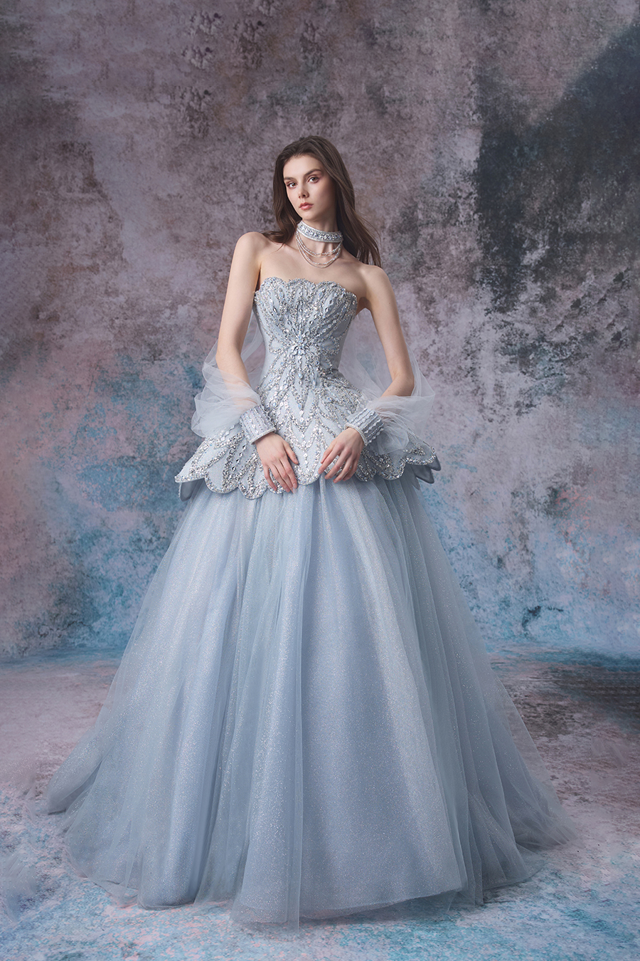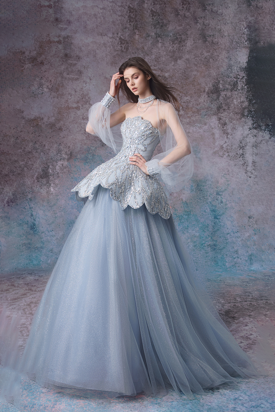 In the deep and dreamlike abyss, inspiration rises like sparkling bubbles, gracefully dancing from the enchanting realm of tides and light and shadow. Lavinia highlights elegance with a one shoulder silhouette and a grand A-line skirt. The structural craftsmanship is quite ingenious, with a close fitting chest lining and fishbone support on the upper body, shaping it into a firm and sturdy shape; The waist is spliced and trimmed horizontally, outlining a slender waistline. The skirt is gradually spread out from the inside out with multiple layers of different hardness mesh, and the outer layer of mesh is pleated according to the tidal wave direction to create a dynamic sense of hierarchy. In terms of decoration, it is adorned with bead embroidery and sequins, simulating scattered shadows of waves. The neck bead chain echoes, showcasing the romance and agility of tides.