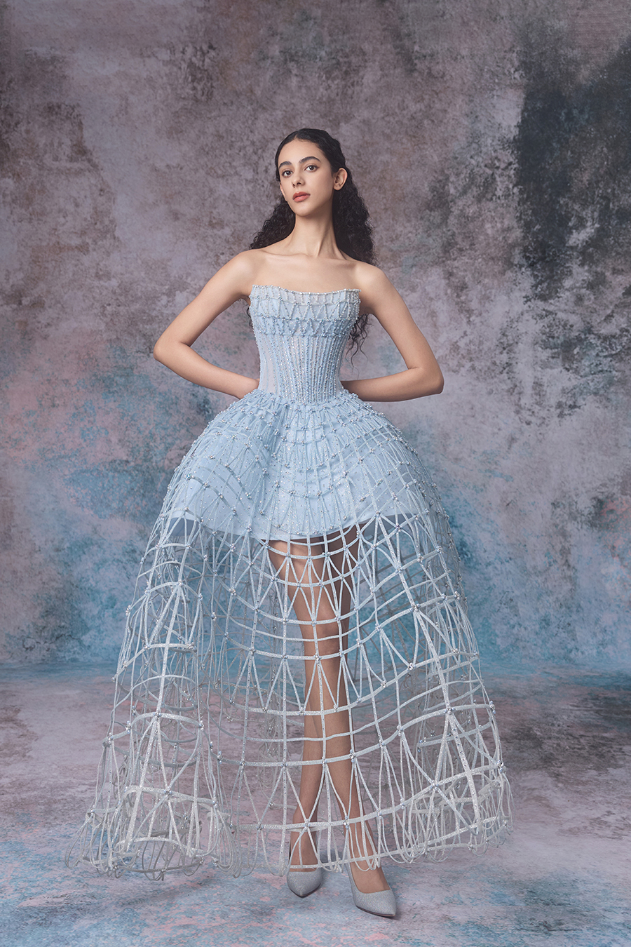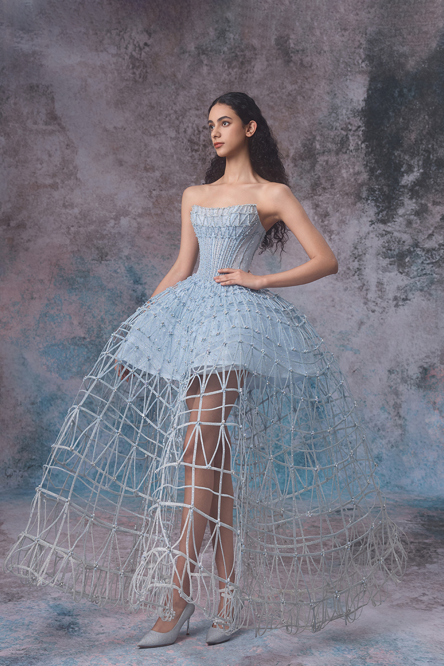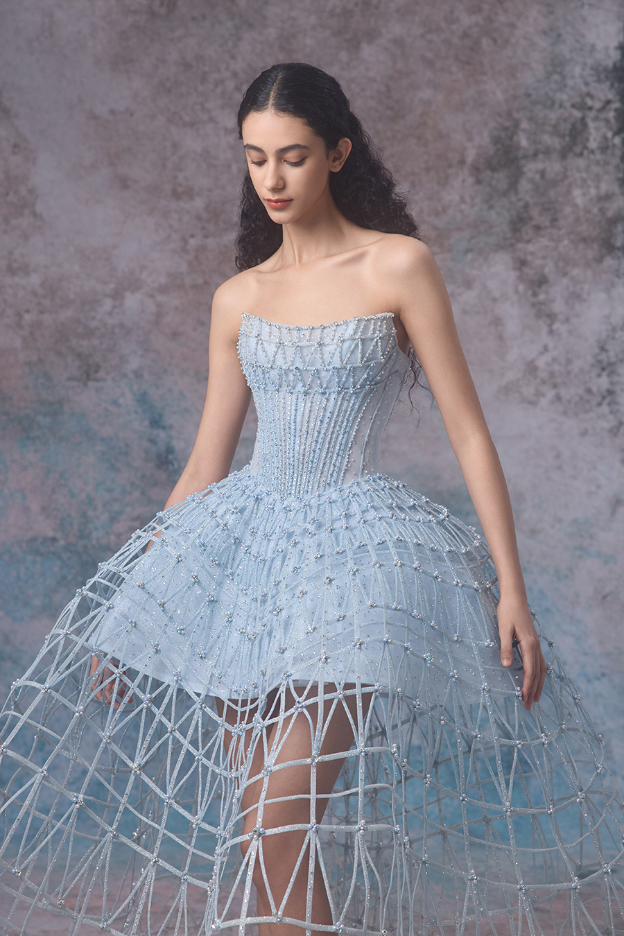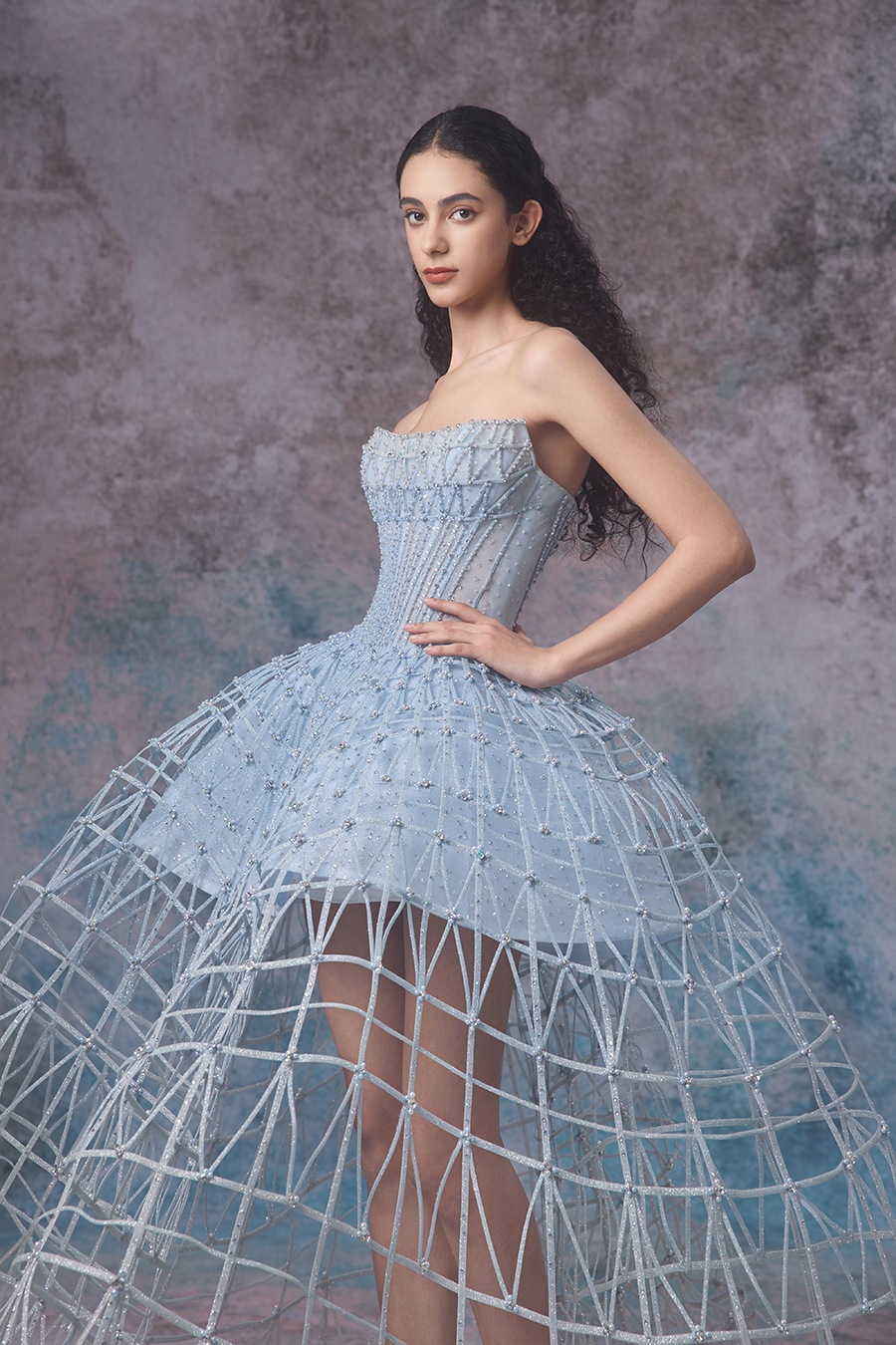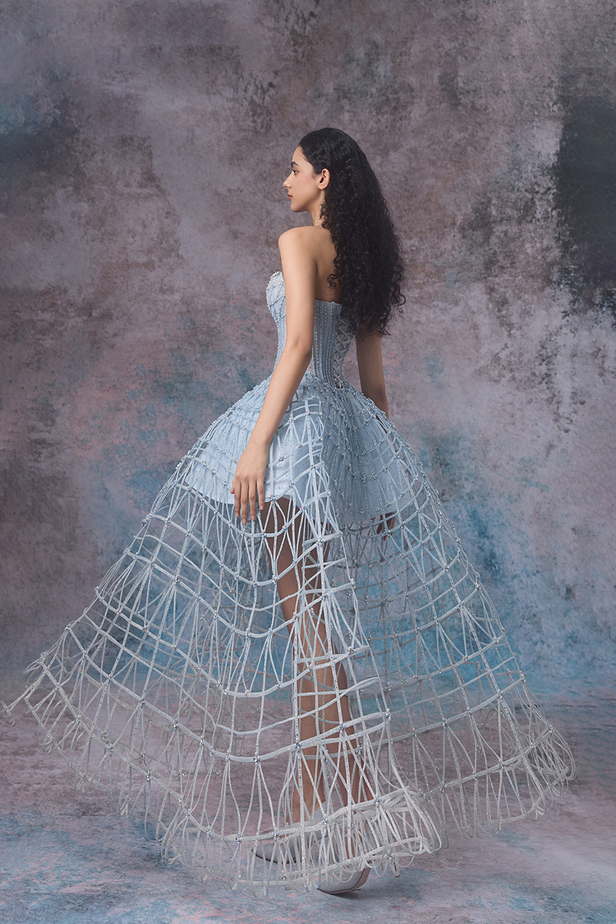 Riona draws inspiration from the whispers of tides and shores, as well as the dreamlike realm of whispers. An off shoulder short top paired with an exaggerated large skirt, resembling the undulating rhythm of the tide. In terms of structural craftsmanship, the inner layer is made of hot stamping fabric, and the outer layer is made of imported fabric wrapped in fish bones, which are then hand sewn into a fine hollow shape, while being firmly sewn to ensure a neat and straight shape. The skirt is woven with white mesh rope into a fishing net like structure, resembling the unique texture left by tidal surges. In terms of decorative craftsmanship, sparkling beads are cleverly embellished between the mesh ropes, and hand sewn beads are used to decorate the hollow areas and the intersection points of the mesh ropes, resembling the sparkling waves in the tide under the night sky. The overall design vividly showcases the agility and softness of tides, as if immersing oneself in a dreamlike scene of tidal murmurs.