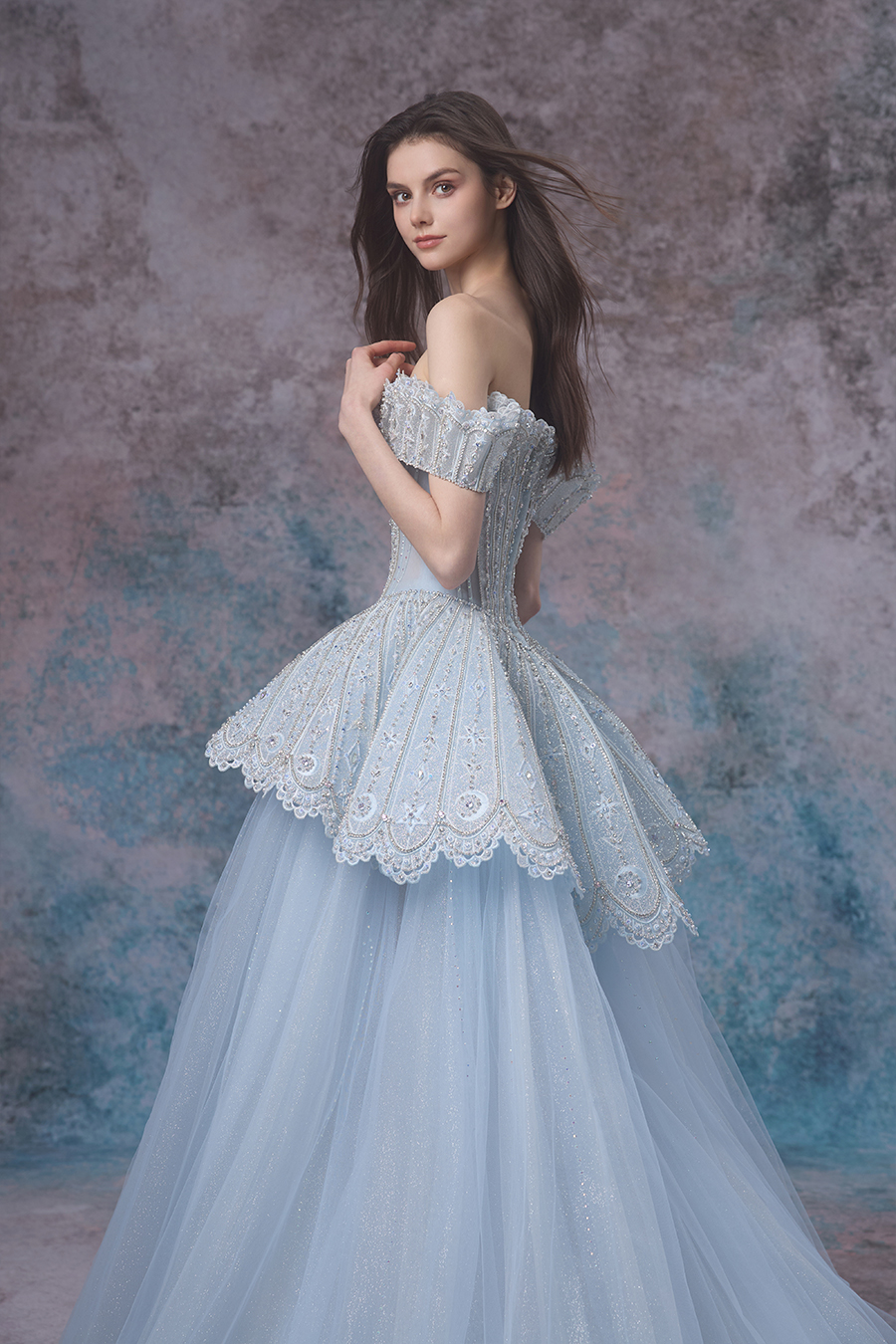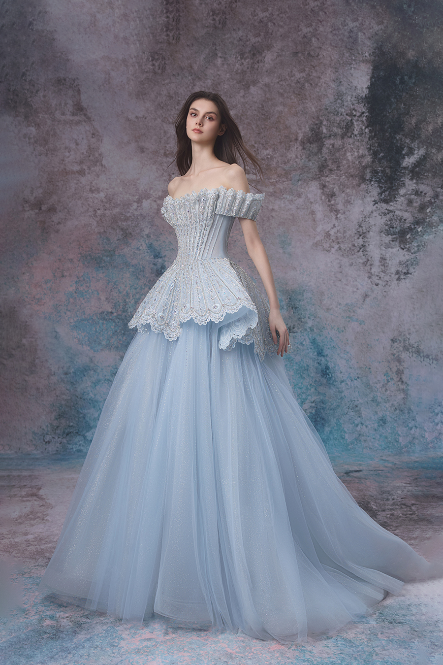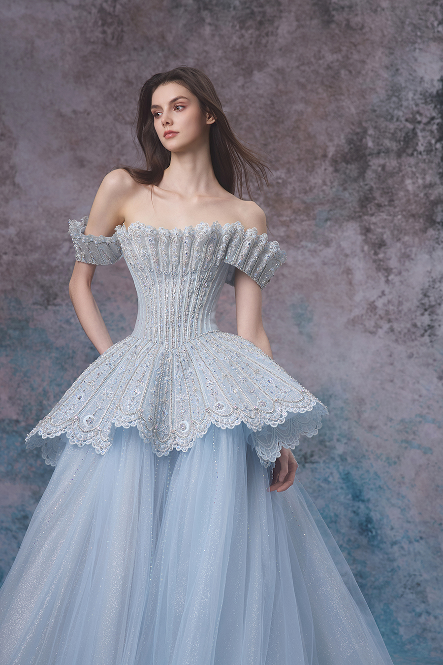Elian's inspiration comes from the tranquil illusion of the interweaving of tides and moonlight, embodying the tenderness and romance of the ocean. A straight shoulder design with a cinched waist and fluffy skirt, showcasing a noble and elegant look. The structural craftsmanship adopts three-dimensional cutting, accurately shaping the body shape curve. The fishbone support makes the upper body firm and stylish, and the skirt support supports the full silhouette of the skirt. The upper body and waist are made of stiff and shiny fabrics, embroidered with exquisite patterns using hand push embroidery techniques, combined with hollow craftsmanship to add agility, and decorated with hand sewn beads, resembling the shimmering waves of tides; The lower skirt is made of multiple layers of fine shimmering chiffon, and the skirt hem shimmers with a faint light. The lace lace is like waves lightly blooming. The overall design is like the whispers of the tide, perfectly interpreting the ethereal and gentle beauty of the ocean, showcasing its dreamy charm.