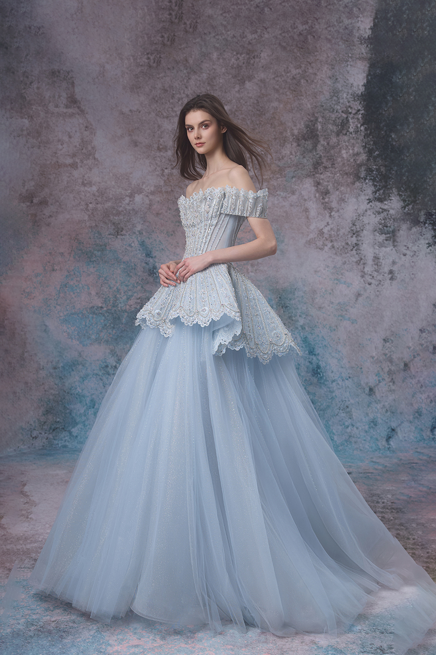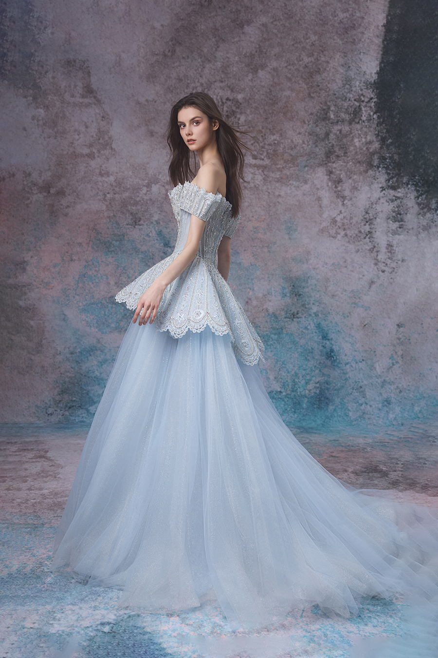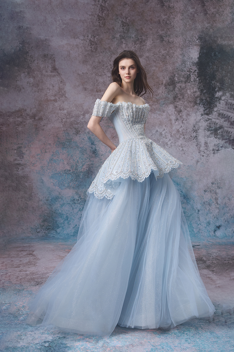 Elian's inspiration comes from the tranquil illusion of the interweaving of tides and moonlight, embodying the tenderness and romance of the ocean. A straight shoulder design with a cinched waist and fluffy skirt, showcasing a noble and elegant look. The structural craftsmanship adopts three-dimensional cutting, accurately shaping the body shape curve. The fishbone support makes the upper body firm and stylish, and the skirt support supports the full silhouette of the skirt. The upper body and waist are made of stiff and shiny fabrics, embroidered with exquisite patterns using hand push embroidery techniques, combined with hollow craftsmanship to add agility, and decorated with hand sewn beads, resembling the shimmering waves of tides; The lower skirt is made of multiple layers of fine shimmering chiffon, and the skirt hem shimmers with a faint light. The lace lace is like waves lightly blooming. The overall design is like the whispers of the tide, perfectly interpreting the ethereal and gentle beauty of the ocean, showcasing its dreamy charm.