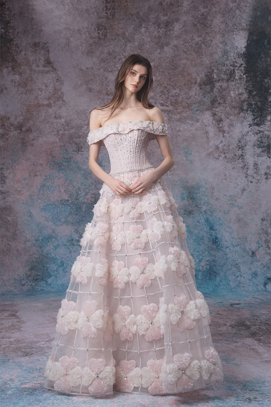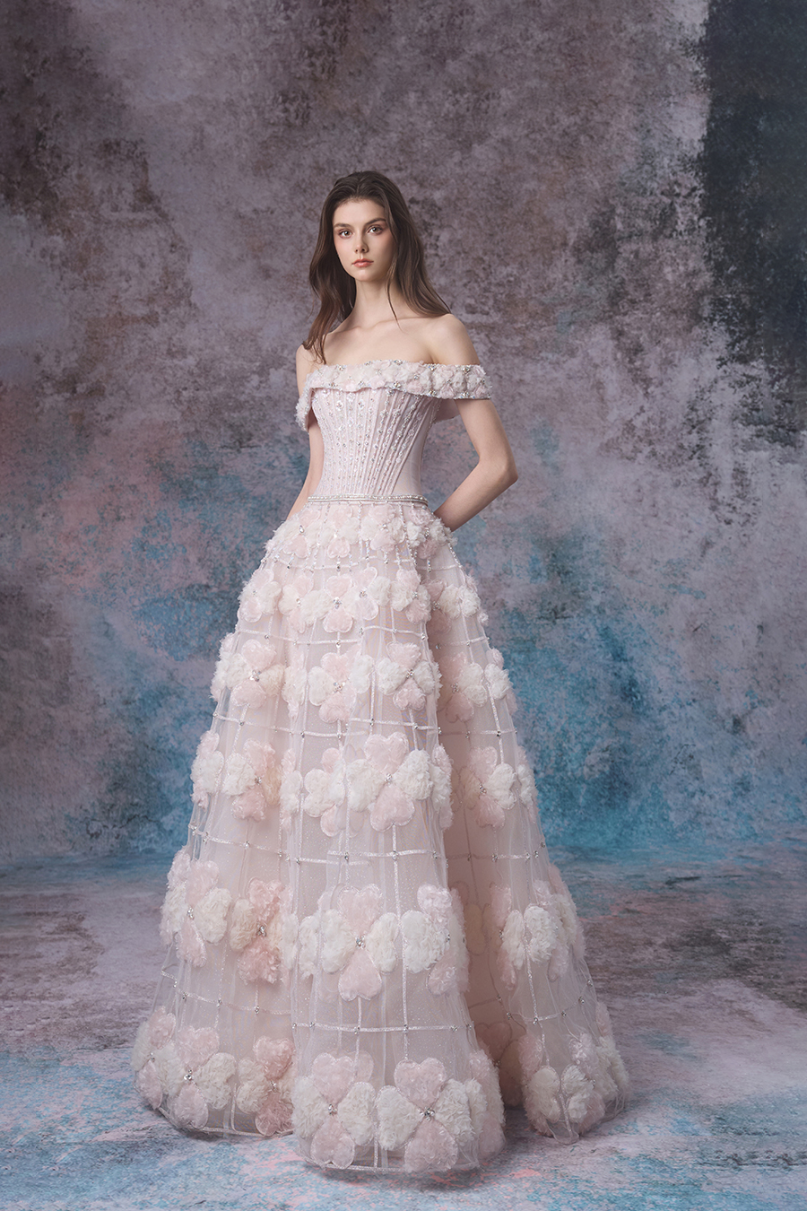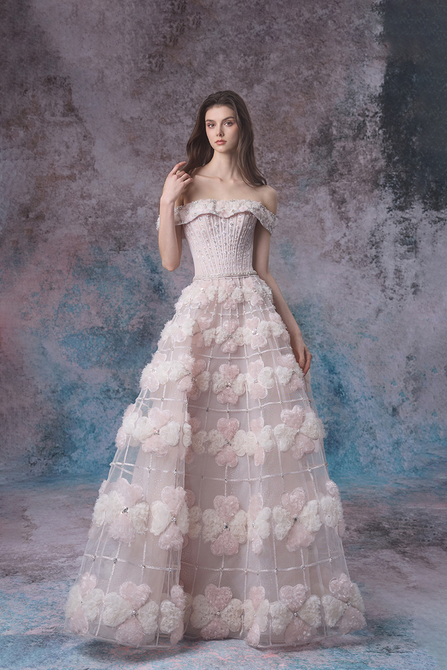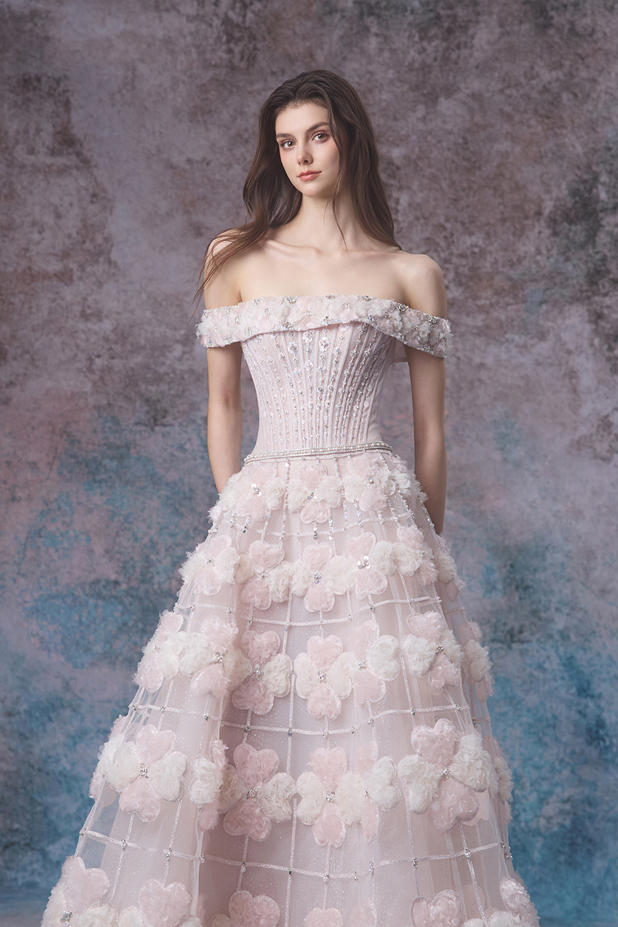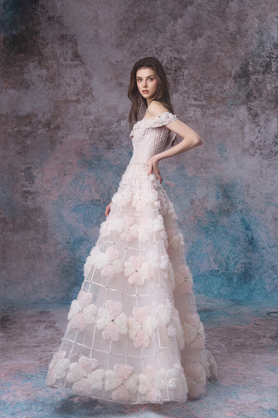 Gwen's inspiration is cleverly drawn from the stunning scene of flowers swaying with the waves during the tides. The simple one shoulder design delicately outlines elegant shoulder lines, while the fluffy A-line skirt spreads out freely, creating a dreamy and romantic atmosphere, just like the gentle state when the tide surges. The upper body is embroidered with delicate patterns using hand push embroidery techniques, and then carefully sewn with beads for embellishment, shining and agile; Adding three-dimensional flowers and exquisite car stripes on the thin veil of the lower skirt, the four leaf clover shape is presented through fabric reconstruction technology, which is unique and ingenious. The decorative craftsmanship is at its peak, with the entire skirt (including the upper and lower skirts) densely covered in three-dimensional elements, as if dancing gracefully in the tide; The flowers are adorned with delicate sparkling diamonds, like sparkling waves. The light and thin gauze fabric is complemented by flowers and sparkling diamonds, with light pink and light champagne colors chosen to perfectly blend the agility of the tide with the beauty of the flowers. Wearing it, it feels like a flower fairy gracefully arriving from a tidal dream, exuding a gentle and charming charm.