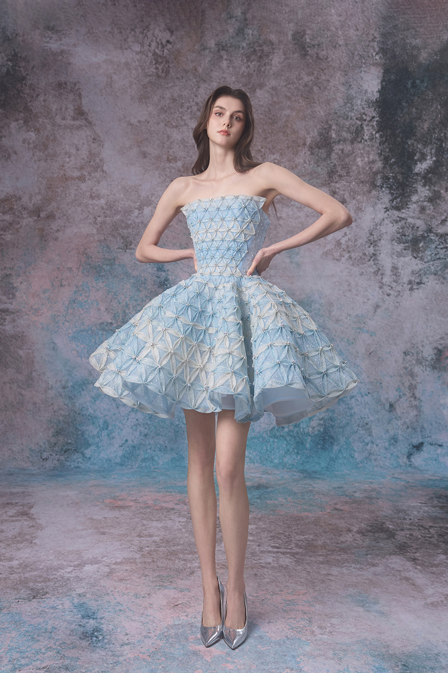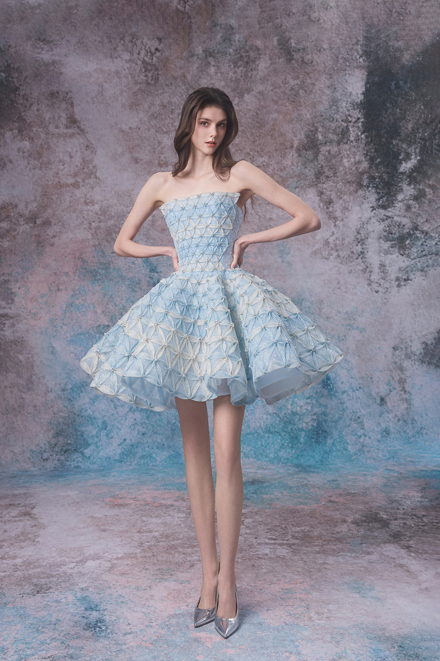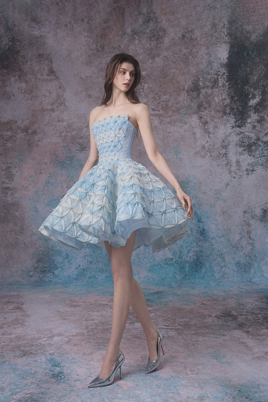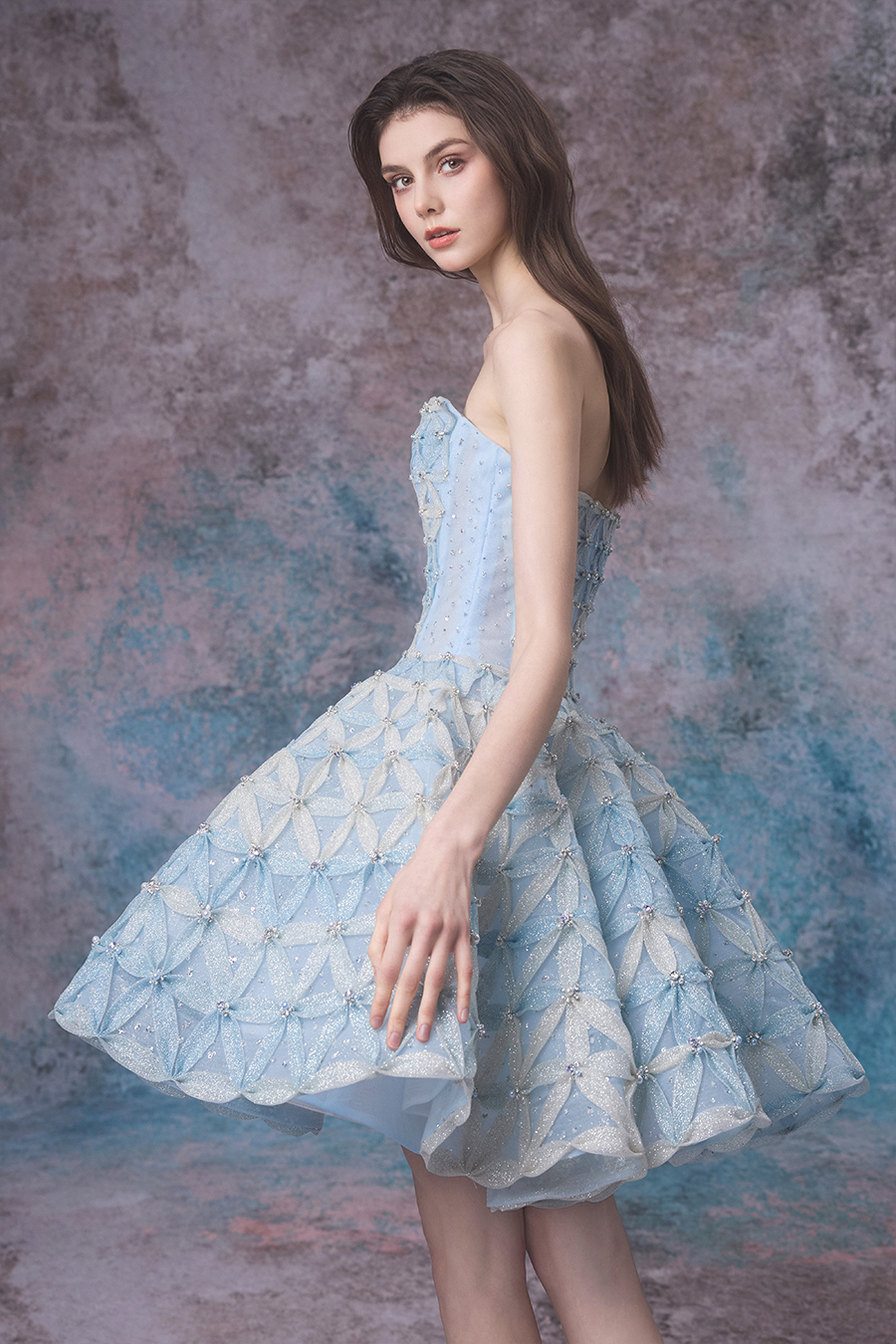 As the night falls, the sea turns into a serene mirror, and the tides and moonlight quietly meet, creating Nytherissa together. The whole piece is made of imported shiny fabric, with gradient blue and white colors on top, simulating the color transition of tides. The structure is a strapless short skirt, playful and elegant. The structural technology adopts three-dimensional cutting, fits the body shape, and the built-in skirt support makes the skirt fluffy like waves. The lower skirt is wrapped in shiny fabric with elastic mesh of different sizes, manually fixed into petal shapes and then combined into the entire skirt. The triangular thin gauze splicing creates a visual effect of petal shapes, resembling the texture of tidal surges. At the same time, the entire dress is handcrafted with sewn beads, embellished with small beads that shimmer like sparkling waves. The dreamlike Nytherissa has become a source of inspiration for designers, cleverly captured and integrated into dresses, allowing the beauty of flowing tides to be forever frozen in the fabric of every inch.