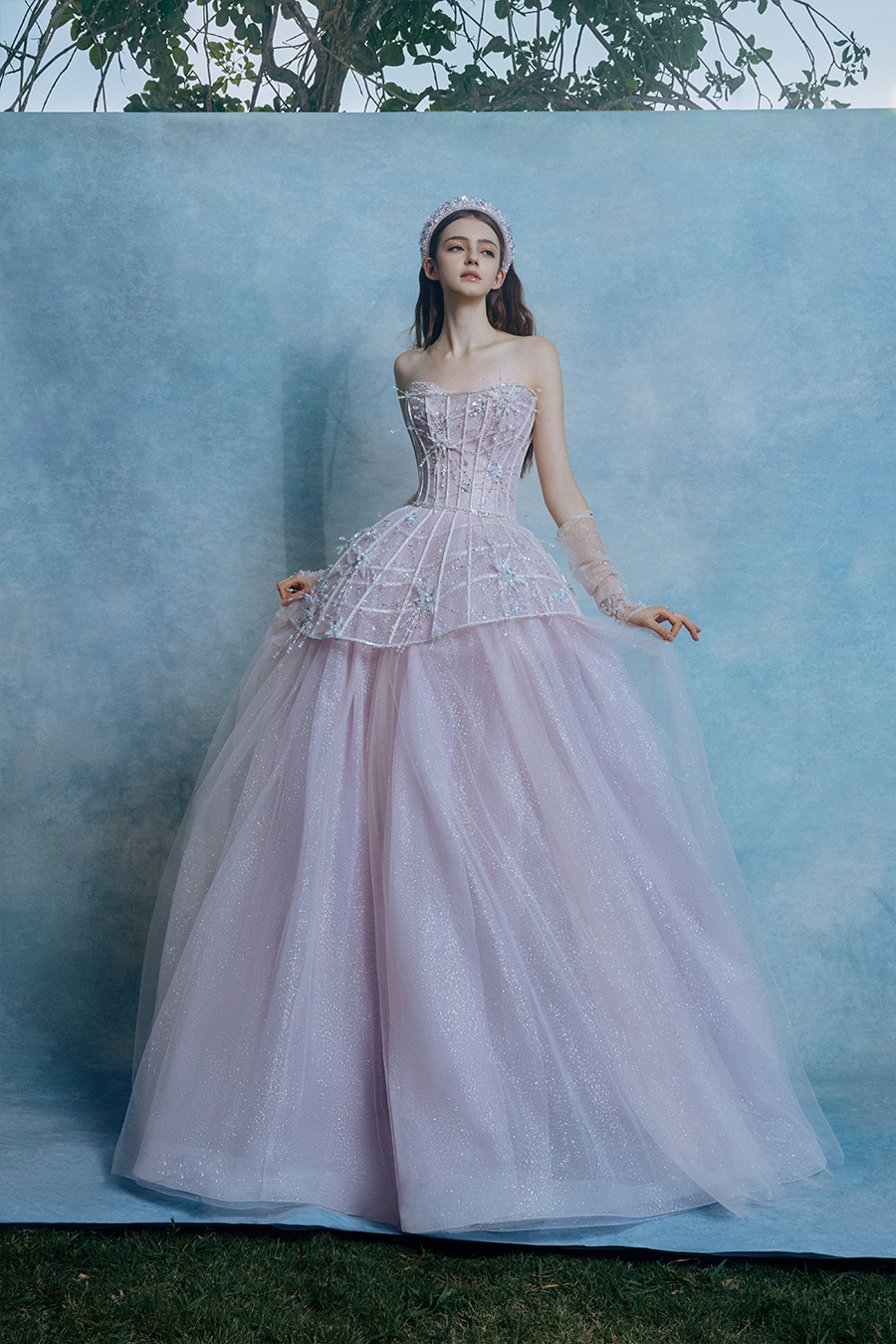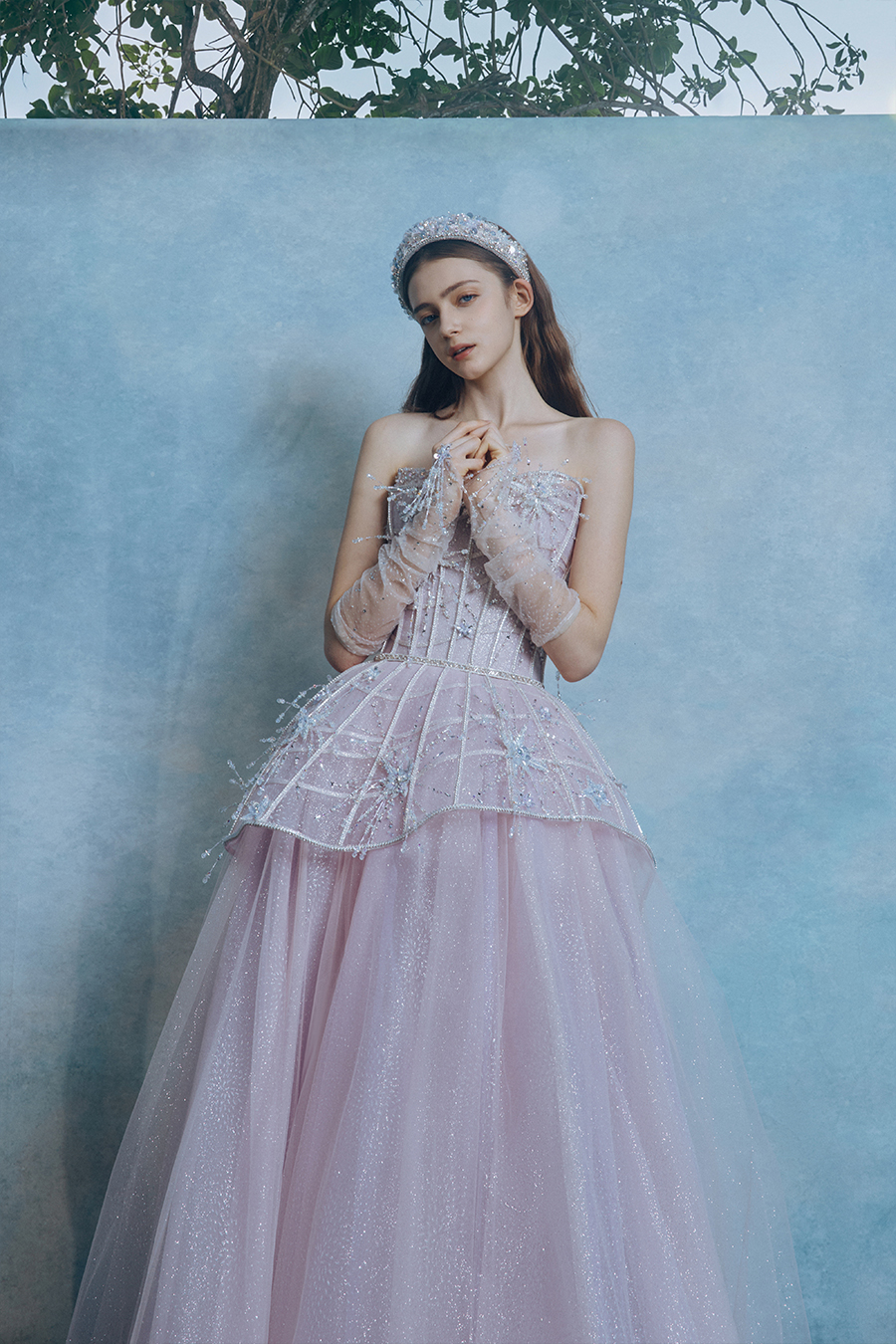 Close your eyes and imagine the surprise brought by Vladmira - the architectural geometric mesh constructs the topology of light, the strapless skeleton precisely bends and freezes the trajectory of light, and the transparent sleeves extend silently from the edges of the structure like light wings. The resolute three-dimensional cutting and soft gauze collide to create a poetic space, with layered skirts condensing the floating feeling of cloud fluff in the architectural silhouette, and the rhythmic support hidden between the pleats. The decorative technique uses three-dimensional bead embroidery to embellish the intersection points of the grid, with star shaped crystal diamonds resembling shattered light particles in the morning mist. The bead lines radiate from the torso to the sleeve arms, resembling gilded marks cast by time on the skin. The light cherry pink gauze is like a soft morning mist, with layered folds capturing the layered variations of light and shadow. When walking, the crystal diamond dances with the gauze, and fragments of light float and swim in the folds of time and space, freezing dreams into wearable poems.