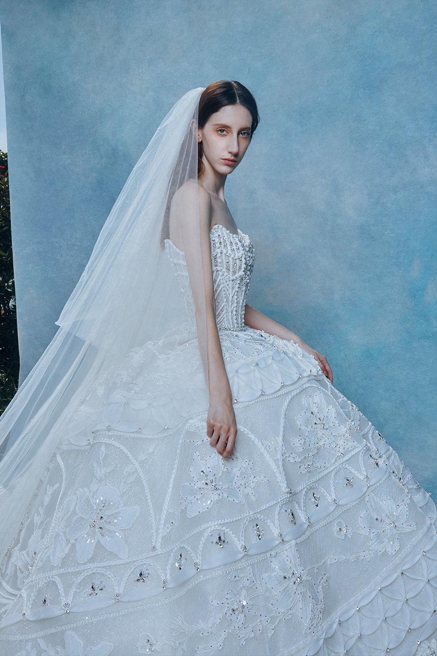 The design concept of this main veil is to make the bride the most beautiful presence at the wedding, showcasing Roswea's elegance and unique personality. Stereoscopic cutting reconstructs the prism matrix of light through geometric pleats, and the waistline refines the sharp curvature of the light cutting edge, forming a tension rhythm of rigid and flexible game with the fluffy pleats of the cloud skirt. The decoration process adopts three-dimensional bead embroidery - crystal diamond inlay and lace patterns interweave to create a phantom scene of star shavings falling into the sea of light. The randomness of wind marks is condensed between the folds, and the phantom spectrum of liquid light spots bursts out when walking. Matte satin and transparent yarn are layered to depict mist breathing, and a pure white base is transformed into a liquid canvas to record light marks. The long veil hanging down is like a light curtain or mist, and together with the three-dimensional patterns of the skirt, it creates a poetic temple of temporal and spatial folds.