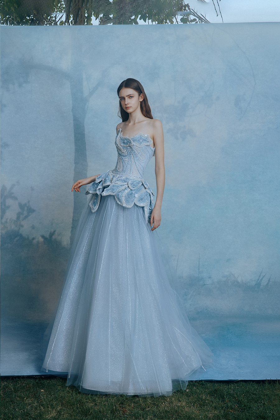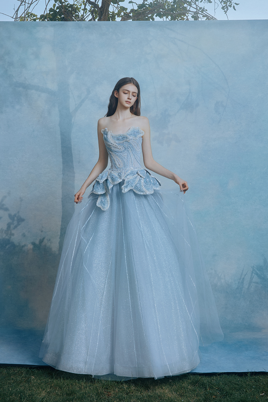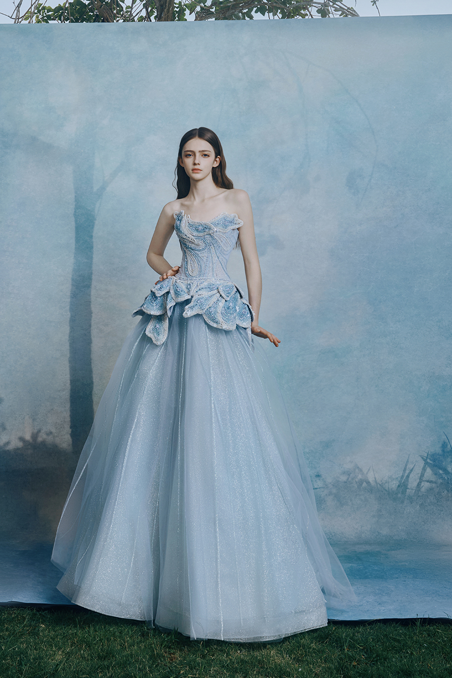 Francene is a ray tracing practitioner. The layered paisley pattern on the strapless side depicts the folds of light and shadow through geometric deconstruction. The petals at the waist are folded like morning wings, and the sturdy bone lines support the misty skirt, creating a tension poetic realm between architectural rigidity and fluid softness. The decorative technique reconstructs the Milky Way through three-dimensional bead embroidery - bead embroidery and crystal diamonds arranged in a spiral pattern, resembling the path of a star's light cutting through the morning mist. The body's rhythm reflects the illusionary spectrum of liquid metal, condensing the scattered diamonds into an eternal emblem. Mist blue fabric absorbs the breath of light through gradient blending, layering transparent yarns like folds in time and space. The transition from pure white to light blue transforms into a dreamy canvas painted with light traces, making walking a lyrical narrative of light and shadow.