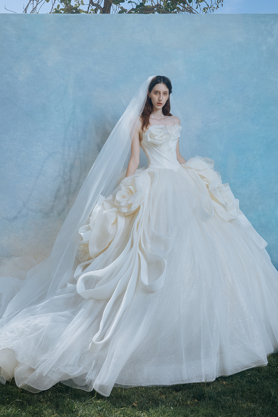 Garnetta interprets the quantum radiance within women through architectural tension. The architectural bone lines outline the arc of moonlight pouring down, and the folds of the chest line flow like liquid light marks, accurately supporting the fluffy silhouette like clouds. The eternal tension of light and shadow game is constructed between the rigid and flexible cuts. The decorative technique involves manually shaping pleats to solidify giant satin flowers, layering petals like solidified moonlight flowers, and flowing ribbons like a river formed by a beam of light, giving the wedding dress a narrative rhythm of temporal and spatial flow. The luster of ivory white brocade interweaves with the hazy glow of organza, and the subtle flashes hidden between the folds are like morning stars breaking through the mist, like scattered diamond spots overflowing from the folds of time and space. The design replaces flat embroidery with three-dimensional shaping, weaving the flowing morning light and solidified moonlight into a wearable romantic narrative through the sculptural feel of the fabric itself.