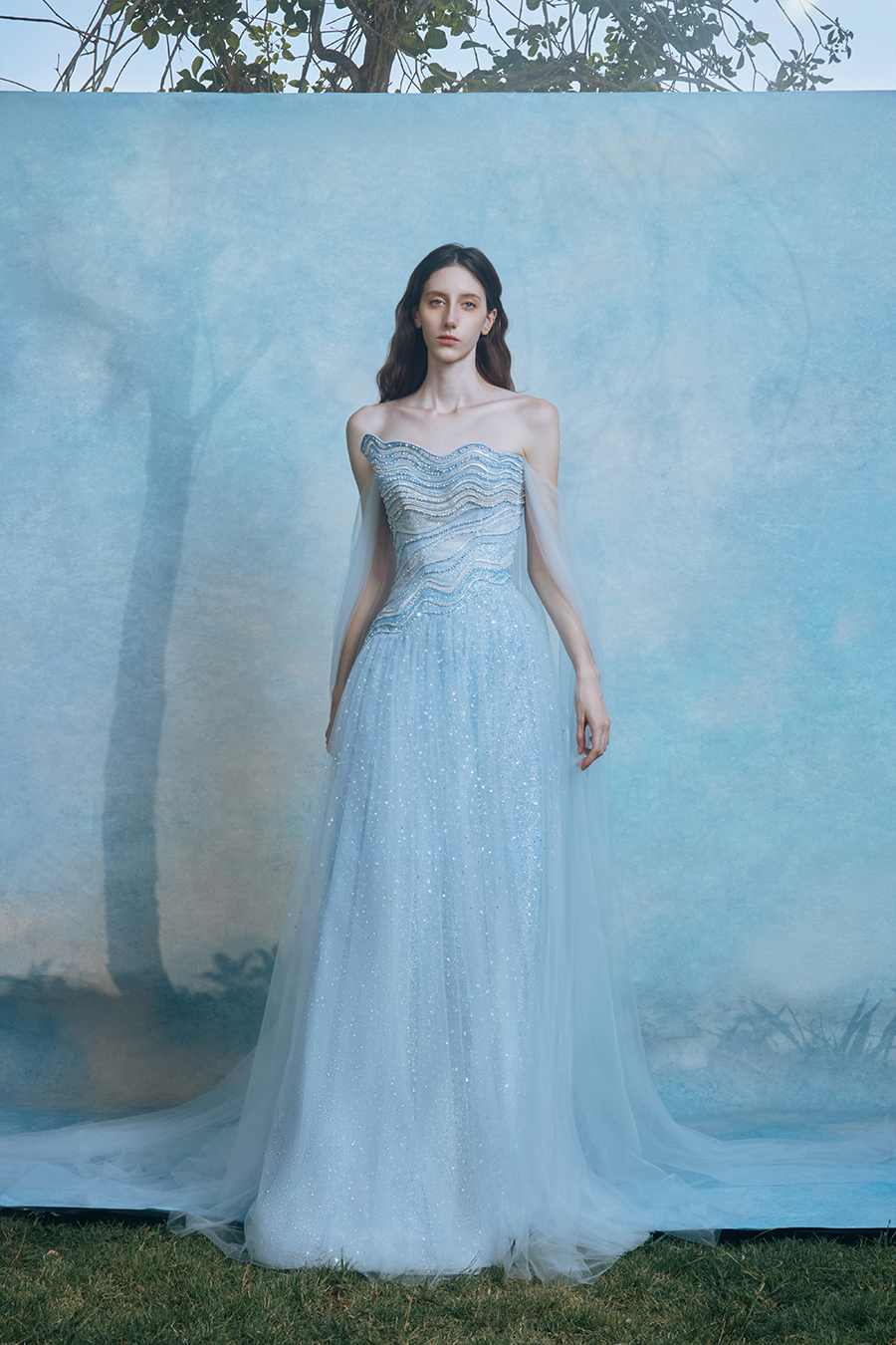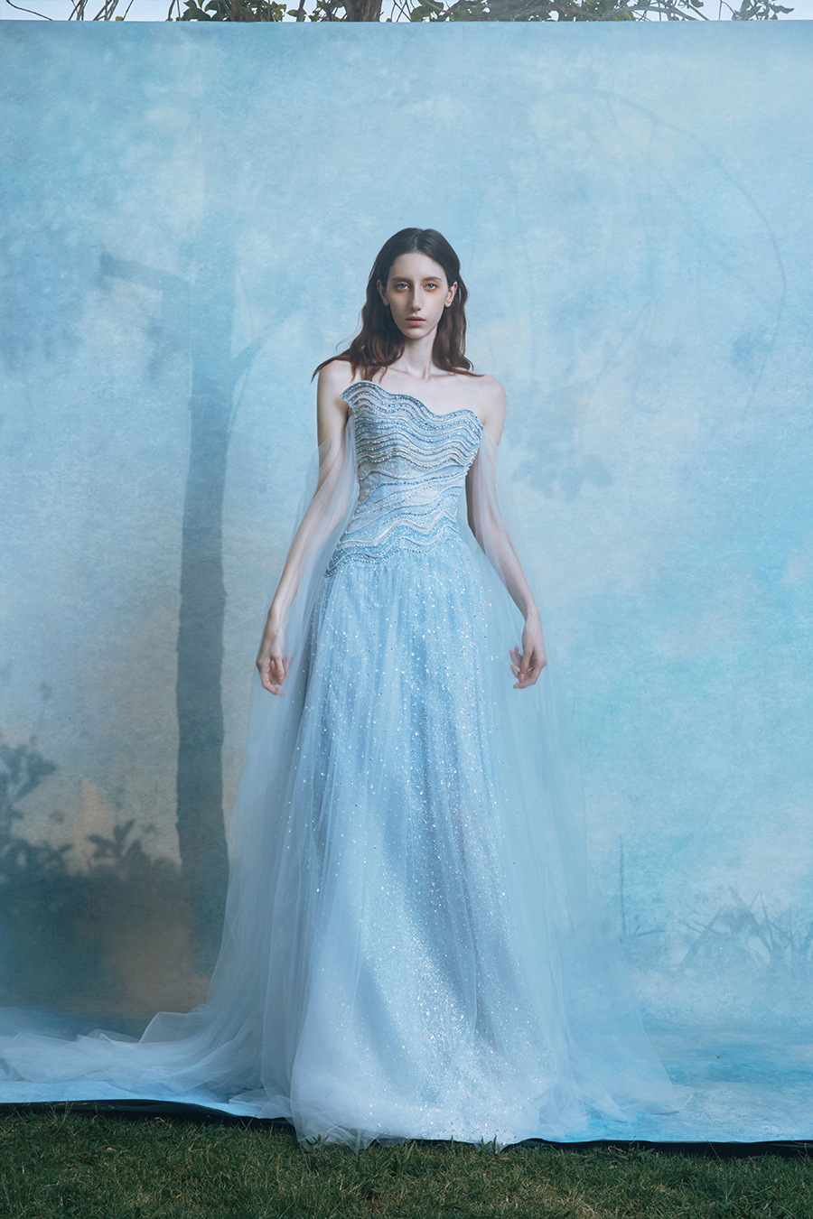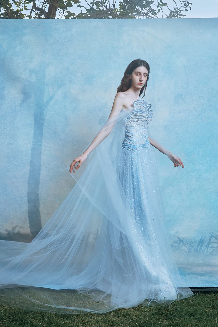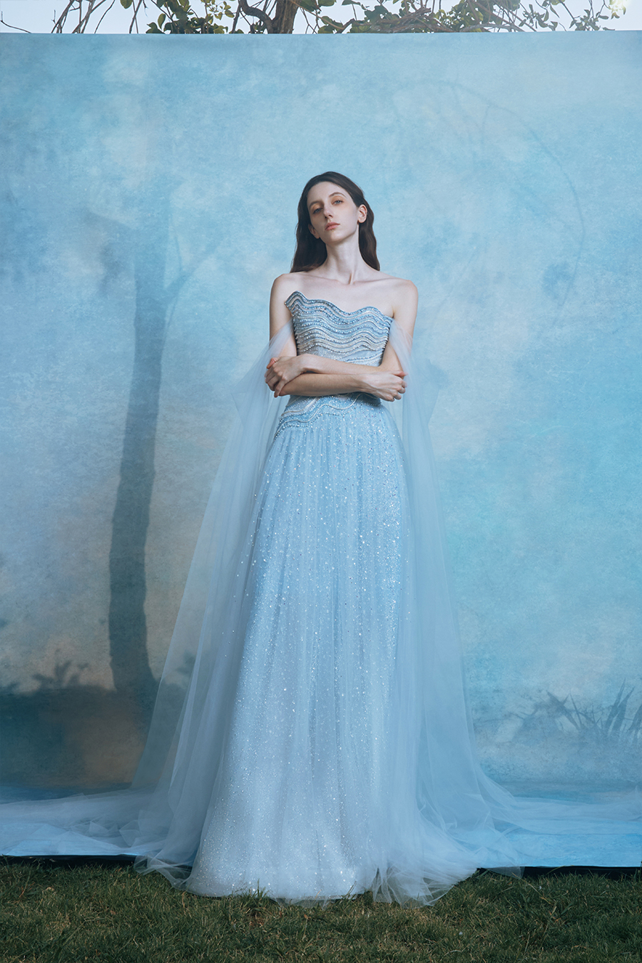 Vaudree is every brilliant and unique you in the galaxy of time. The wavy bead embroidery on the strapless area outlines the flow trajectory of light, while the sturdy bone lines support the misty silhouette of the thin gauze skirt, creating an eternal field of light and shadow game between the edges and soft arcs. The decorative technique uses three-dimensional bead embroidery to condense the fragments of the Milky Way - gradient sequins pour like star dust onto the light blue screen, crystal diamonds capture the eternal moments of light and shadow vibration in irregular arrangements, and the rhythm of the Milky Way pours in with every step. Glacier blue gauze material uses the technique of layering to render the hazy texture of unmelted morning mist. The pleated layers are like folds in time and space, sealing the breathing pulsation of light penetration, transforming the body into a poetic line of time and space that travels upstream, reciting the illusion of light while walking.