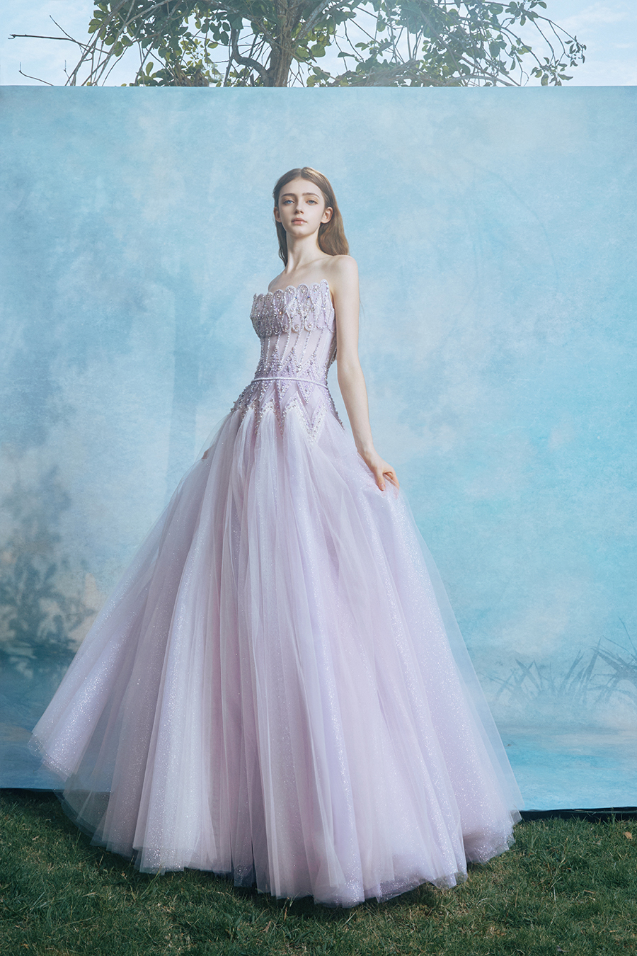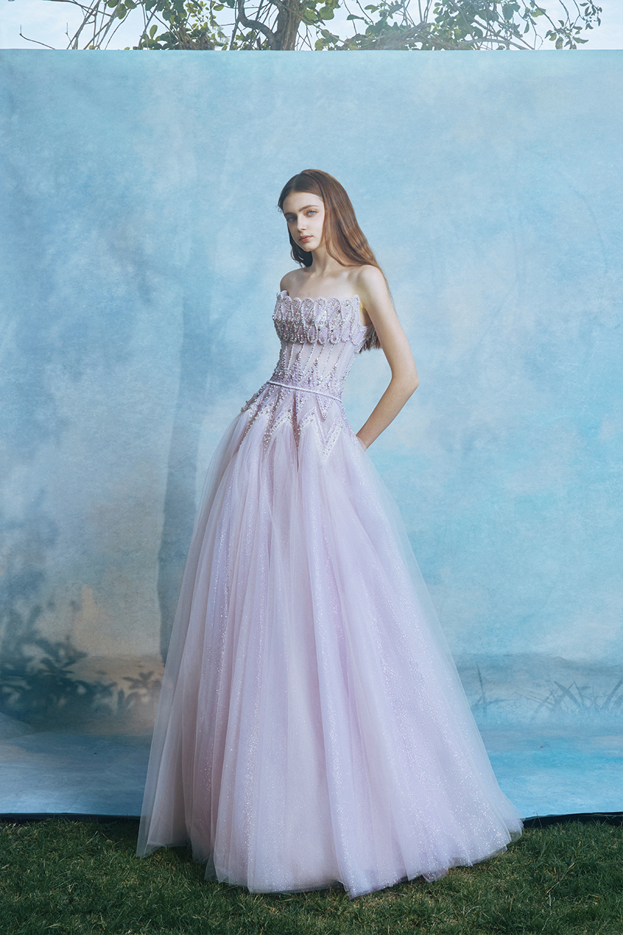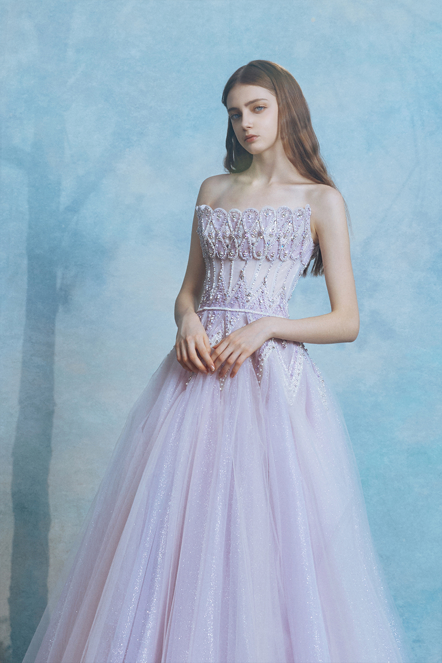 Tylwenna is created by cutting and solidifying the shape of flowing light, and using bead embroidery to trace the latitude and longitude of the illusion, making the body a flowing sculpture that carries memories of light and shadow. Starting from the strapless figure, the geometric diamond grid on the chest and the soft arc around the waist engage in an aesthetic game. The resolute bone lines support the floating feeling of the cloud veil skirt, constructing a tension field of light and shadow interweaving between the torso and space. The decorative technique uses three-dimensional bead embroidery to reconstruct the Milky Way - amethyst bead decoration gradually spreads along the body curve, with fine sequins like scattered diamond spots wandering through the warp and weft of the thin gauze, and the sparkling rhythm of the Milky Way pouring out as the footsteps flow. The misty purple gauze captures the vibration of light through the technique of layering, with layers of folds resembling the folds of time and space. It seals the breath symphony of the morning light and the night star shavings, transforming the body into a romantic container carrying memories of light and shadow.