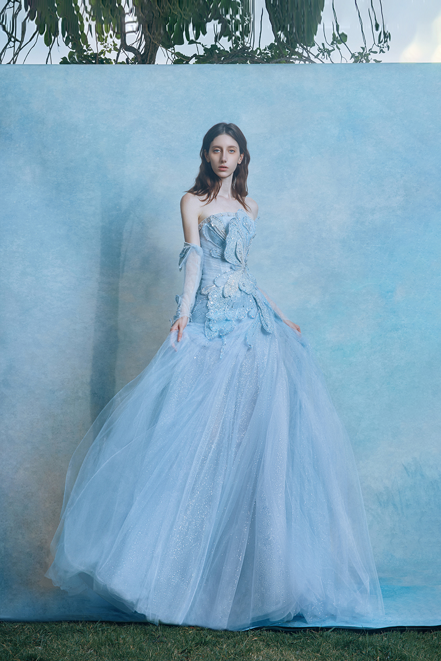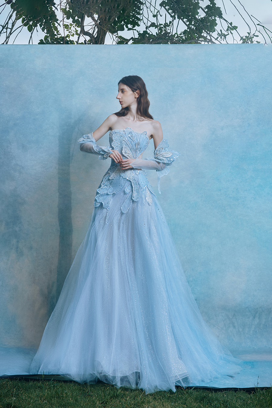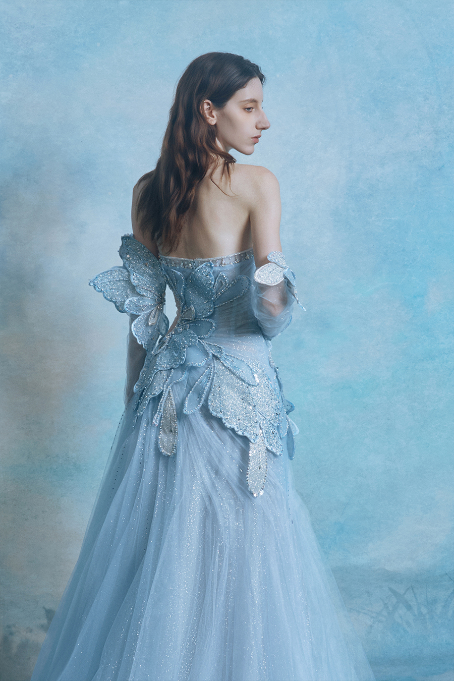 Taking "Butterfly Wings Chasing Light" as the inspiration core, Marella condensed the fleeting changes of light and shadow into a symphonic chapter of architectural aesthetics. The three-dimensional cutting depicts the instantaneous curvature of butterfly wings breaking through cocoons, with the hollow waistline and extended wings forming a tension structure that combines reality and virtuality. The sturdy skeleton supports the cloud and mist folds of soft gauze, resembling a discourse field of light and shadow coexistence. The light transparent sleeve covers the arms like a half spread butterfly membrane, and the layers of thin gauze conceal the path of light's movement. The decorative technique uses three-dimensional bead embroidery to outline the main veins of butterfly wings, and crystal diamonds condense at the intersection of the veins like dewdrops. They refract the star shaped broken diamond light effect according to the angle of light, just like the phantom of flapping wings in the morning mist to freeze the trajectory of light. The light blue fabric is blended with a clear sky color, and the skirt is layered with translucent gauze to create a misty texture. The light and shadow flow between the folds, weaving a dynamic butterfly wing poem.