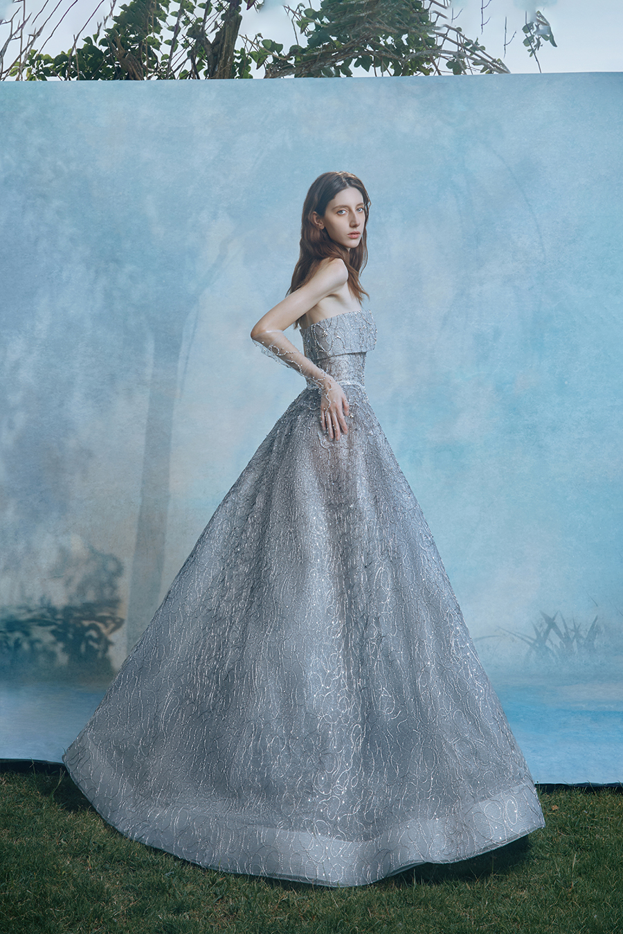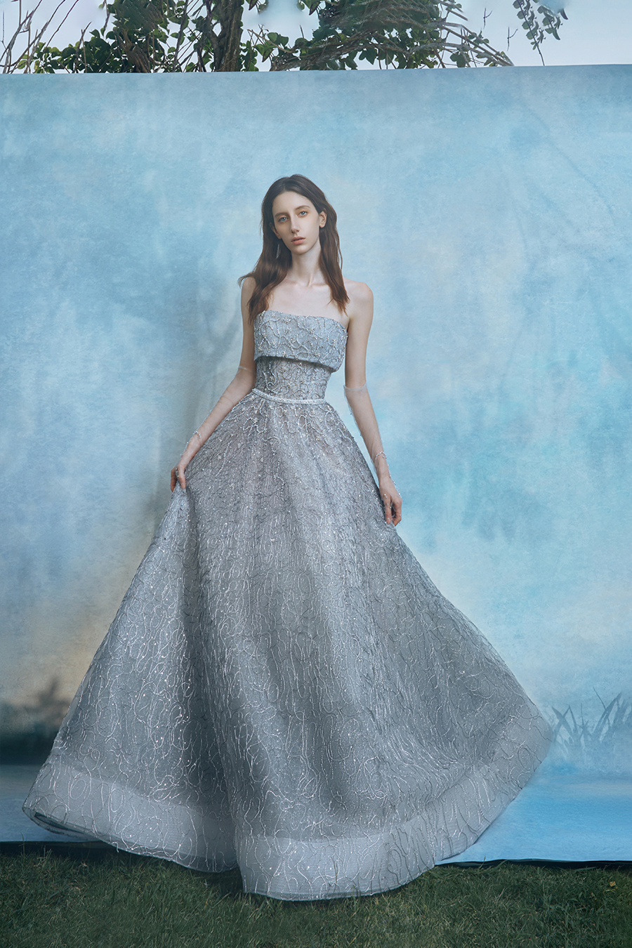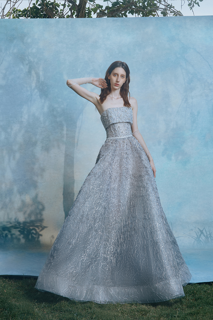 Harlow's inspiration comes from the beauty of grey tracing light. The designer uses architectural deconstructionism as a brush stroke, using precise cutting to outline sharp contours like light blades. The fine pleats around the waist are like ripples of light, cascading and spreading, forming a rhythm of tension balance with the fluffy skirt. The resolute cutting and soft misty gauze together create a philosophical atmosphere of dialectical light and shadow. In the decoration process, silver gray silk thread is embroidered with gradient density wave patterns, and crystal diamonds are like star shavings condensed on the texture, creating a dynamic illusion of liquid light marks that flow with the steps. The sheer veil spreads like morning mist, creating a hazy poetic realm of light and shadow while walking. The same colored sleeves extend the boundaries of dreams like tentacles of light, making the body a narrative carrier interwoven with light and mist.