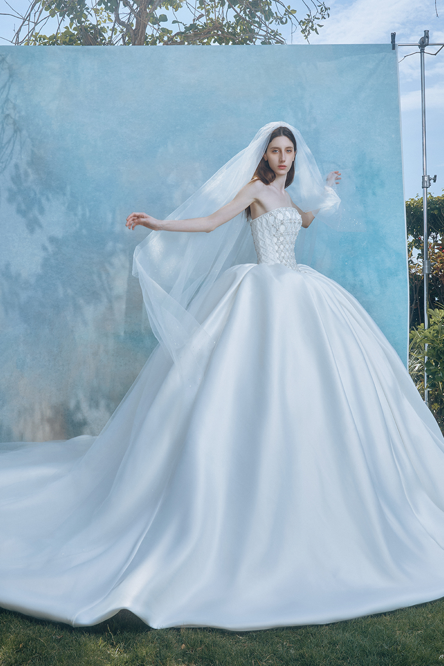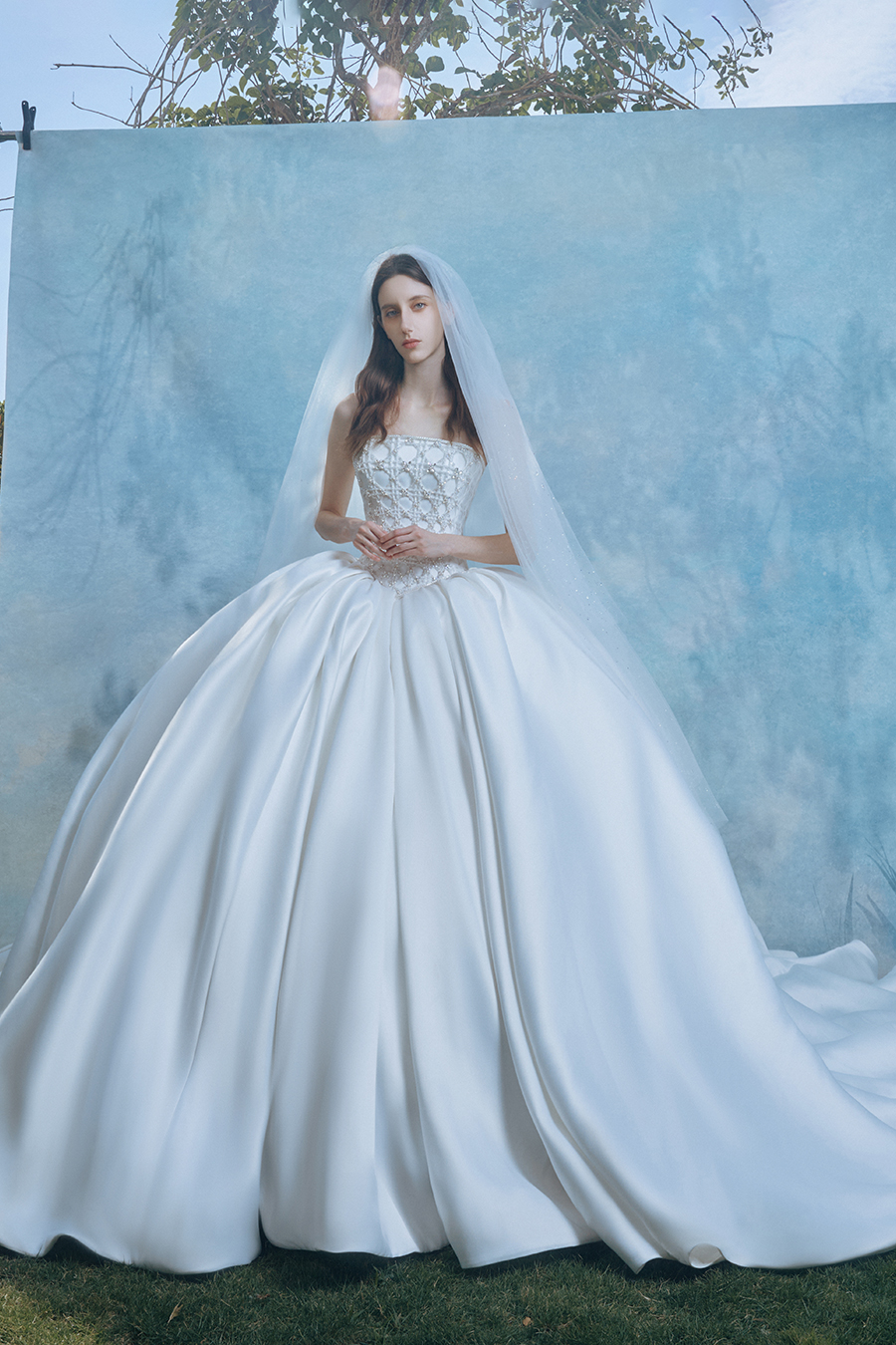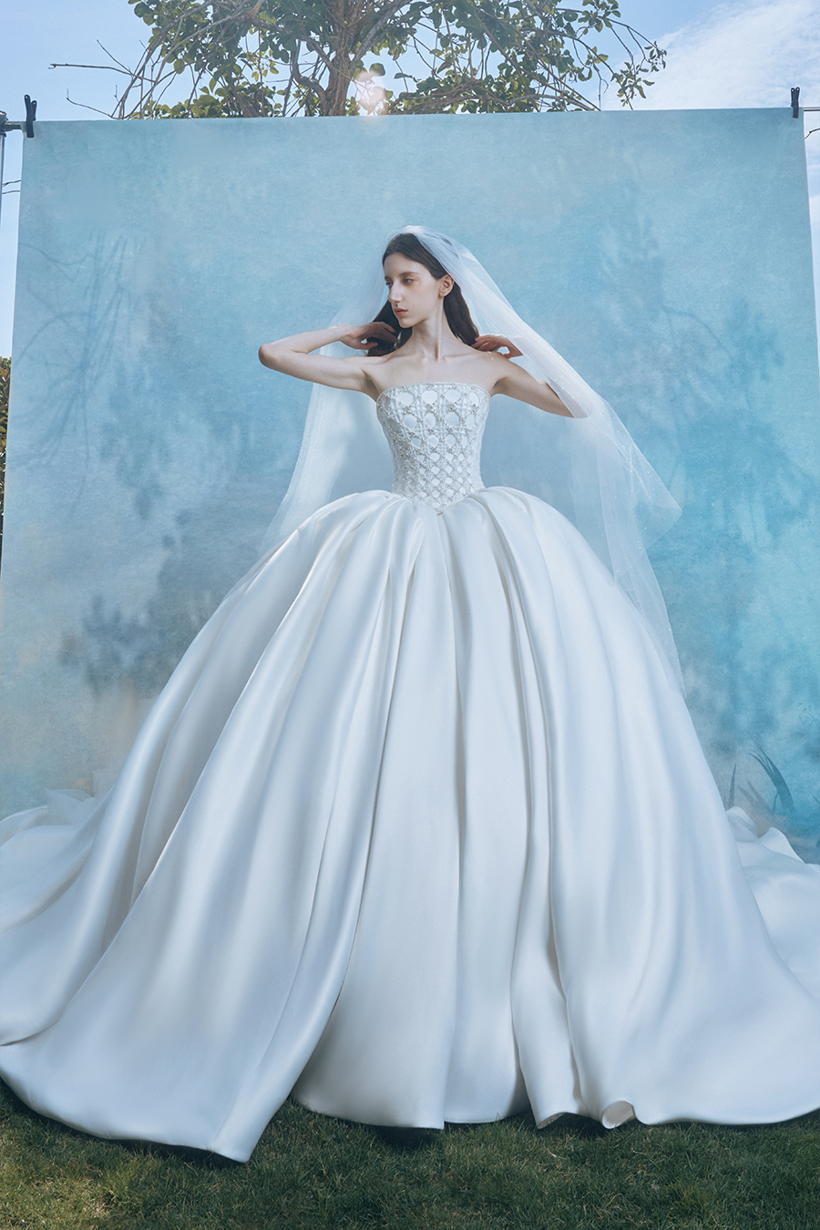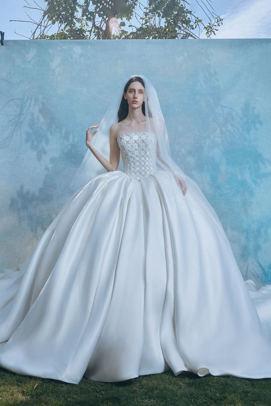 Winnika represents women who love life and have inner sensitivity. Standing up with a strapless figure, the upper body is intricately cut with diamond patterns to create a three-dimensional relief of the matrix of light. The stiff bone lines support the cloud like voluminous skirt, creating a dramatic game between geometric tension and soft contours, like an eternal dialogue between light and shadow. In the decoration process, the intersection of grid patterns is embellished with crystal diamond shimmer, like the morning sun shattering the starry remnants of the dark night. The pearl hair accessories and necklaces echo each other, reflecting the sparkling poetic traces of the traveler's footsteps. Satin carries the flow of light and shadow with matte lines of moonlight pouring down, pure white tones like an unwritten dream canvas, and pleated layers like strings of light, capturing the subtle vibrations of light penetration while walking, making the body a romantic container that solidifies time.