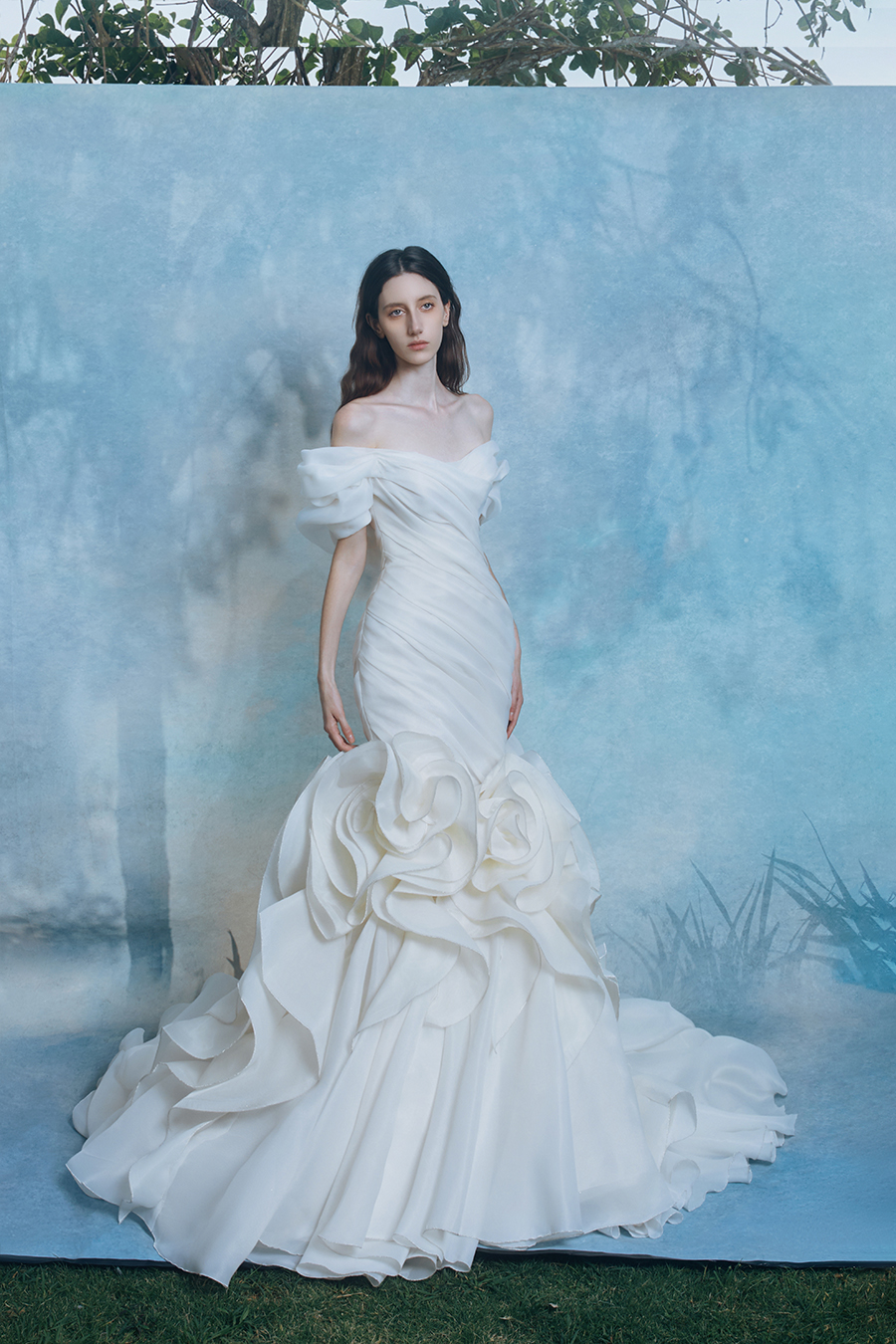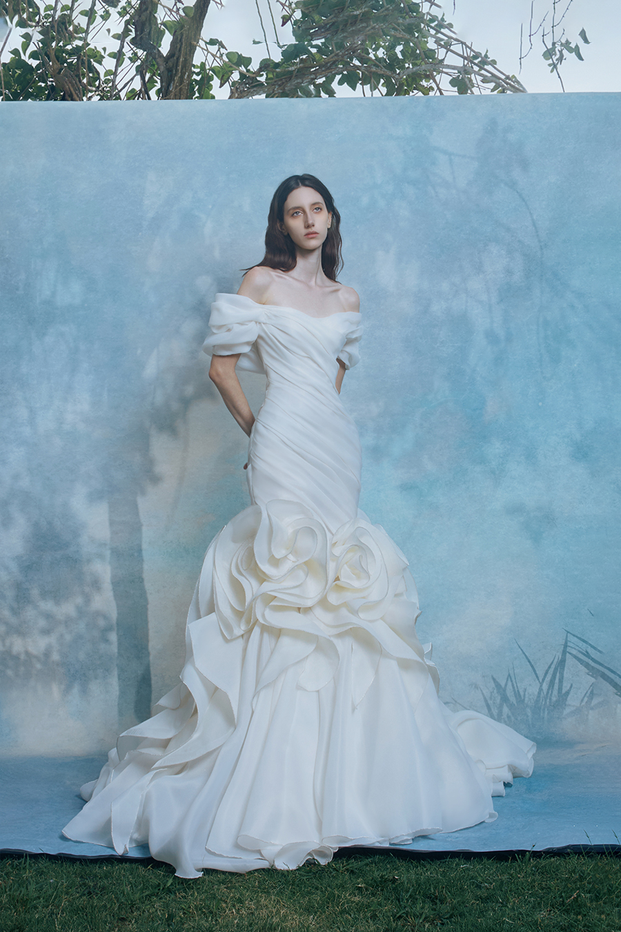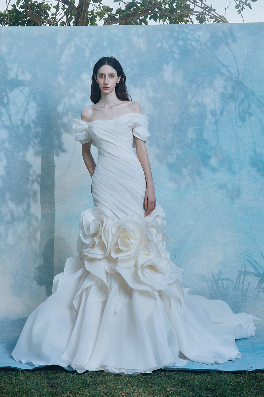 Each pleat on Ludovica's skirt is a light and shadow annotation of female power. The structural craftsmanship uses architectural grade pleat stacking technology to carve out the layers of light. The cloud pleats that rise up like soft mist on the shoulders are like liquid light marks condensed on the shoulder line. The fish tail shape is finely cut to create a sharp curve, and the combination of rigidity and flexibility creates a tension field of light and shadow game, giving the body and space a dynamic balance rhythm. The decorative technique abandons traditional embroidery and uses the fabric itself as a canvas to create clusters of three-dimensional roses. The layered petals sway with each step, resembling phantom flower shadows that solidify on the path of tracing light. The high-density satin brocade flows with a liquid metal like luster, and the pure white tone is both as pure as tracing the beginning of light and as eternal as the end of a dream. It completes the poetic resonance between light and material while walking, freezing the sense of flow in time and space into an eternal romantic narrative.