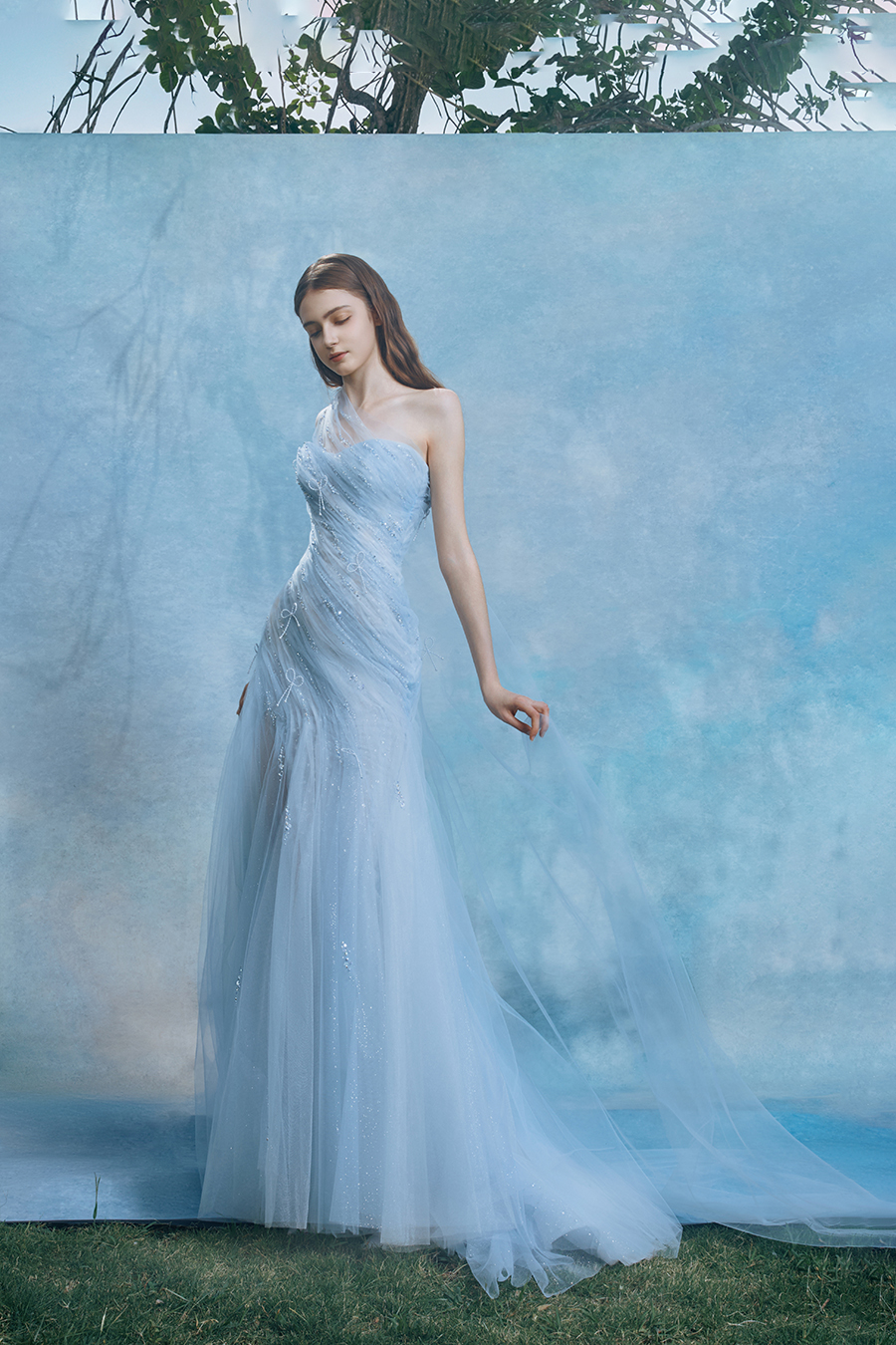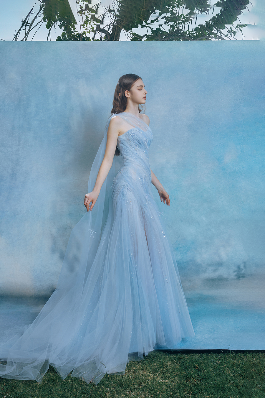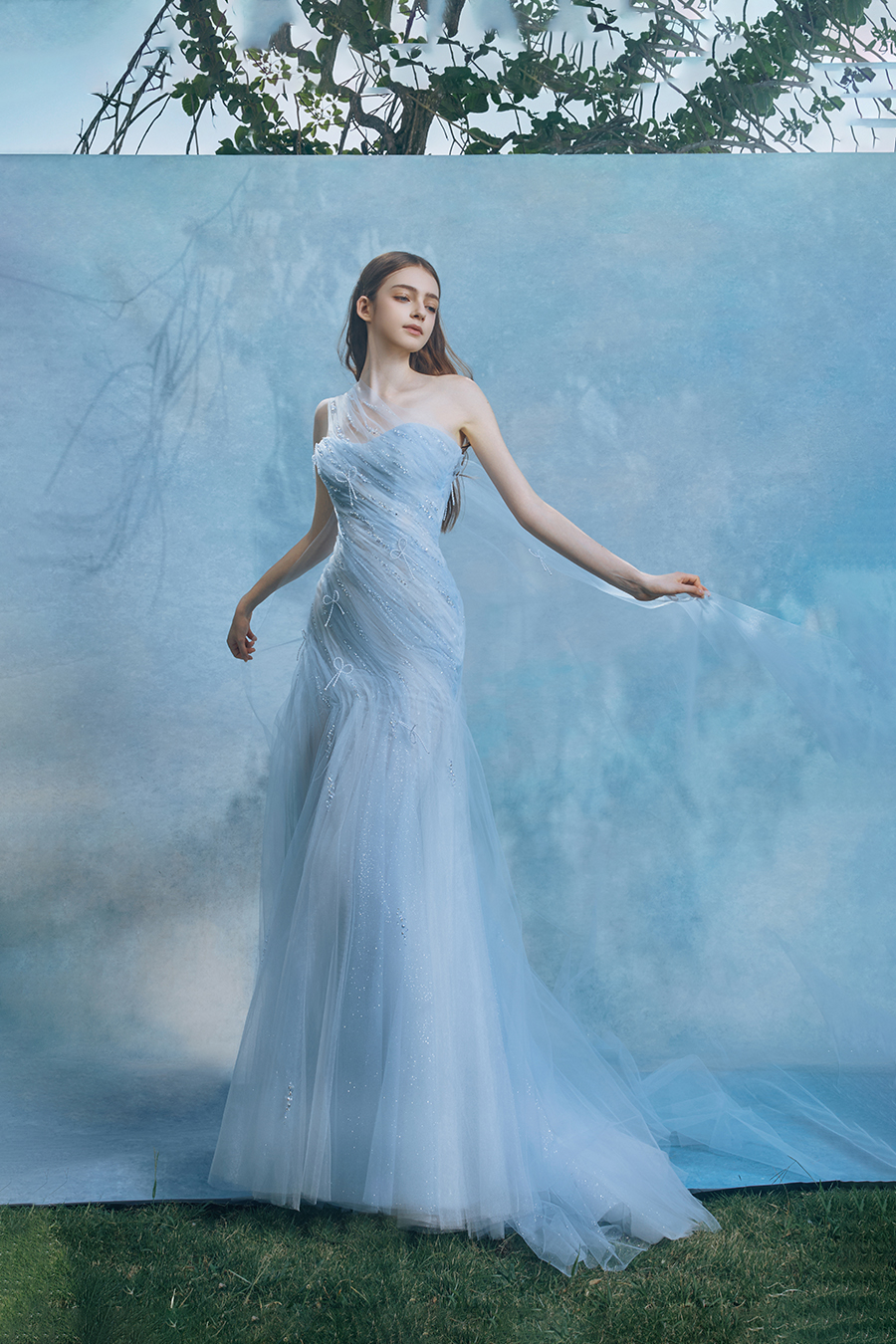 Veydriss was formed between the silence draped over one shoulder and the noise of flowing skirts. The single shoulder splits silently like a light blade, while the thin veil on the right hangs down like a transient solidification of mist cut open by the blade tip. The tight corset folds the waves of light with pleats, and the surging kinetic energy of the fish tail outline the rigid bone lines, weaving a spatiotemporal network of rigid and flexible games on the body's curved surface. In the decoration process, three-dimensional bead embroidery simulates the trajectory of star shavings falling into blue mist with fine bead decoration, and the illusionary color explosion of liquid light spots bursts out during walking, condensing the scattered shadows of tracing light into an eternal emblem. The light blue yarn material uses gradual layering to depict the penetration of light, and the high slit cutting makes walking a rhythmic incision of light cutting shadows. Walking is a narrative of time and space intertwined with light and shadow.