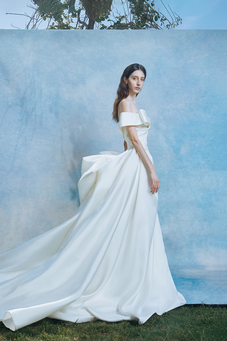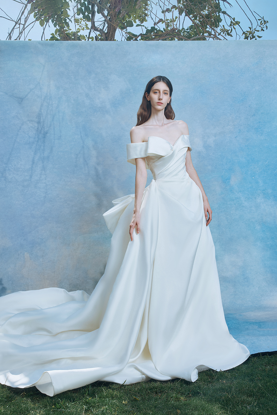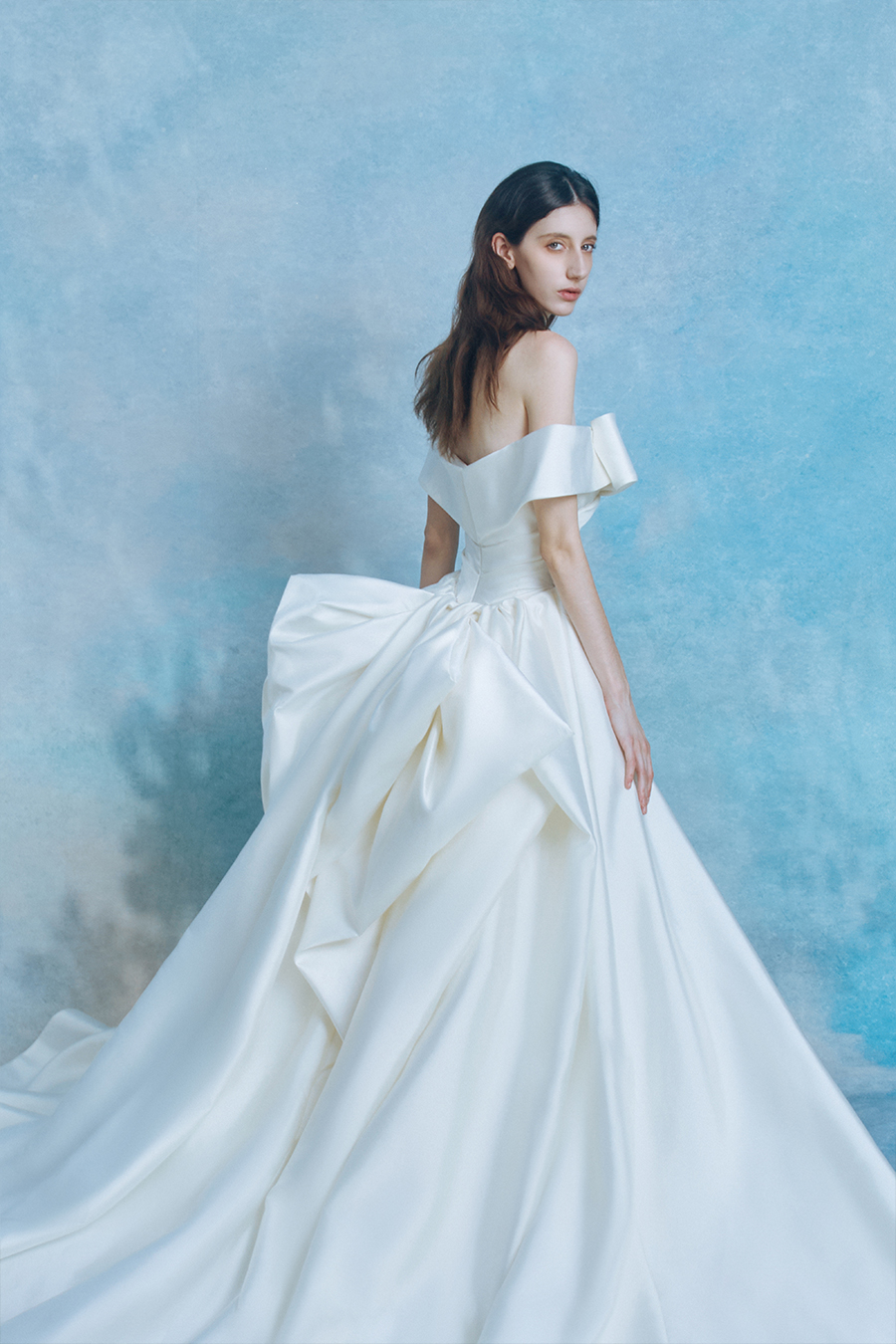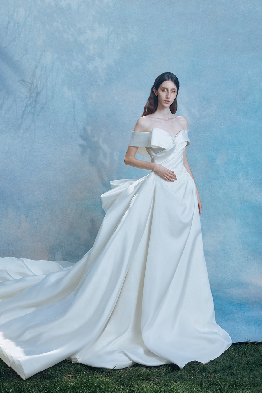Calveria perfectly embodies the origin of light in concrete form. The design reconstructs the flow trajectory of light and shadow through precise geometric creases, and the pleats on the chest and waist are like light bands crumpled by the wind, interpreting the balance aesthetics of tension and restraint on the body surface; The hem of the skirt is supported by architectural style volumetric technology to create a fluffy silhouette like clouds and mist. The stiff support and smooth satin interweave in a symphony of rigidity and softness, as if a silhouette of time and space is frozen on the path of tracing light. The decorative craftsmanship practices minimalism in sculpting light - without the need for embellishments, only using the creases and folds of the structure itself as light to write three-dimensional lines of poetry. High count taffeta flows with liquid moonlight like pearls, and its pure white color scheme is both a metaphor for the essence of light and a concrete expression of the purity of dreams, completing an eternal dialogue between light and material in the flow of steps.