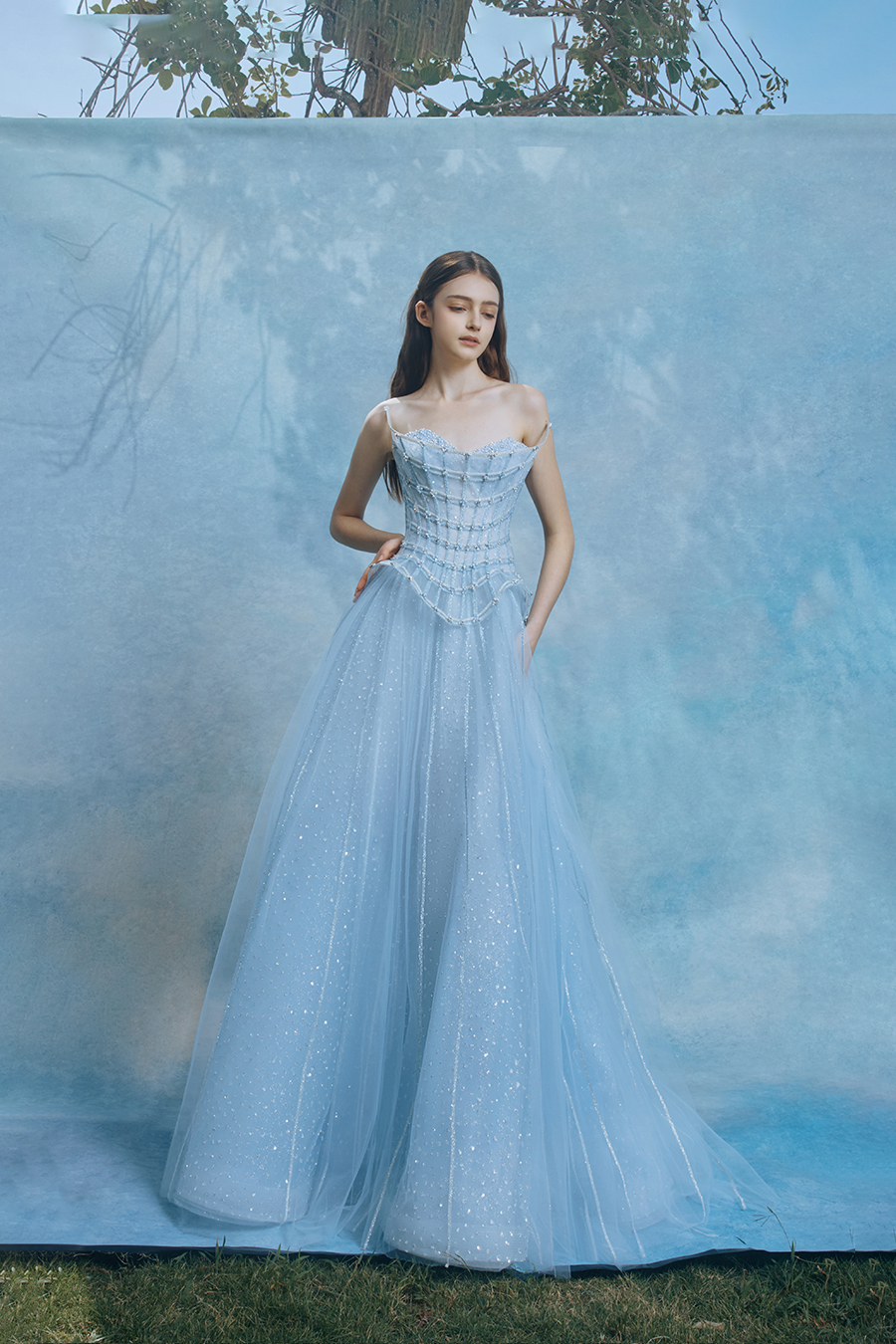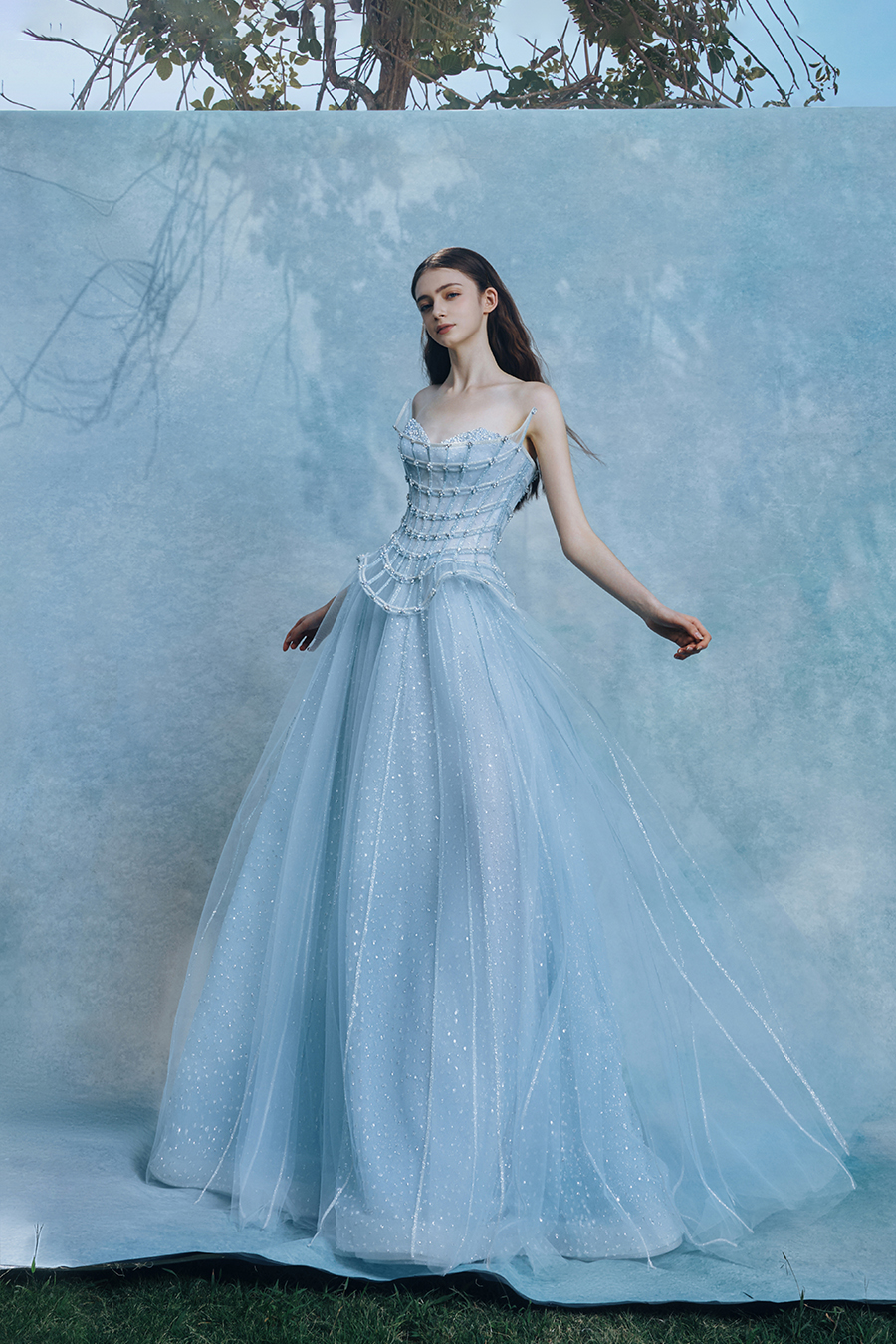 What style will the soft gauze and cloud gauze skirt look like when they meet? Sylvanaen is here to tell you. The upper part of the top adopts a unique fishbone structure, which can precisely fit the body curve. At the same time, it is wrapped in imported bright onion fabric, which has been meticulously hand woven and firmly fixed, successfully creating a visual effect with a unique rhythm like tracing light. The decorative technique turns fine bead fragments into morning light fragments, and uses three-dimensional bead embroidery techniques to adorn the light blue screen. The shimmering poetry of liquid light marks bursts out as the footsteps flow, as if the scattered star fragments on the path of tracing light are re woven into star chart patterns. The sky light blue gauze material uses multi-layer layering techniques to render the hazy atmosphere of the lingering morning mist. The pleats are like light blades tracing the path of the mist, extending the phantom of the arms in the sleeveless design, making the body a dynamic sculpture of light dancing with dreams.