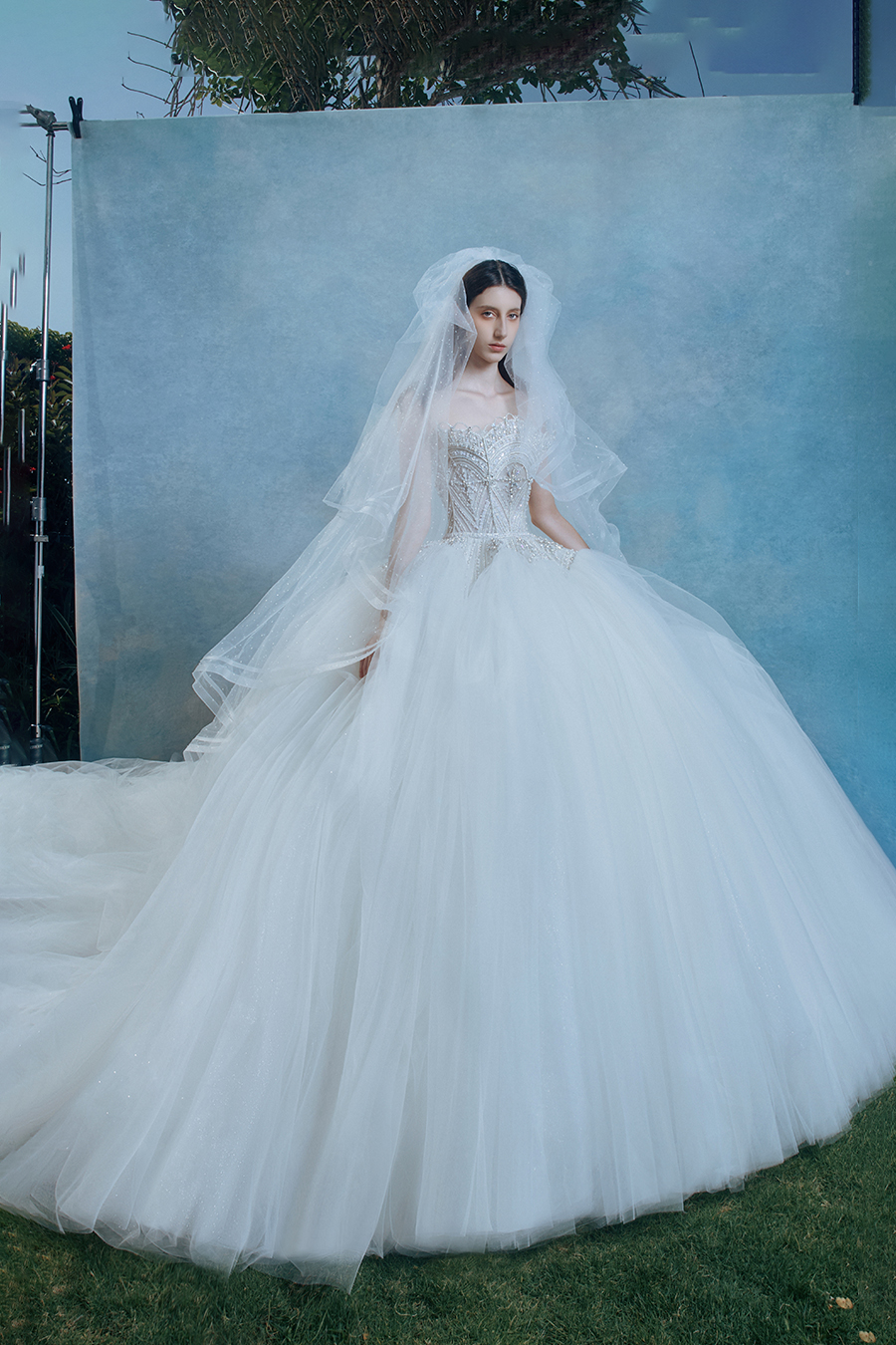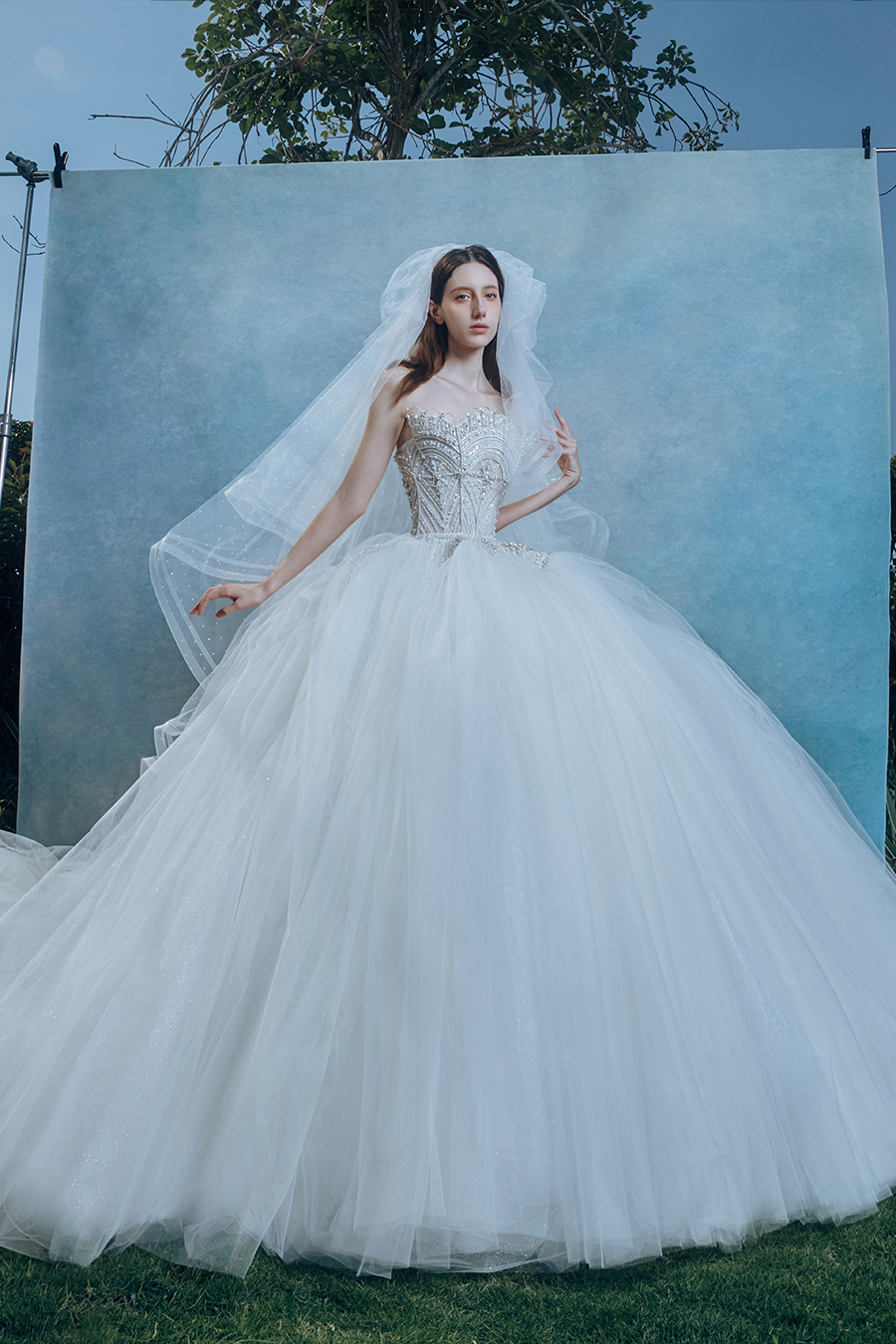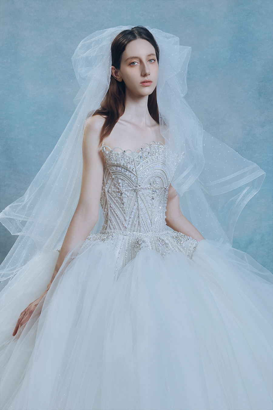 The ideal island in the hearts of women, with a vague and uncertain location, but Dahlia's heart is ready to sail and follow the wind of tracing light towards the ideal place. The three-dimensional bead embroidery base at the strapless area is tempered with a prism of light, and the geometric waist is cut with the aesthetic of ice crystal matrix fission to create soft light. The rigid bone lines support the floating silhouette of the cloud skirt, creating an eternal field of rigid and flexible game between tightness and expansion. Crystal diamonds are densely embedded like fragments of the Milky Way pouring onto the veil, and when the body sways lightly, the illusionary spectrum of liquid light spots bursts out, condensing the brilliance on the path of tracing light into an eternal emblem. Matte satin and transparent yarn are layered to imitate the mist and light marks, and the pure white color tone is transformed into a liquid canvas that records the changes of light and shadow, making Dahlia an eternal illusion built for tracing light.