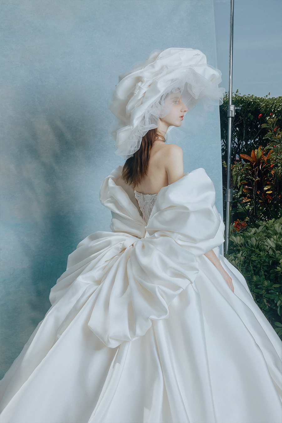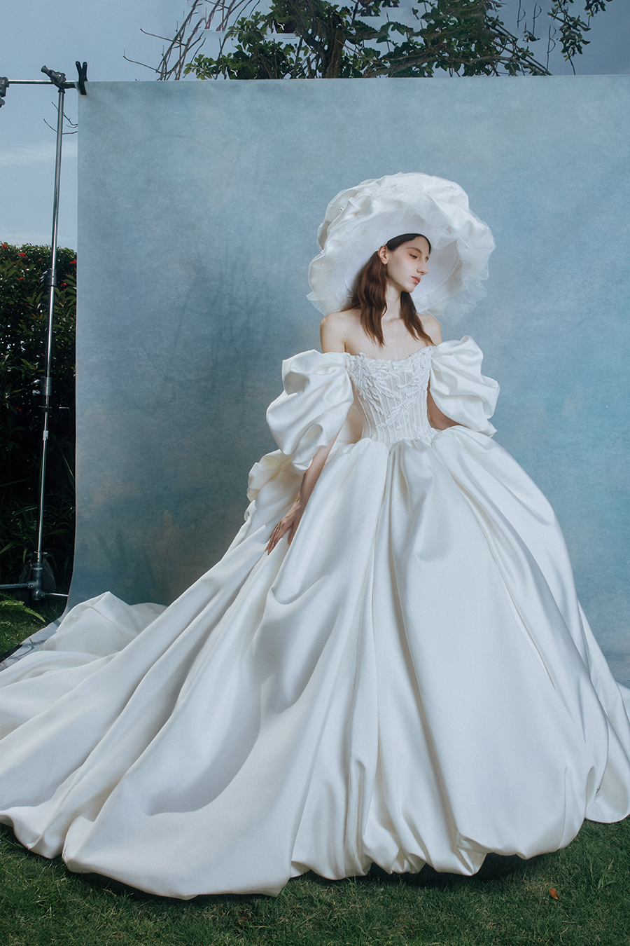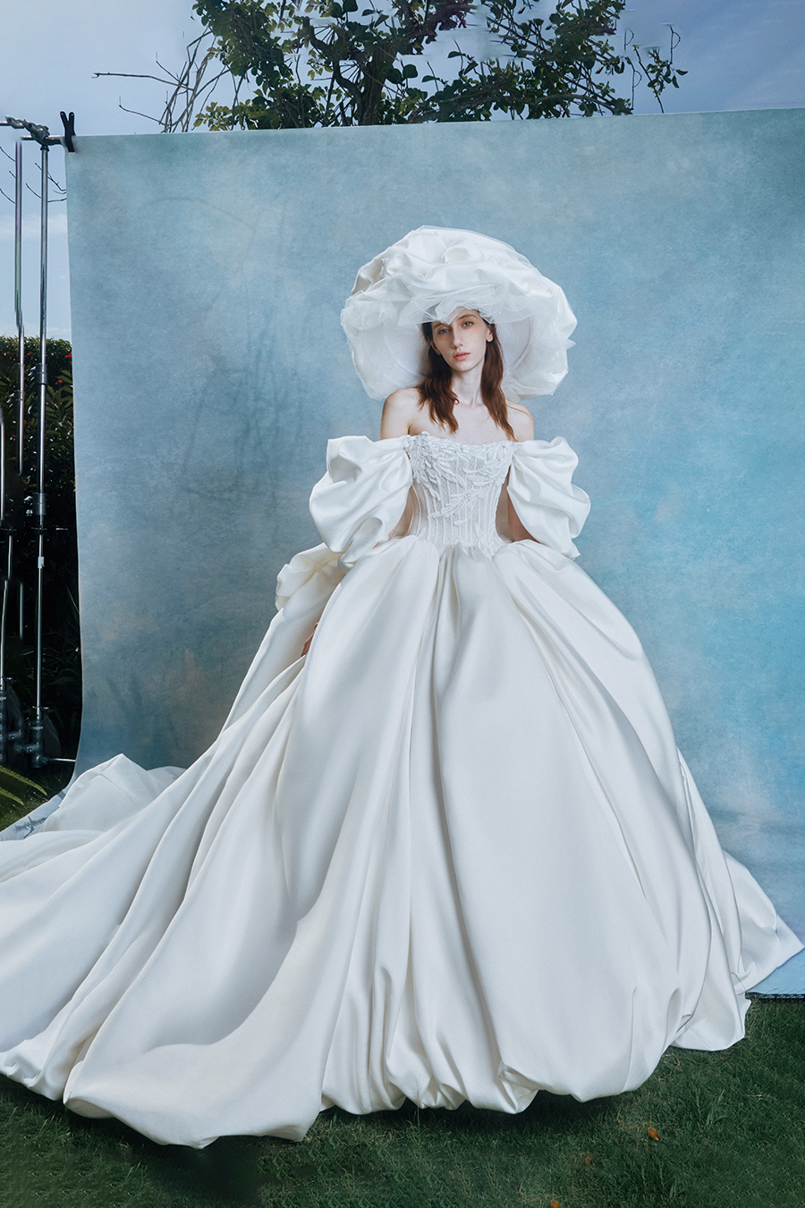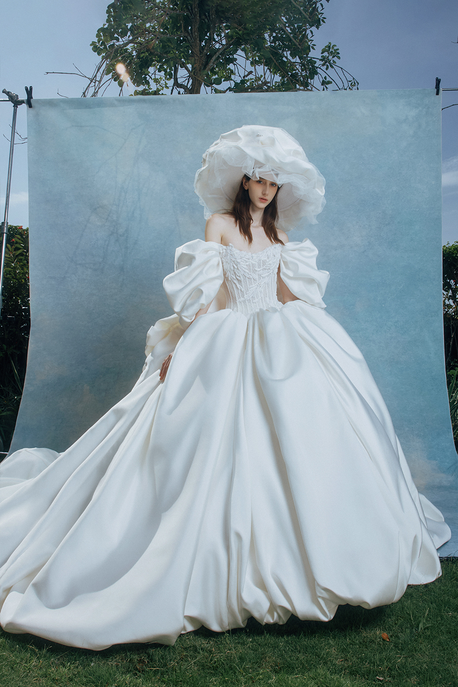 The off shoulder cloud sleeves reveal the poetic prologue of Zyrena with the gentle curve of the light gate opening gently. The pleats deconstruct the physical form of light through the randomness of wind marks and creases. The geometric waistband refines the cold and sharp edges cut by the light blade, while the sturdy bone lines support the liquid metal like cloud skirt. In the flow of satin luster, they complete a dialogue between softness and toughness in time and space. The decorative craftsmanship is hidden in the fabric texture - the light spots wander between the folds into liquid lines of poetry, and the pure white satin turns into a liquid canvas that records the light marks. The exaggerated chiffon hat is adorned with folds to reconstruct the form of morning mist, like a halo materialized in the dawn, resonating with the clouds breathing in the skirt, jointly building a temple of light, making every step a solemn footnote to the ritual of tracing light.