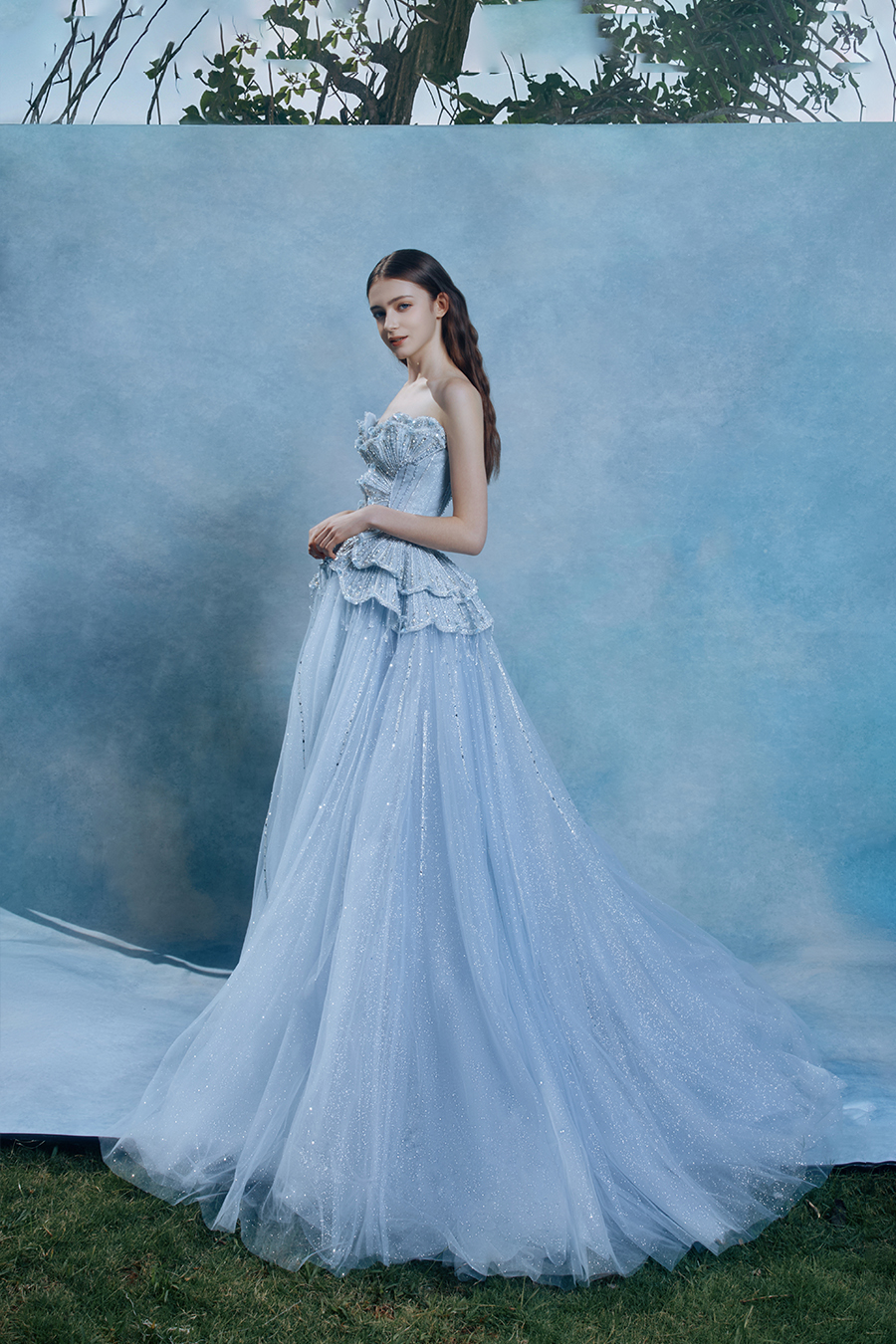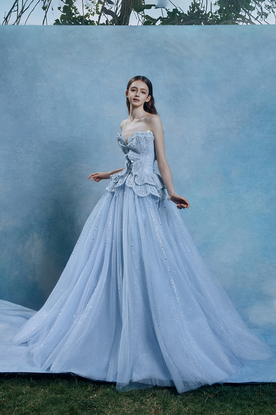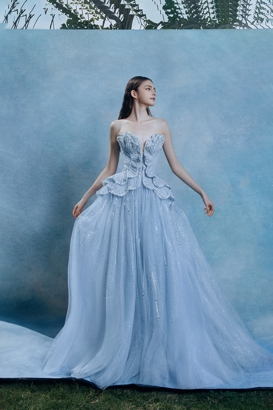 Brinthara's navy blue represents stability, calmness, and rationality, paired with three-dimensional styling and streamlined jewelry, highlighting the feminine and resolute qualities of women. The layered fishbone structure extends naturally like a shell arc, capturing the moment of light and shadow with precise three-dimensional shaping. The combination of rigid and flexible lines blends architectural rationality with human softness. In terms of craftsmanship, the three-dimensional bead embroidery technique is used, and the gradient bead embroidery flows like the shattered light of a galaxy. The crystal diamonds are precisely arranged along the thin gauze texture, forming a dynamic light effect where the morning light penetrates through the clouds. The light and transparent blue chiffon base carries the hazy clarity of morning sea mist, and the geometric pleats break the flatness of the skirt, creating a three-dimensional field of overlapping light and shadow.