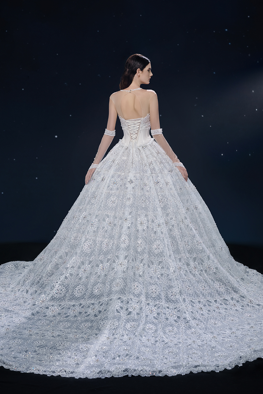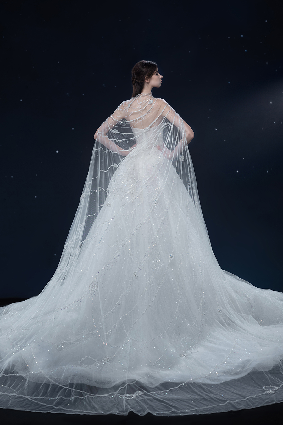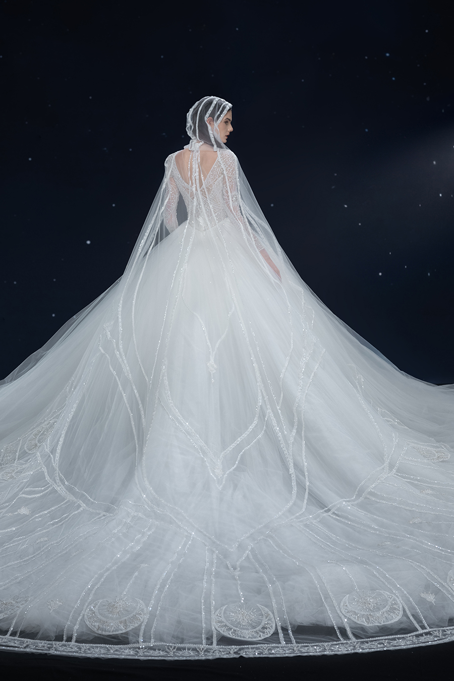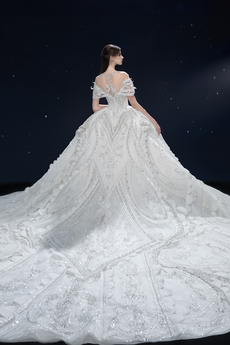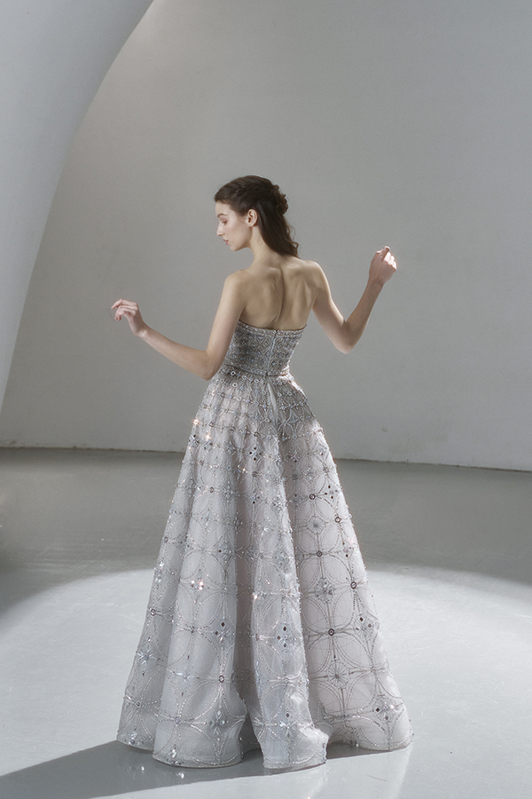 A beam of light from a star tearing apart and expanse through the darkness in the universe, bringing a story of space utopia. 89.5% of the elements present in the human body originate from stellar sources. Each individual particle absorbed into our bodies represents the history of universe since the Big Bang until the present day. We are the descendants of the stars, which they have spent 14 billion years traveling through time and space to create us, unite us and ultimately complete each other. In The Bridal by The Atelier Spring/Summer 2024 Collection, we imagine a tranquil, passionate, and brilliant world beyond the sky when we gaze upon the sun, moon, and stars. By taking the classical luxury wedding dress of Crinoline as the scroll and looking back at the orbit of the Milky Way, the space structure of celestial bodies is replicated, and the corners of the starry river reappeared. The space utopia leaps out through the wonderful craftsmanship, which all kinds of marvellous celestial bodies are cut and collaged through the garment structure, along with lace, embroidery, beading, hot fix rhinestone, and other decorative techniques. This is the romance and reminisce of the space, it is our interpretation of "one another", "fate" and "love", bringing the unique space romanticism of The Atelier.