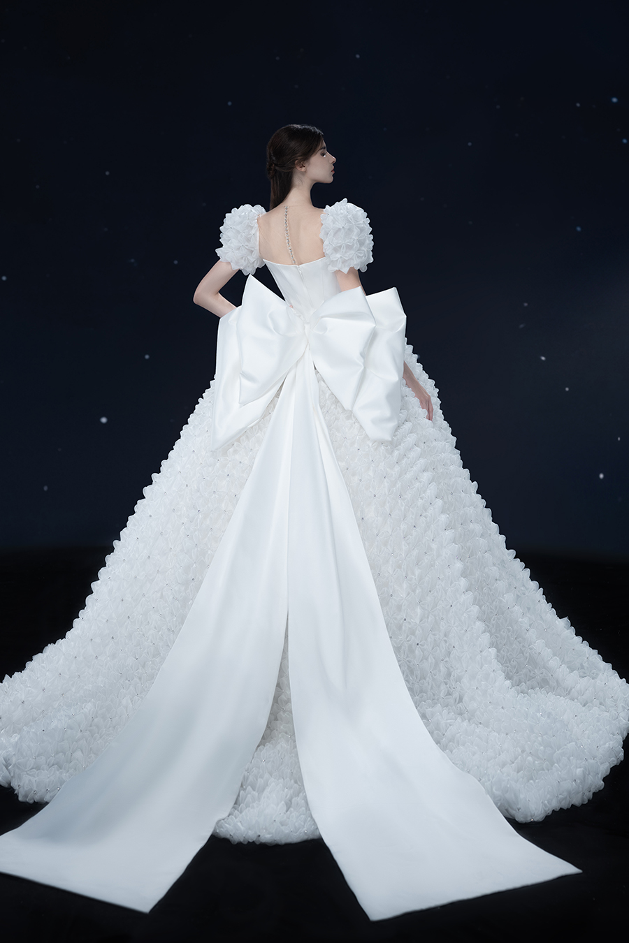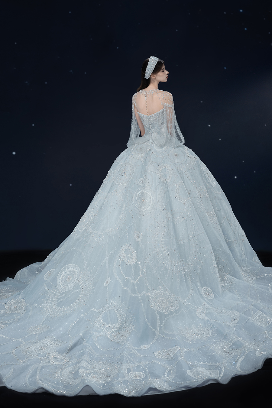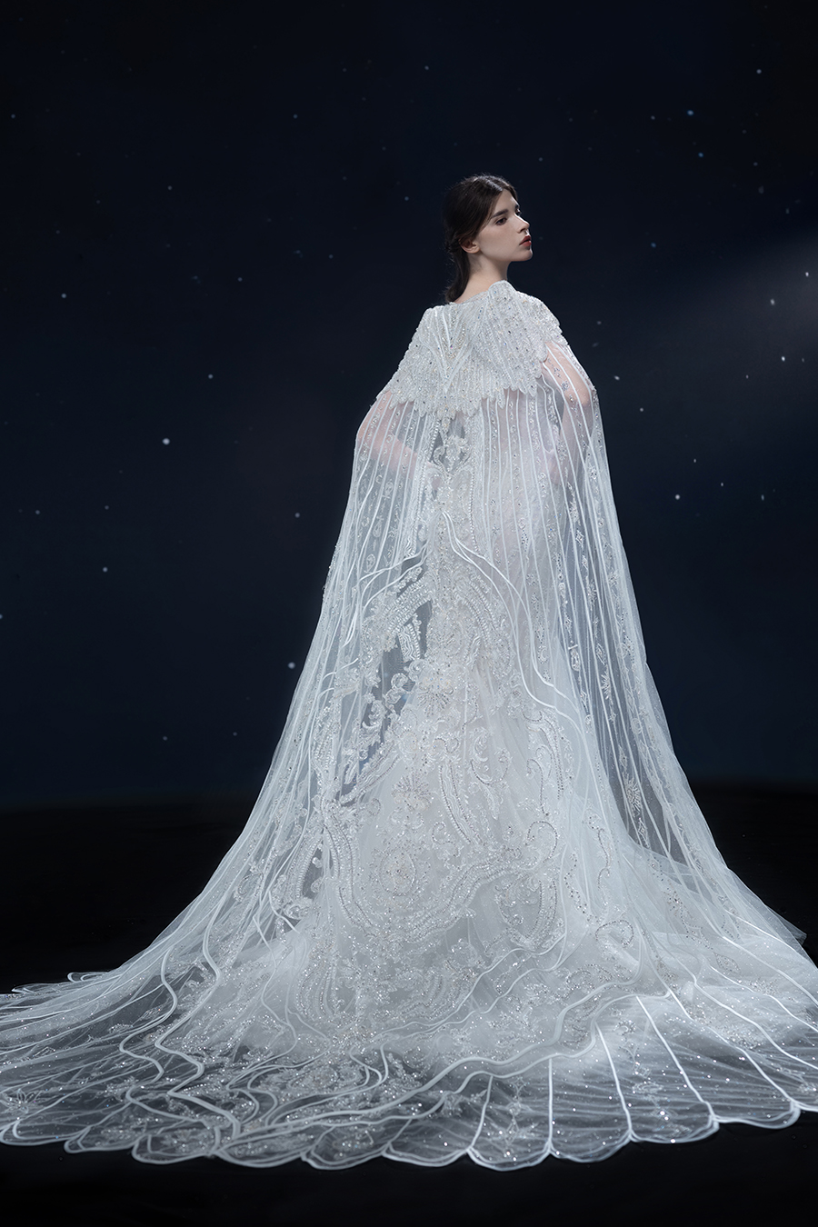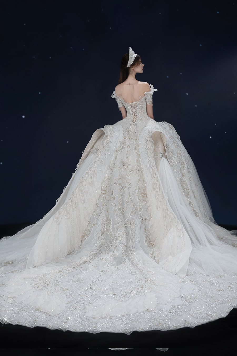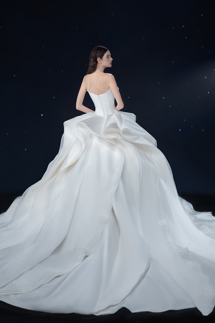 A beam of light from a star tearing apart and expanse through the darkness in the universe, bringing a story of space utopia. 89.5% of the elements present in the human body originate from stellar sources. Each individual particle absorbed into our bodies represents the history of universe since the Big Bang until the present day. We are the descendants of the stars, which they have spent 14 billion years traveling through time and space to create us, unite us and ultimately complete each other. In The Bridal by The Atelier Spring/Summer 2024 Collection, we imagine a tranquil, passionate, and brilliant world beyond the sky when we gaze upon the sun, moon, and stars. By taking the classical luxury wedding dress of Crinoline as the scroll and looking back at the orbit of the Milky Way, the space structure of celestial bodies is replicated, and the corners of the starry river reappeared. The space utopia leaps out through the wonderful craftsmanship, which all kinds of marvellous celestial bodies are cut and collaged through the garment structure, along with lace, embroidery, beading, hot fix rhinestone, and other decorative techniques. This is the romance and reminisce of the space, it is our interpretation of "one another", "fate" and "love", bringing the unique space romanticism of The Atelier.