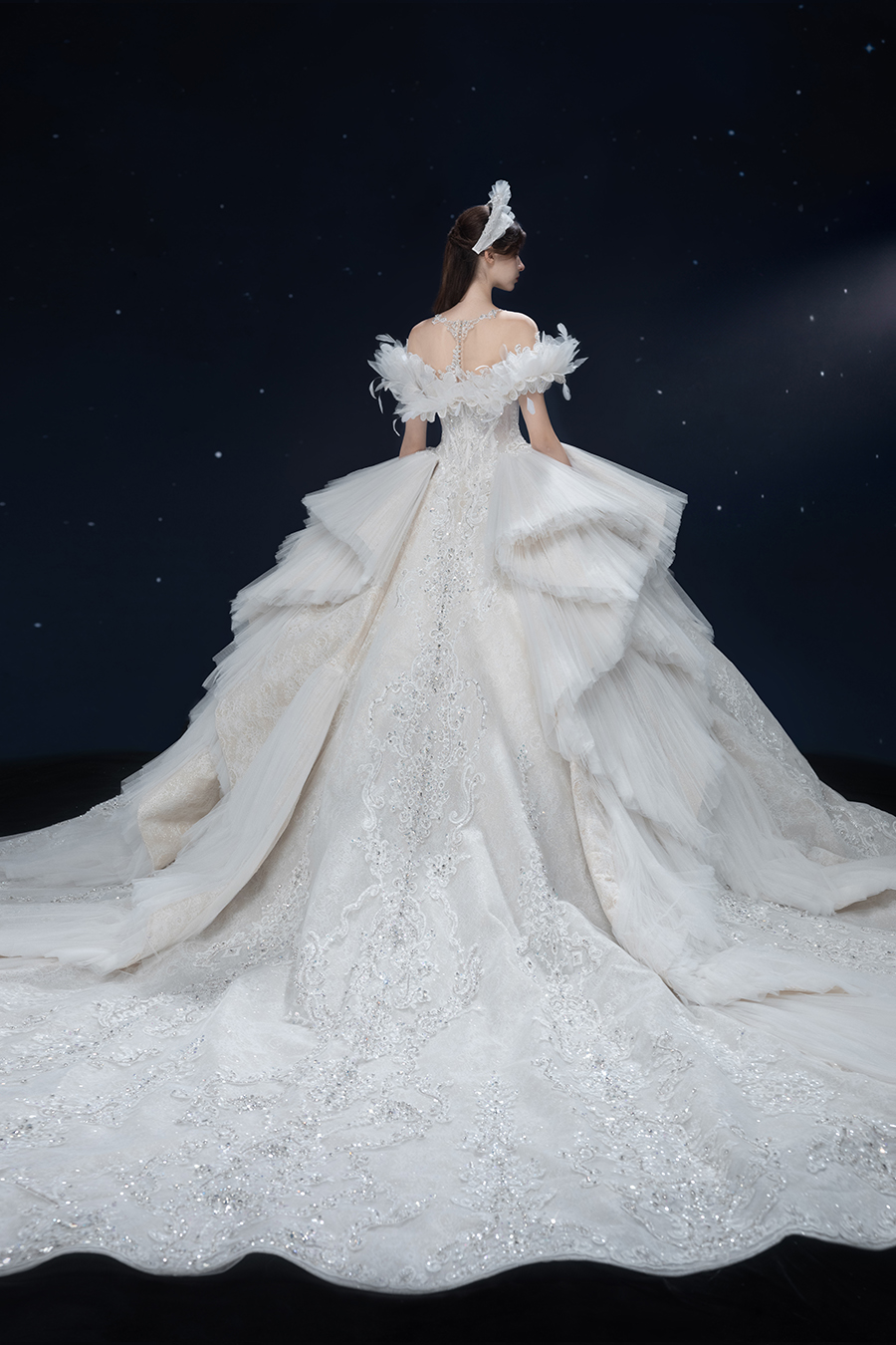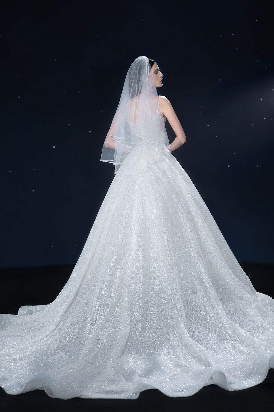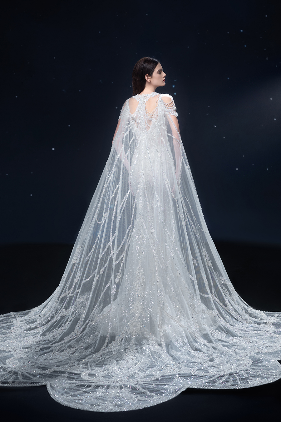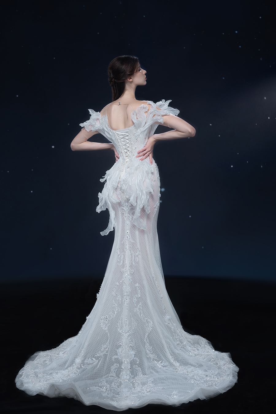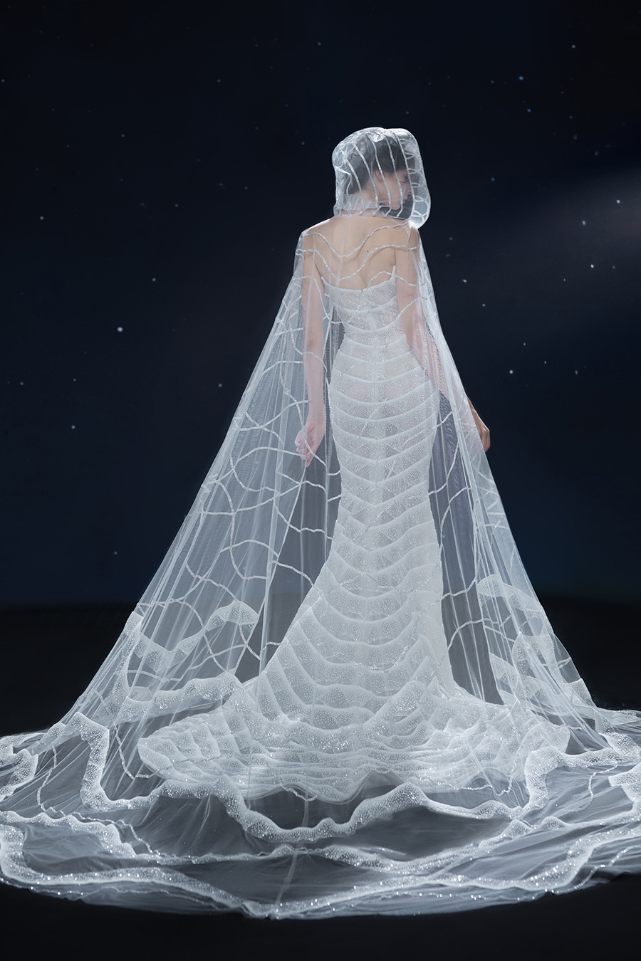 A beam of light from a star tearing apart and expanse through the darkness in the universe, bringing a story of space utopia. 89.5% of the elements present in the human body originate from stellar sources. Each individual particle absorbed into our bodies represents the history of universe since the Big Bang until the present day. We are the descendants of the stars, which they have spent 14 billion years traveling through time and space to create us, unite us and ultimately complete each other. In The Bridal by The Atelier Spring/Summer 2024 Collection, we imagine a tranquil, passionate, and brilliant world beyond the sky when we gaze upon the sun, moon, and stars. By taking the classical luxury wedding dress of Crinoline as the scroll and looking back at the orbit of the Milky Way, the space structure of celestial bodies is replicated, and the corners of the starry river reappeared. The space utopia leaps out through the wonderful craftsmanship, which all kinds of marvellous celestial bodies are cut and collaged through the garment structure, along with lace, embroidery, beading, hot fix rhinestone, and other decorative techniques. This is the romance and reminisce of the space, it is our interpretation of "one another", "fate" and "love", bringing the unique space romanticism of The Atelier.