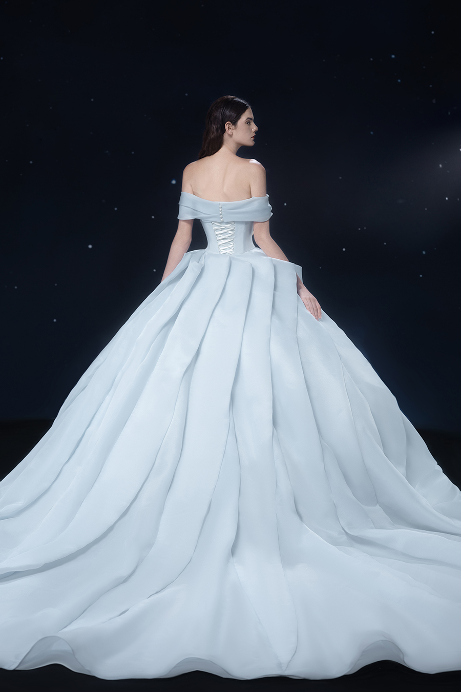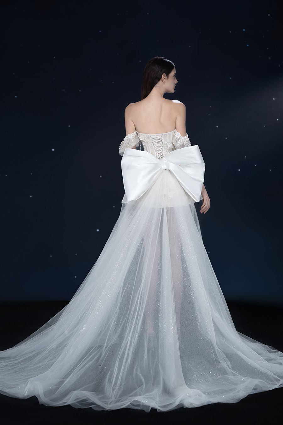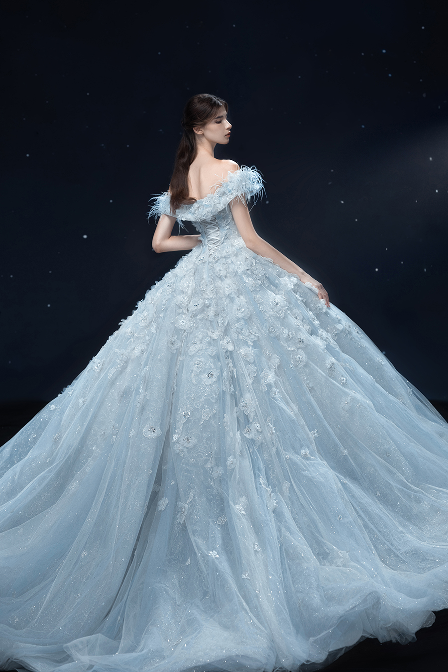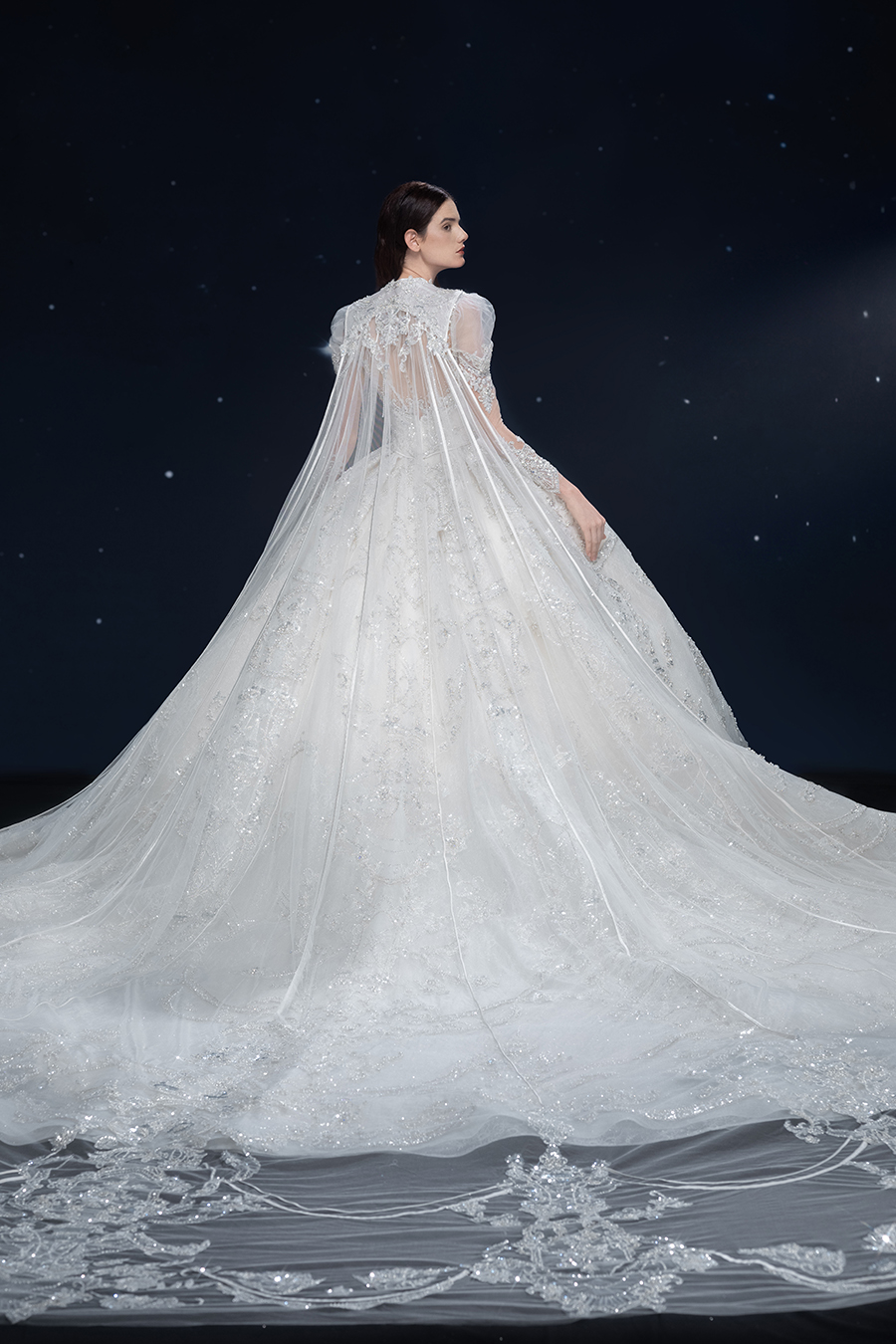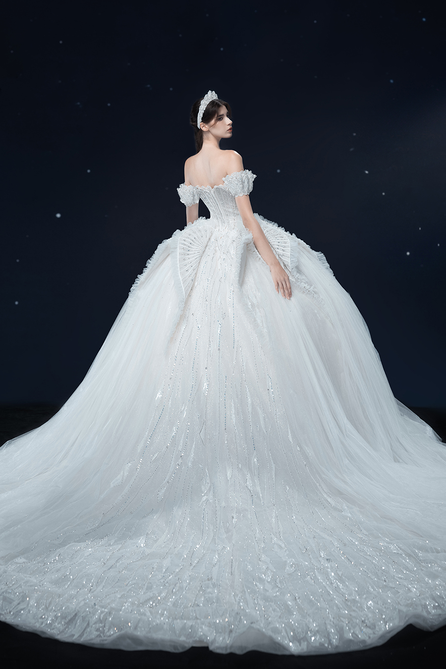 A beam of light from a star tearing apart and expanse through the darkness in the universe, bringing a story of space utopia. 89.5% of the elements present in the human body originate from stellar sources. Each individual particle absorbed into our bodies represents the history of universe since the Big Bang until the present day. We are the descendants of the stars, which they have spent 14 billion years traveling through time and space to create us, unite us and ultimately complete each other. In The Bridal by The Atelier Spring/Summer 2024 Collection, we imagine a tranquil, passionate, and brilliant world beyond the sky when we gaze upon the sun, moon, and stars. By taking the classical luxury wedding dress of Crinoline as the scroll and looking back at the orbit of the Milky Way, the space structure of celestial bodies is replicated, and the corners of the starry river reappeared. The space utopia leaps out through the wonderful craftsmanship, which all kinds of marvellous celestial bodies are cut and collaged through the garment structure, along with lace, embroidery, beading, hot fix rhinestone, and other decorative techniques. This is the romance and reminisce of the space, it is our interpretation of "one another", "fate" and "love", bringing the unique space romanticism of The Atelier.