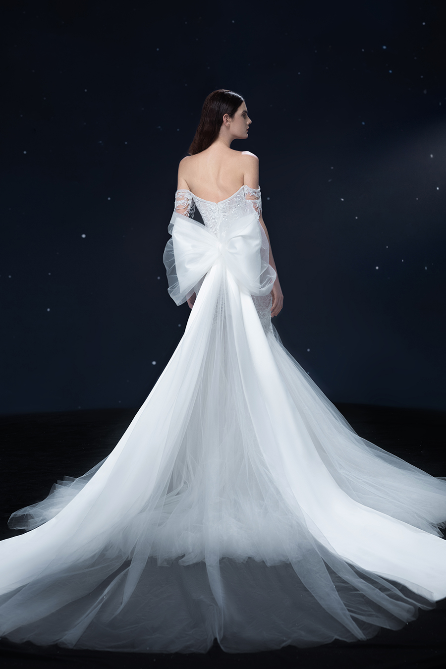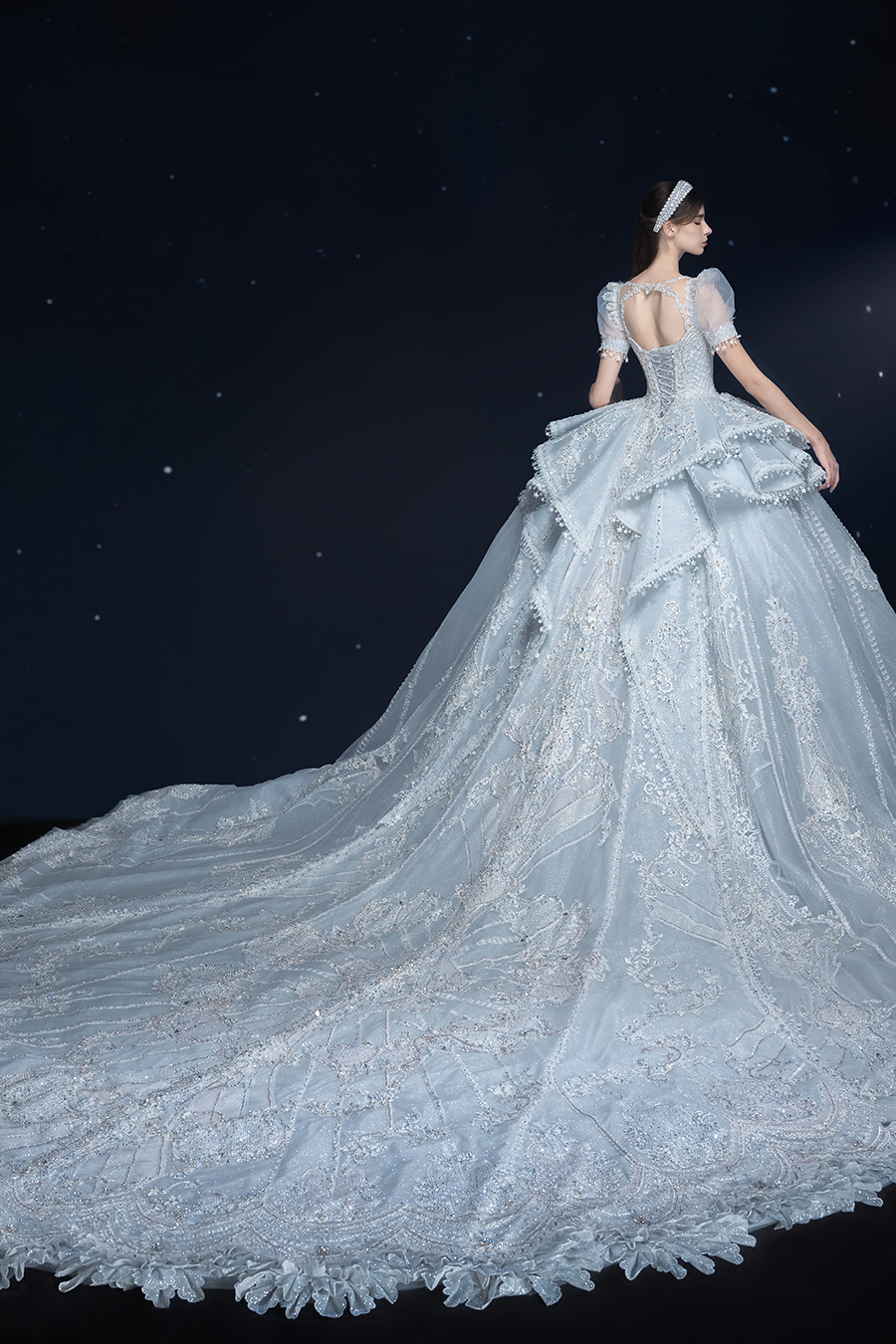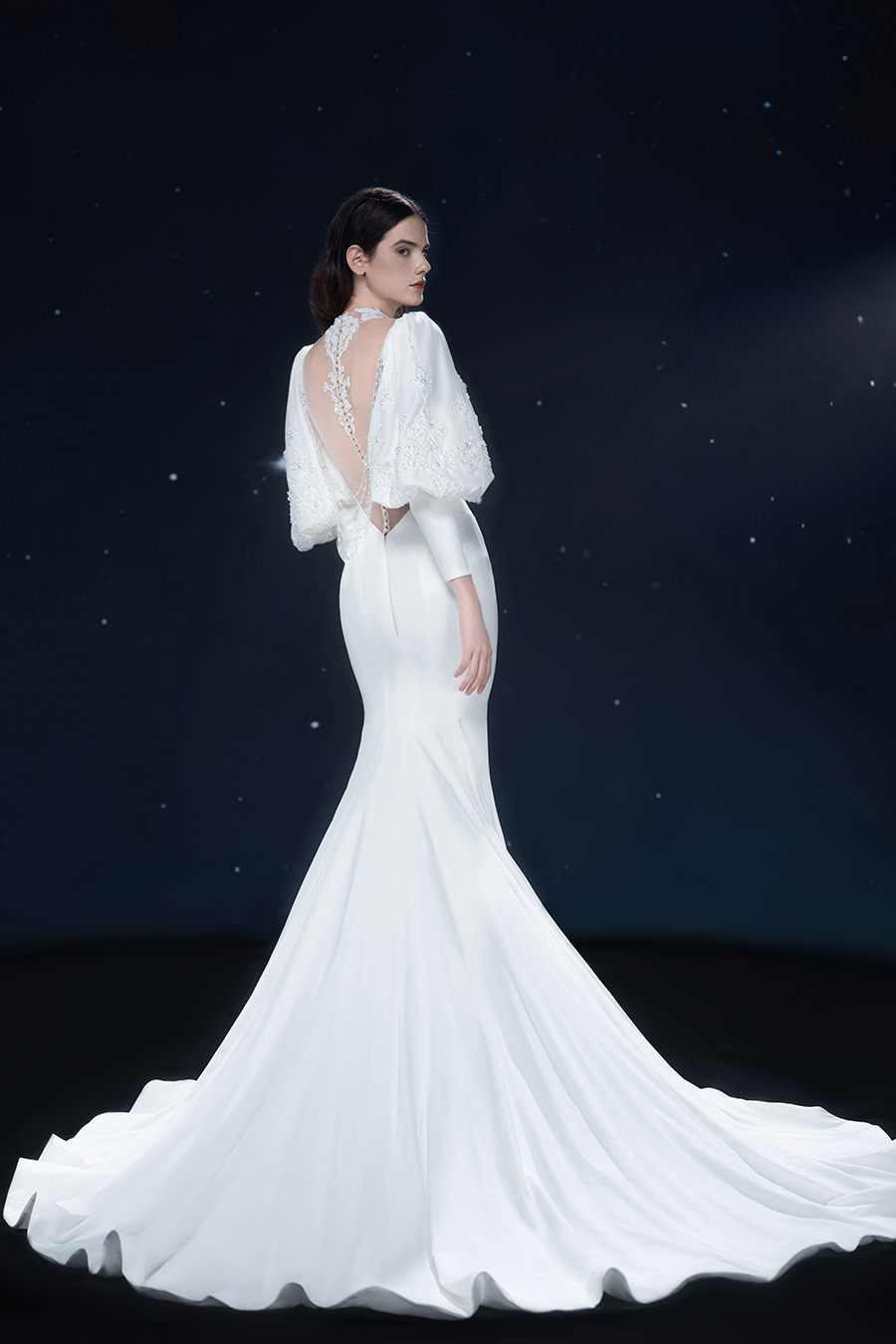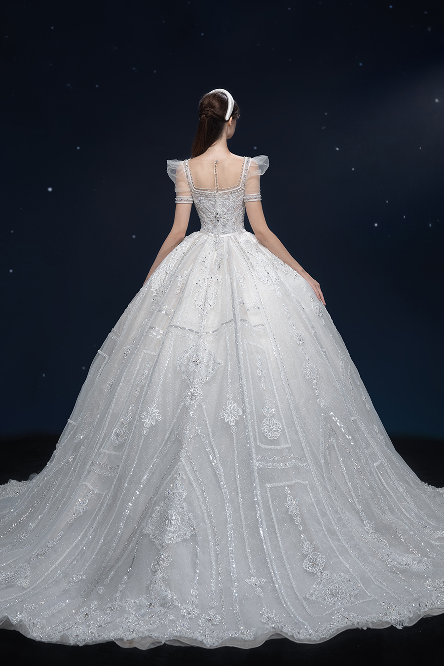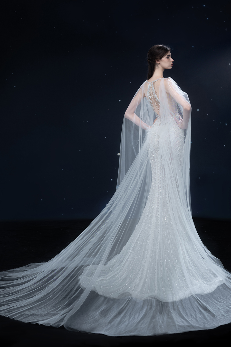 A beam of light from a star tearing apart and expanse through the darkness in the universe, bringing a story of space utopia. 89.5% of the elements present in the human body originate from stellar sources. Each individual particle absorbed into our bodies represents the history of universe since the Big Bang until the present day. We are the descendants of the stars, which they have spent 14 billion years traveling through time and space to create us, unite us and ultimately complete each other. In The Bridal by The Atelier Spring/Summer 2024 Collection, we imagine a tranquil, passionate, and brilliant world beyond the sky when we gaze upon the sun, moon, and stars. By taking the classical luxury wedding dress of Crinoline as the scroll and looking back at the orbit of the Milky Way, the space structure of celestial bodies is replicated, and the corners of the starry river reappeared. The space utopia leaps out through the wonderful craftsmanship, which all kinds of marvellous celestial bodies are cut and collaged through the garment structure, along with lace, embroidery, beading, hot fix rhinestone, and other decorative techniques. This is the romance and reminisce of the space, it is our interpretation of "one another", "fate" and "love", bringing the unique space romanticism of The Atelier.
