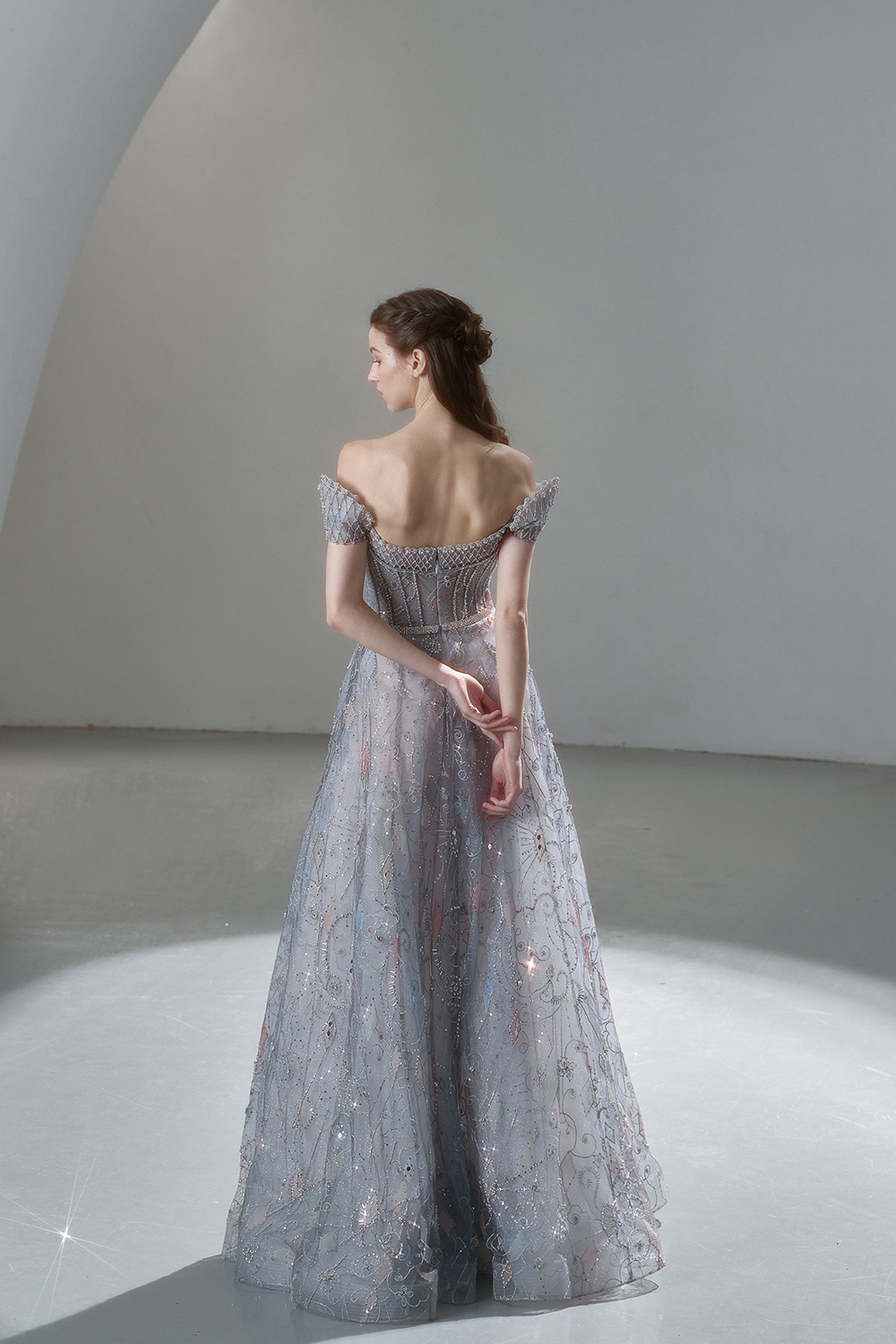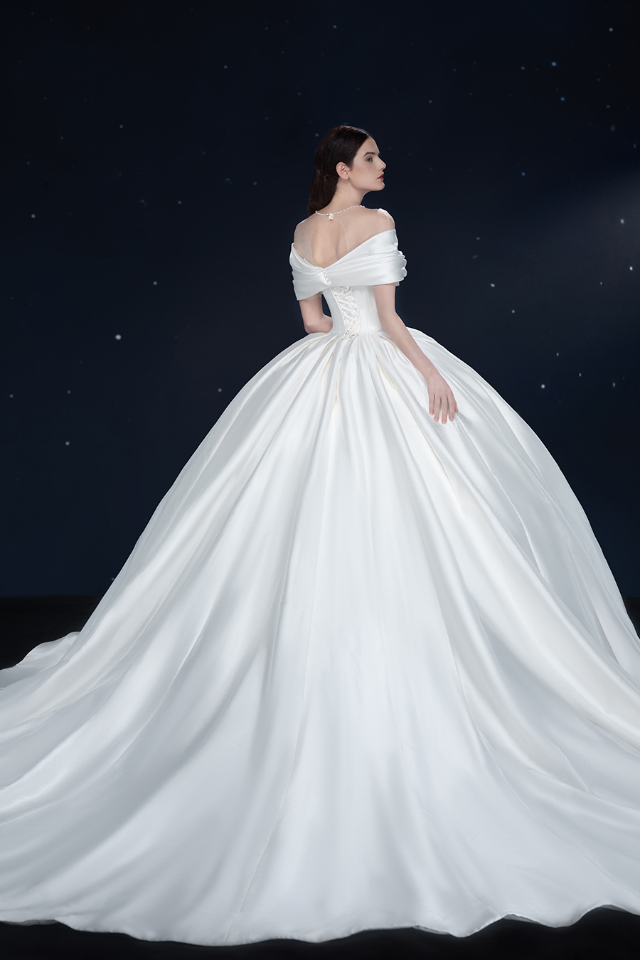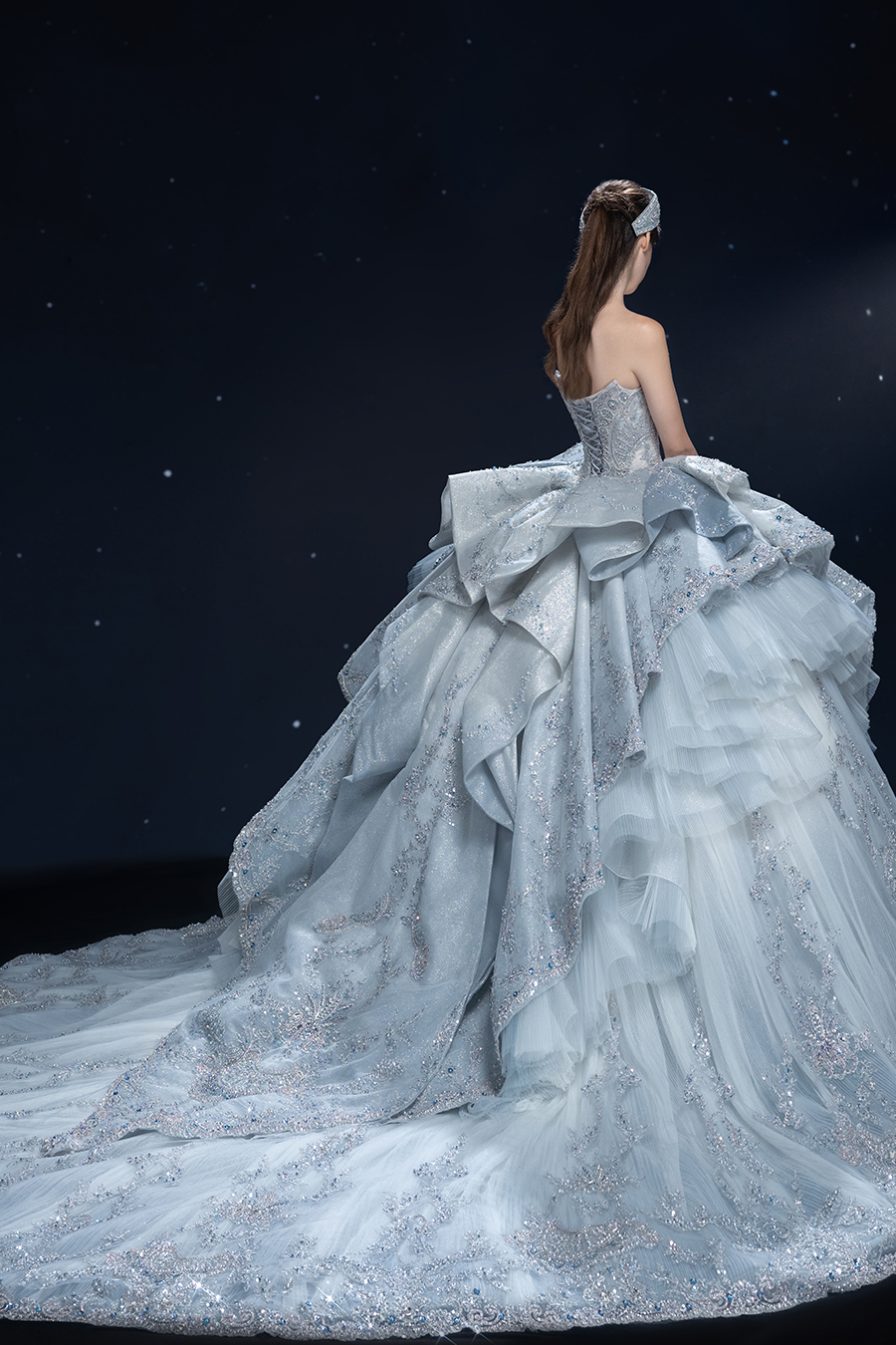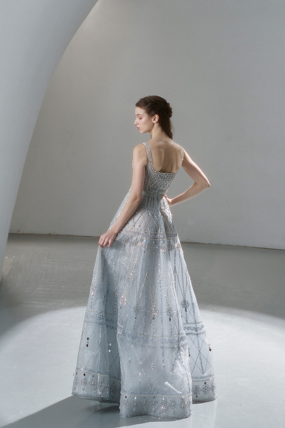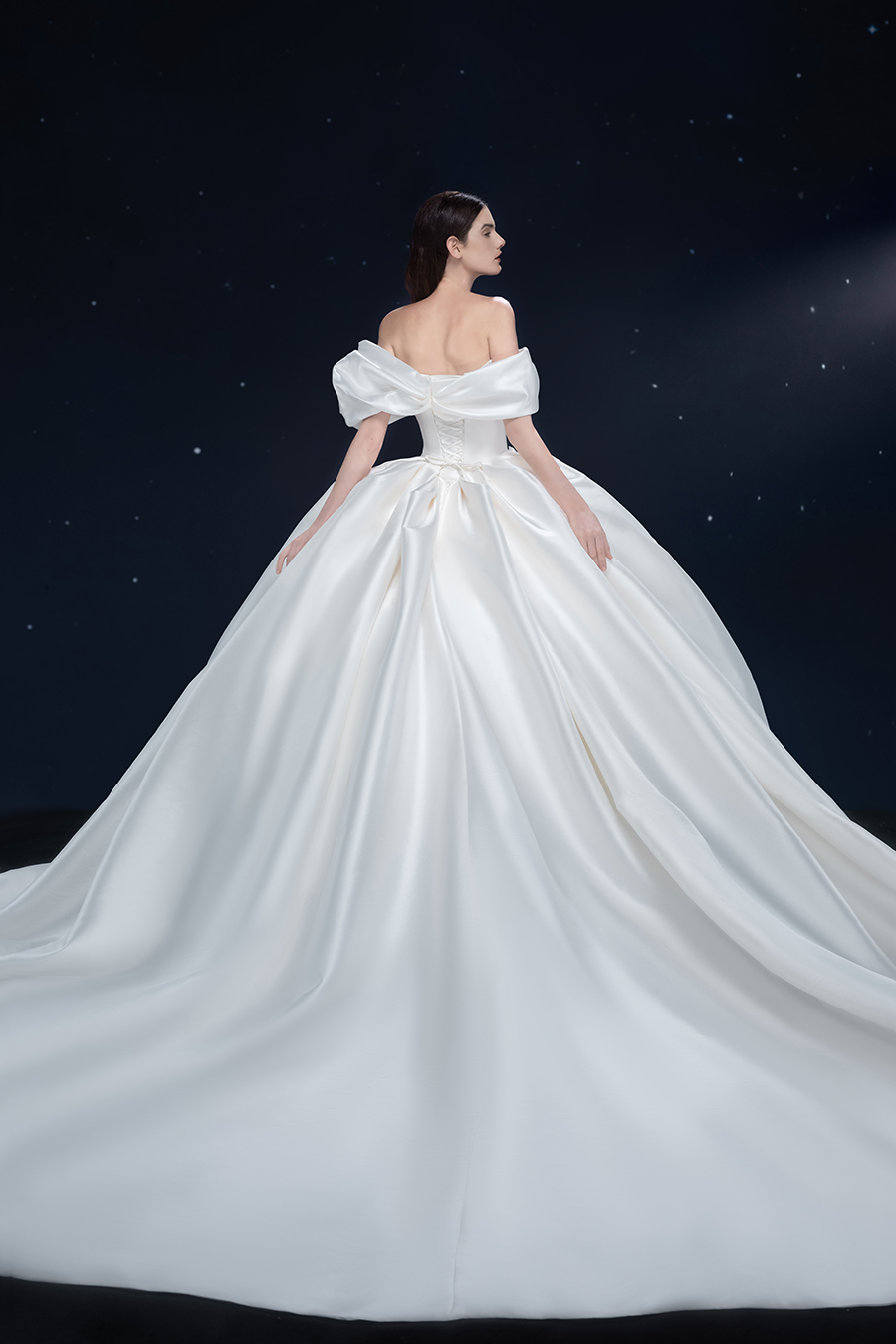 A beam of light from a star tearing apart and expanse through the darkness in the universe, bringing a story of space utopia. 89.5% of the elements present in the human body originate from stellar sources. Each individual particle absorbed into our bodies represents the history of universe since the Big Bang until the present day. We are the descendants of the stars, which they have spent 14 billion years traveling through time and space to create us, unite us and ultimately complete each other. In The Bridal by The Atelier Spring/Summer 2024 Collection, we imagine a tranquil, passionate, and brilliant world beyond the sky when we gaze upon the sun, moon, and stars. By taking the classical luxury wedding dress of Crinoline as the scroll and looking back at the orbit of the Milky Way, the space structure of celestial bodies is replicated, and the corners of the starry river reappeared. The space utopia leaps out through the wonderful craftsmanship, which all kinds of marvellous celestial bodies are cut and collaged through the garment structure, along with lace, embroidery, beading, hot fix rhinestone, and other decorative techniques. This is the romance and reminisce of the space, it is our interpretation of "one another", "fate" and "love", bringing the unique space romanticism of The Atelier.