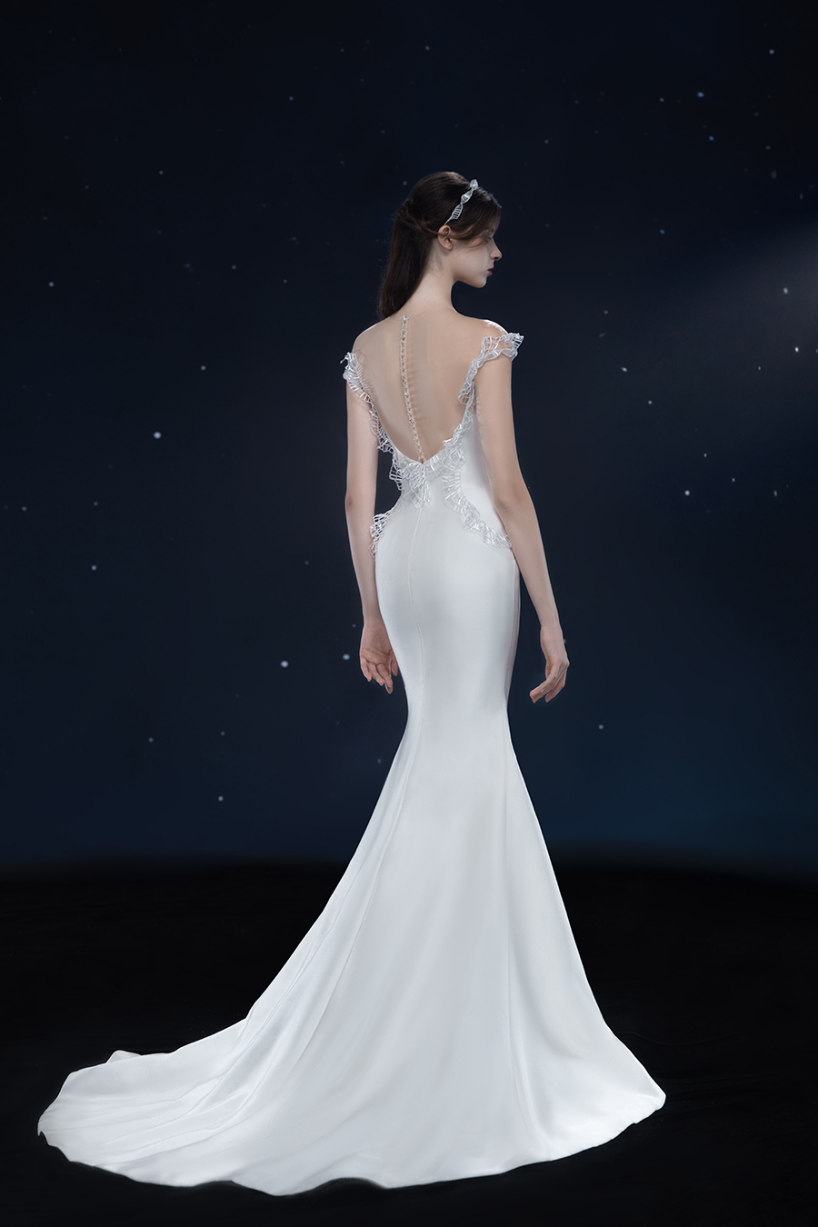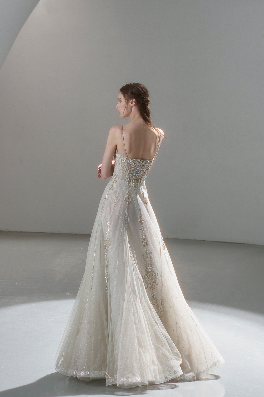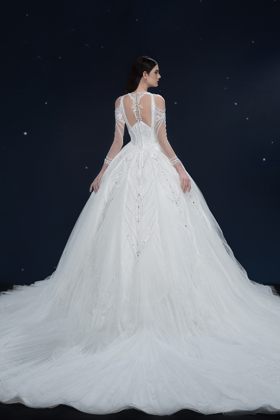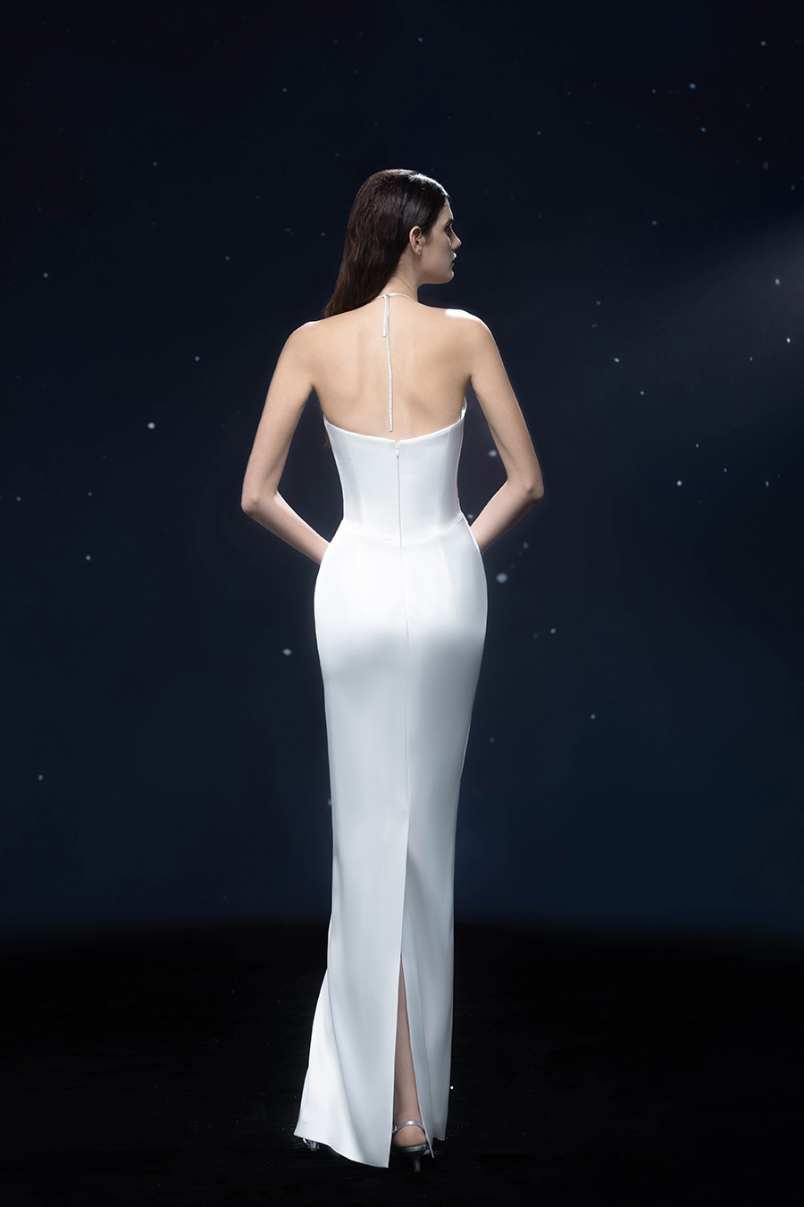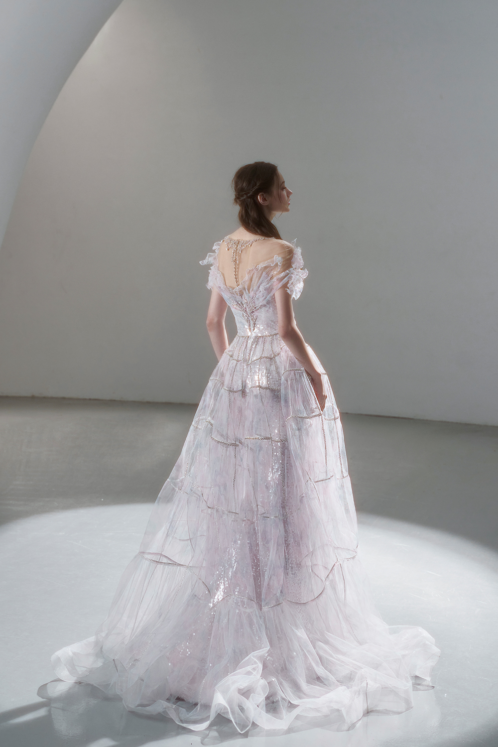 A beam of light from a star tearing apart and expanse through the darkness in the universe, bringing a story of space utopia. 89.5% of the elements present in the human body originate from stellar sources. Each individual particle absorbed into our bodies represents the history of universe since the Big Bang until the present day. We are the descendants of the stars, which they have spent 14 billion years traveling through time and space to create us, unite us and ultimately complete each other. In The Bridal by The Atelier Spring/Summer 2024 Collection, we imagine a tranquil, passionate, and brilliant world beyond the sky when we gaze upon the sun, moon, and stars. By taking the classical luxury wedding dress of Crinoline as the scroll and looking back at the orbit of the Milky Way, the space structure of celestial bodies is replicated, and the corners of the starry river reappeared. The space utopia leaps out through the wonderful craftsmanship, which all kinds of marvellous celestial bodies are cut and collaged through the garment structure, along with lace, embroidery, beading, hot fix rhinestone, and other decorative techniques. This is the romance and reminisce of the space, it is our interpretation of "one another", "fate" and "love", bringing the unique space romanticism of The Atelier.