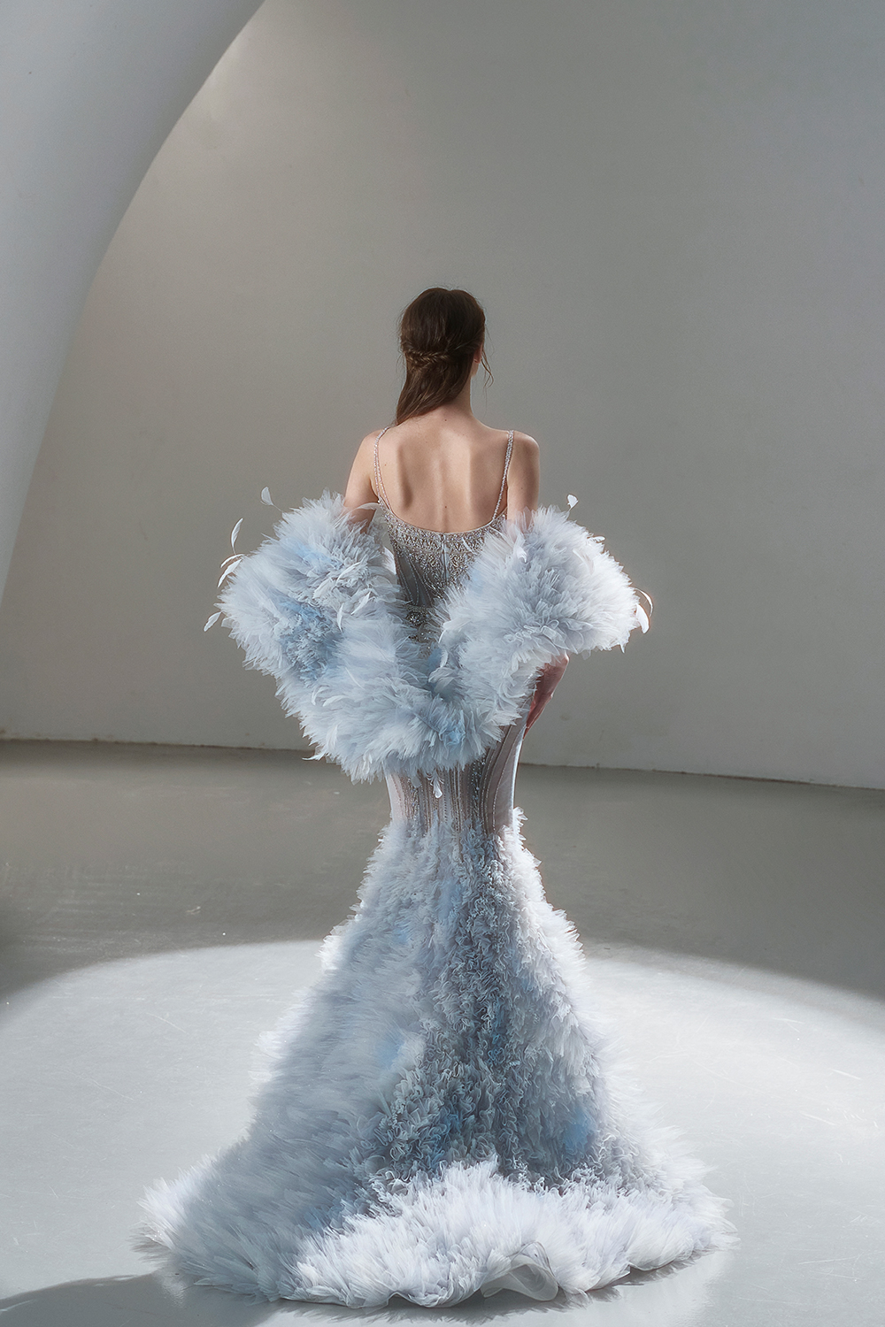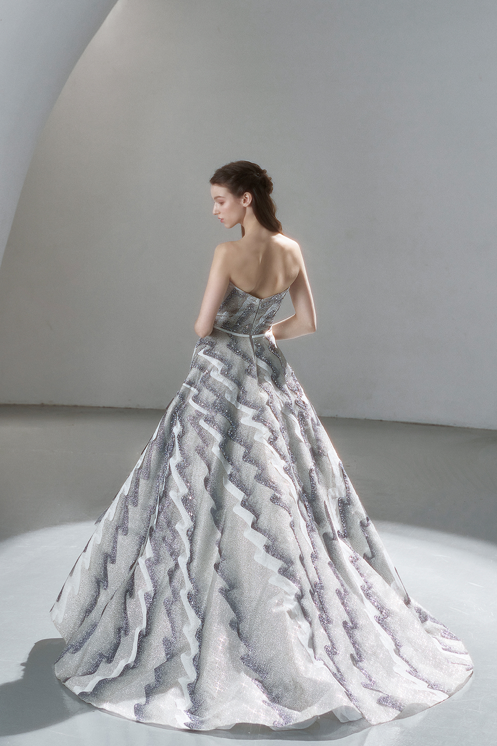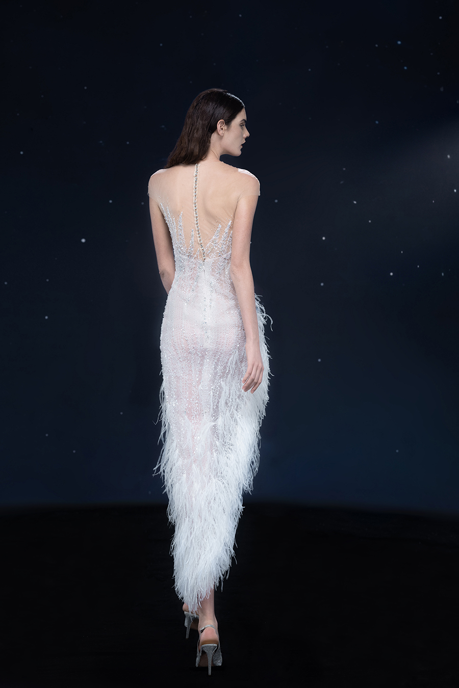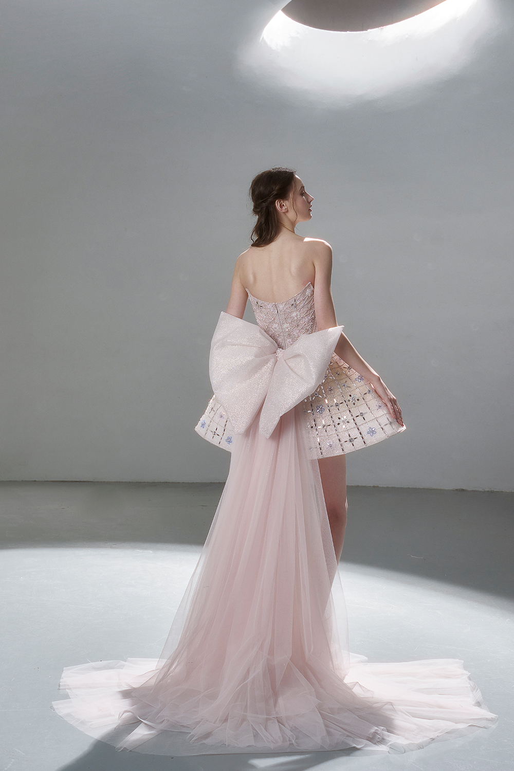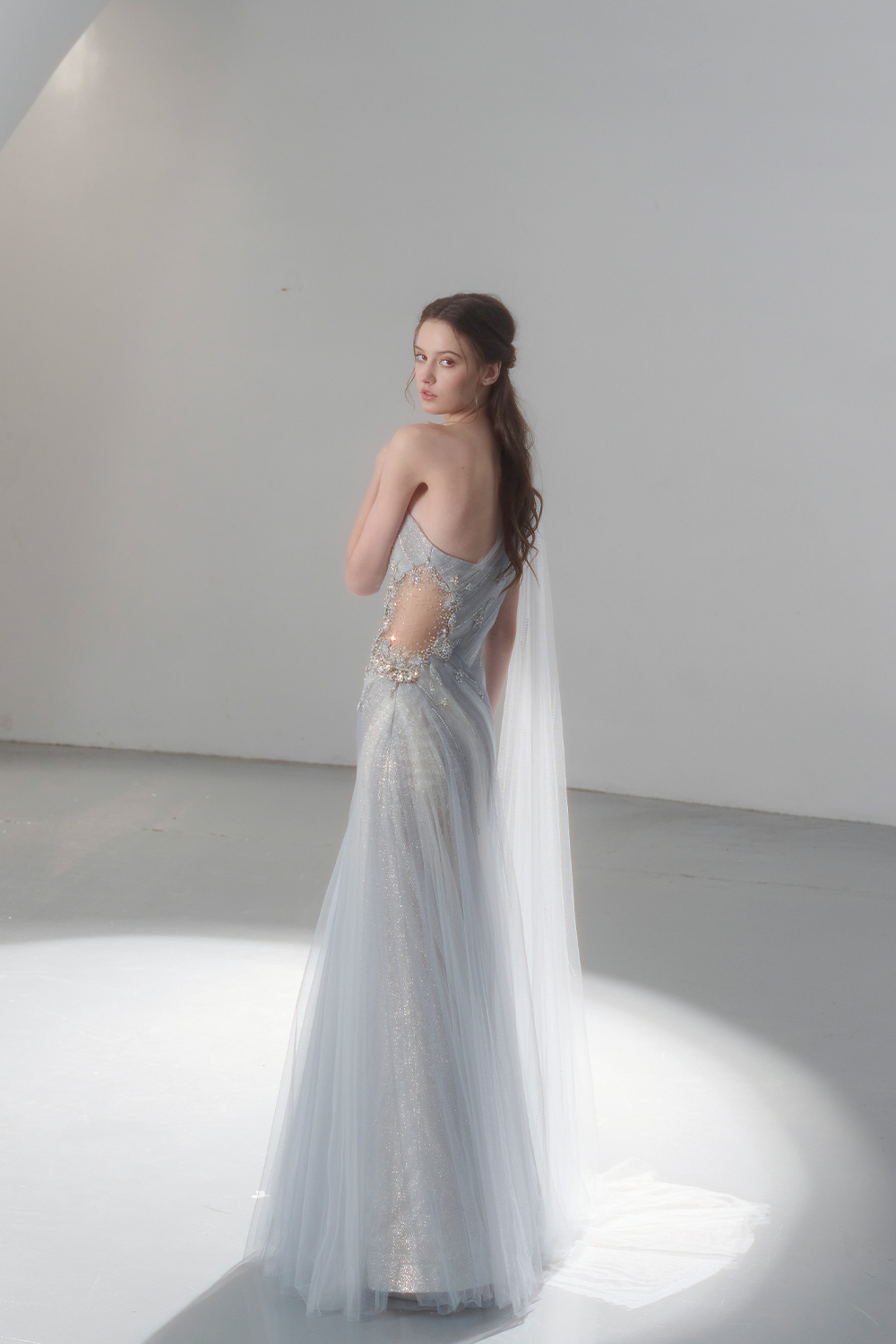 A beam of light from a star tearing apart and expanse through the darkness in the universe, bringing a story of space utopia. 89.5% of the elements present in the human body originate from stellar sources. Each individual particle absorbed into our bodies represents the history of universe since the Big Bang until the present day. We are the descendants of the stars, which they have spent 14 billion years traveling through time and space to create us, unite us and ultimately complete each other. In The Bridal by The Atelier Spring/Summer 2024 Collection, we imagine a tranquil, passionate, and brilliant world beyond the sky when we gaze upon the sun, moon, and stars. By taking the classical luxury wedding dress of Crinoline as the scroll and looking back at the orbit of the Milky Way, the space structure of celestial bodies is replicated, and the corners of the starry river reappeared. The space utopia leaps out through the wonderful craftsmanship, which all kinds of marvellous celestial bodies are cut and collaged through the garment structure, along with lace, embroidery, beading, hot fix rhinestone, and other decorative techniques. This is the romance and reminisce of the space, it is our interpretation of "one another", "fate" and "love", bringing the unique space romanticism of The Atelier.