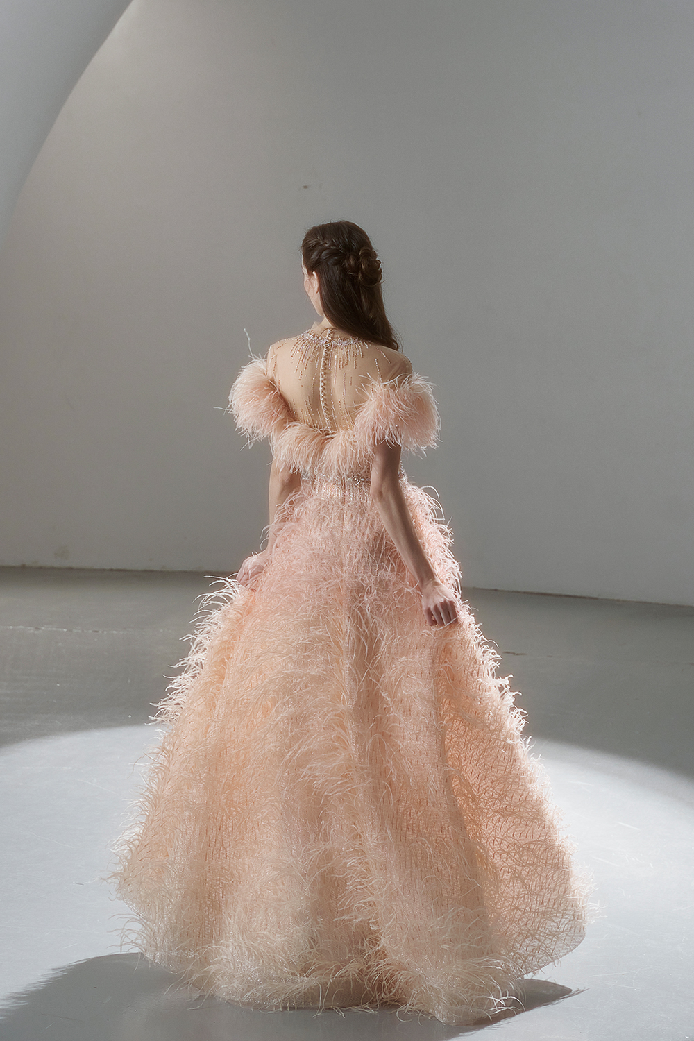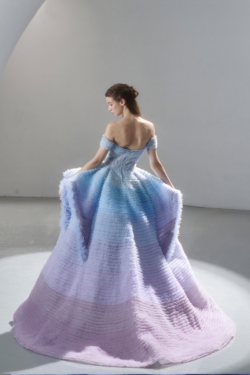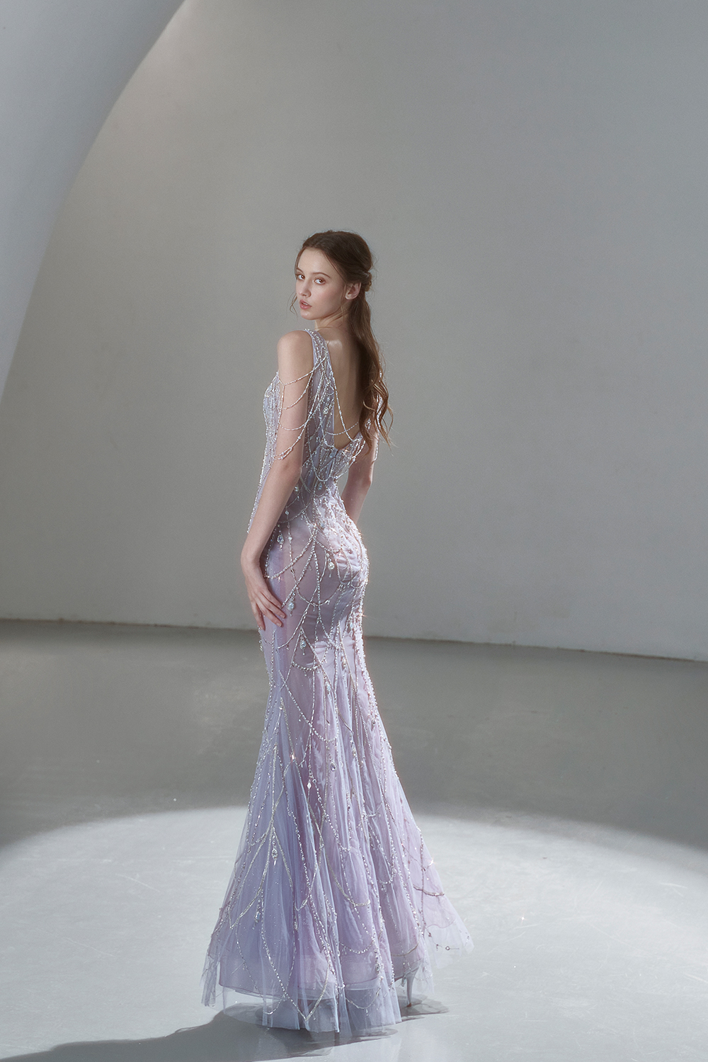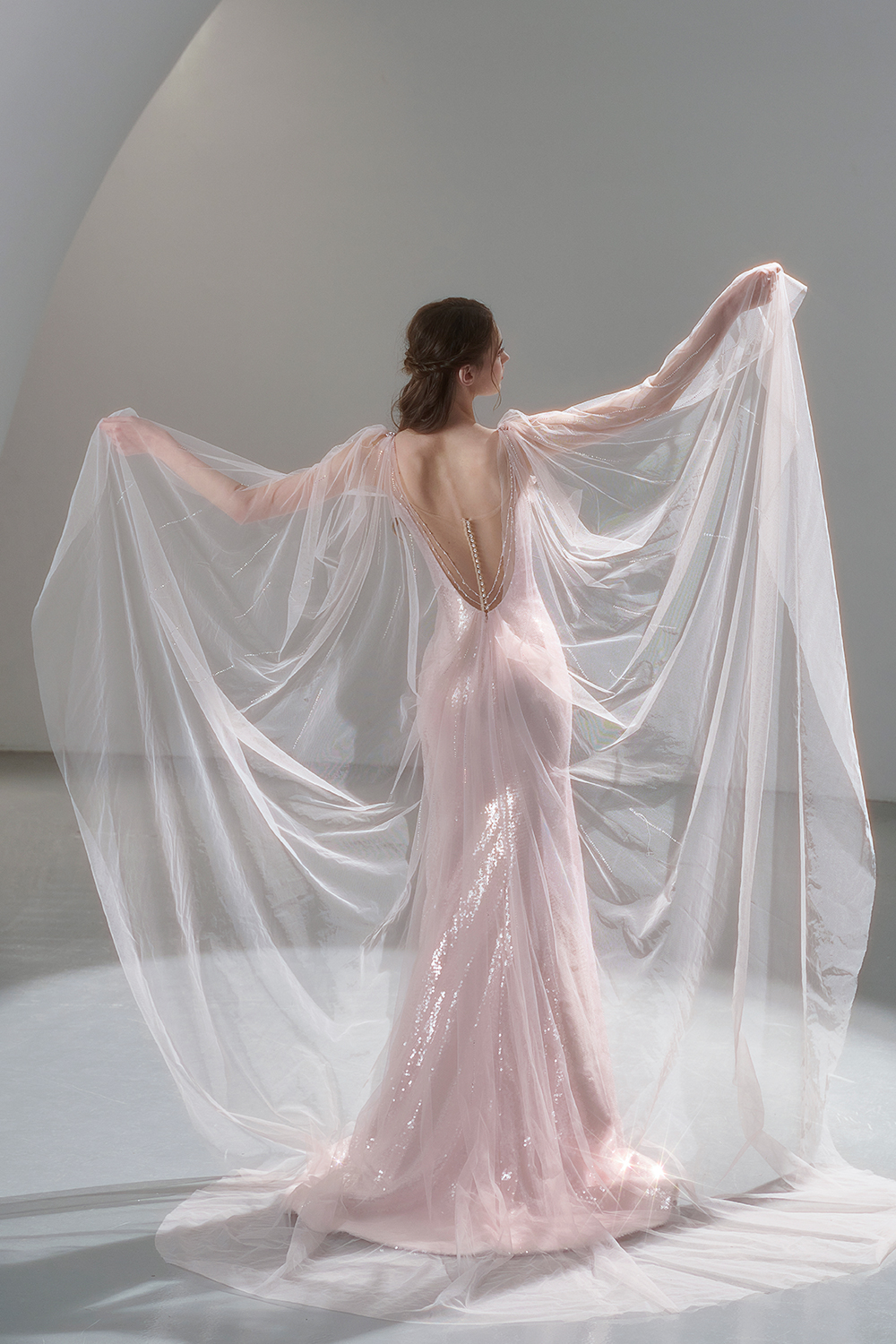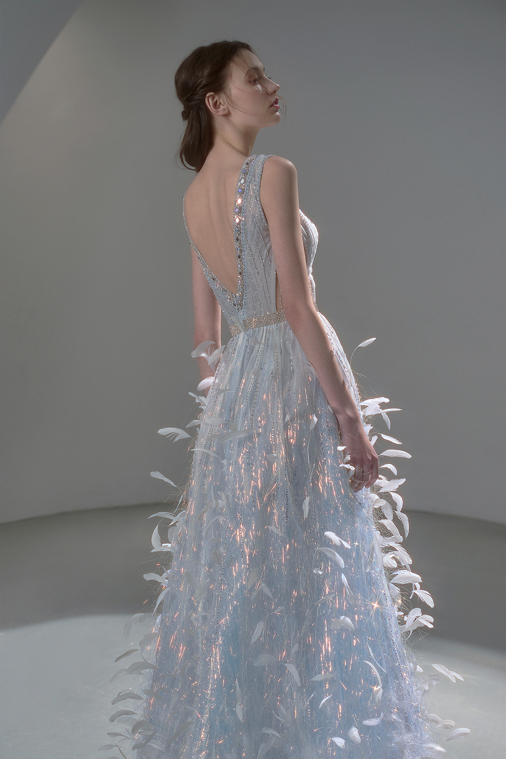 A beam of light from a star tearing apart and expanse through the darkness in the universe, bringing a story of space utopia. 89.5% of the elements present in the human body originate from stellar sources. Each individual particle absorbed into our bodies represents the history of universe since the Big Bang until the present day. We are the descendants of the stars, which they have spent 14 billion years traveling through time and space to create us, unite us and ultimately complete each other. In The Bridal by The Atelier Spring/Summer 2024 Collection, we imagine a tranquil, passionate, and brilliant world beyond the sky when we gaze upon the sun, moon, and stars. By taking the classical luxury wedding dress of Crinoline as the scroll and looking back at the orbit of the Milky Way, the space structure of celestial bodies is replicated, and the corners of the starry river reappeared. The space utopia leaps out through the wonderful craftsmanship, which all kinds of marvellous celestial bodies are cut and collaged through the garment structure, along with lace, embroidery, beading, hot fix rhinestone, and other decorative techniques. This is the romance and reminisce of the space, it is our interpretation of "one another", "fate" and "love", bringing the unique space romanticism of The Atelier.