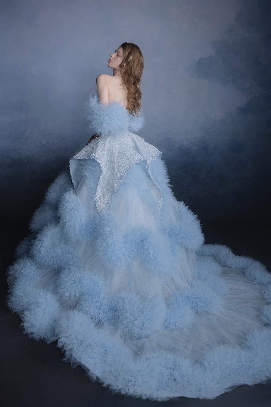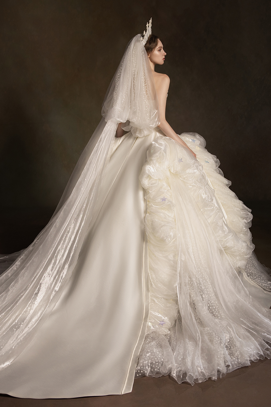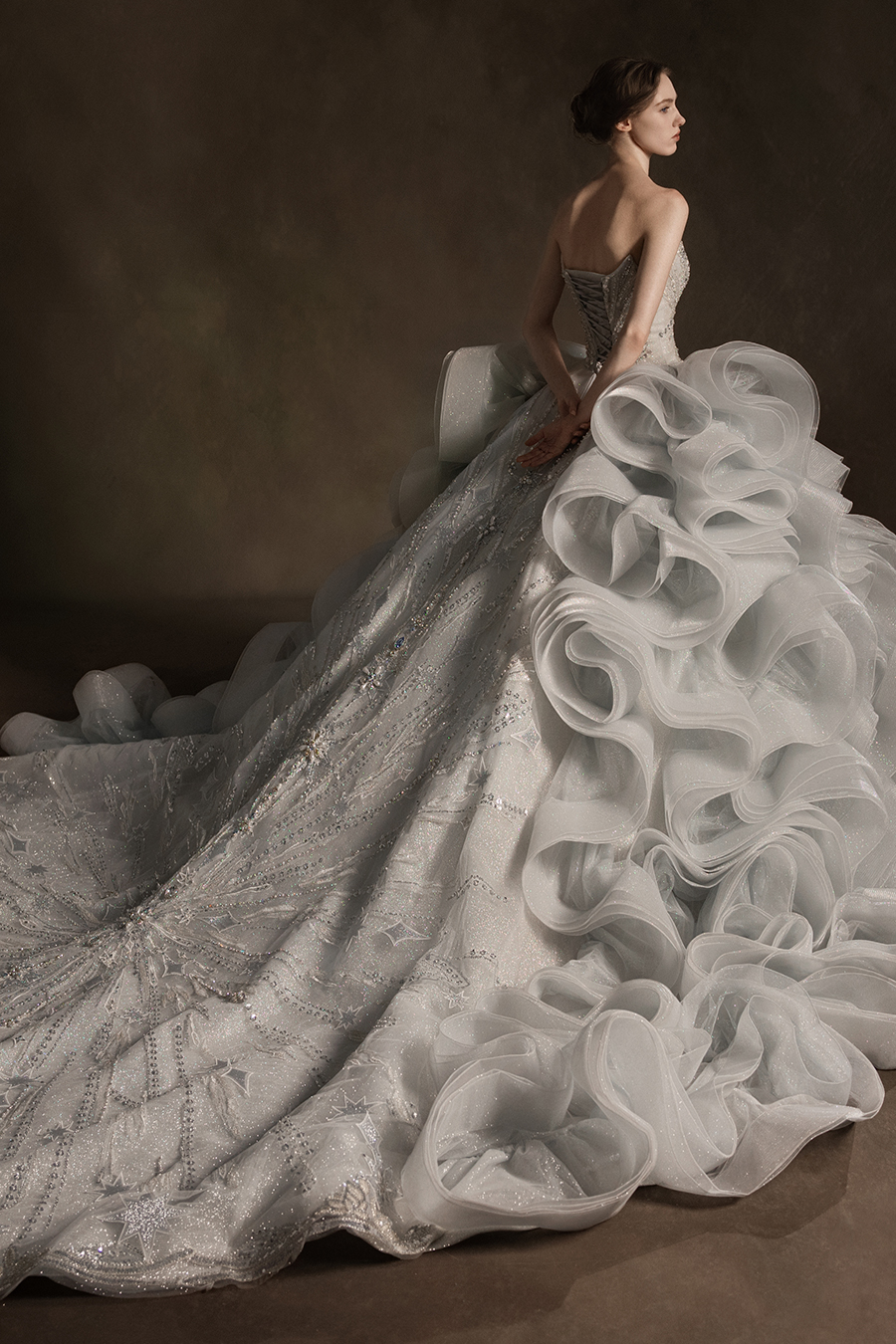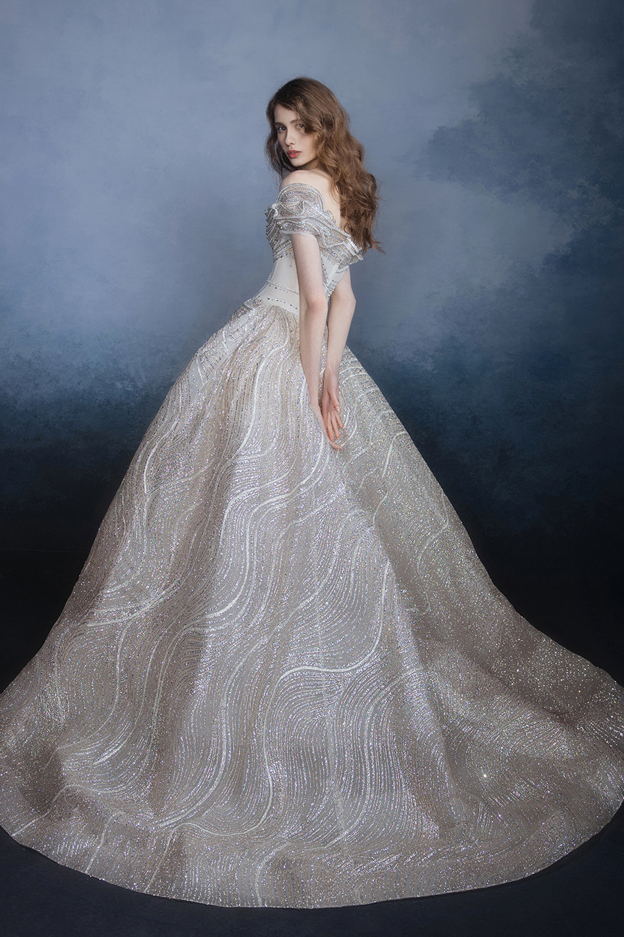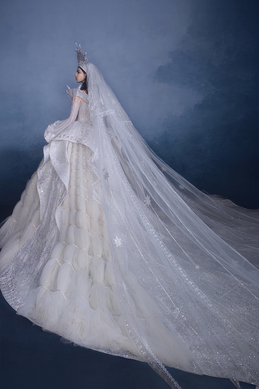 The brilliance of the stars falls from distant light years, unfolding like a swirling scroll, as time and space are immersed ingentle mystery. A light touch of the fingertips makes the stars twinkle, the Milky Way pours down, overflowing withromance. Every ray of light is a whisper from the stars, guiding us to encounter the breathtaking fusion of the universe,dreams, and romance, where we feel the real and profound allure of the starry sky.The Bridal By The Atelier 2025 Fall/Winter collection draws inspiration from the grandeur of Russian architecture and the dreamlike intertwining of stars. As the aurora described by Leo Tolstoy sweeps across the Neva River, the artisans are stitching this celestial phenomenon into the texture of the wedding gown. They skilfully capture the whispers of the galaxy,using fabric as a medium to replicate the beauty of celestial bodies, creating a dreamlike gown that dances with the stars.A variety of figurative decorative patterns are woven throughout the collection’s designs, such as “lightly drifting in the direction of star trails” and “ancient Russian architecture.” The designer skilfully employs techniques like pintucking, rhinestone application, pleating, and machine embroidery, deconstructing and recombining these elements to create magical artistic effects. Ice-blue aurora rhinestones and scattered star-like beadwork add a dazzling brilliance. Each gown is crafted with exceptional artistry, transforming the bride into the dreamy protagonist of the starry sky, radiating unique romance and embodying The Atelier’s signature celestial romanticism.roll, as time and space are immersed in gentle mystery. A light touch of the fingertips makes the stars twinkle, the Milky Way pours down, overflowing with romance. Every ray of light is a whisper from the stars, guiding us to encounter the breathtaking fusion of the universe, dreams, and romance, where we feel the real and profound allure of the starry sky