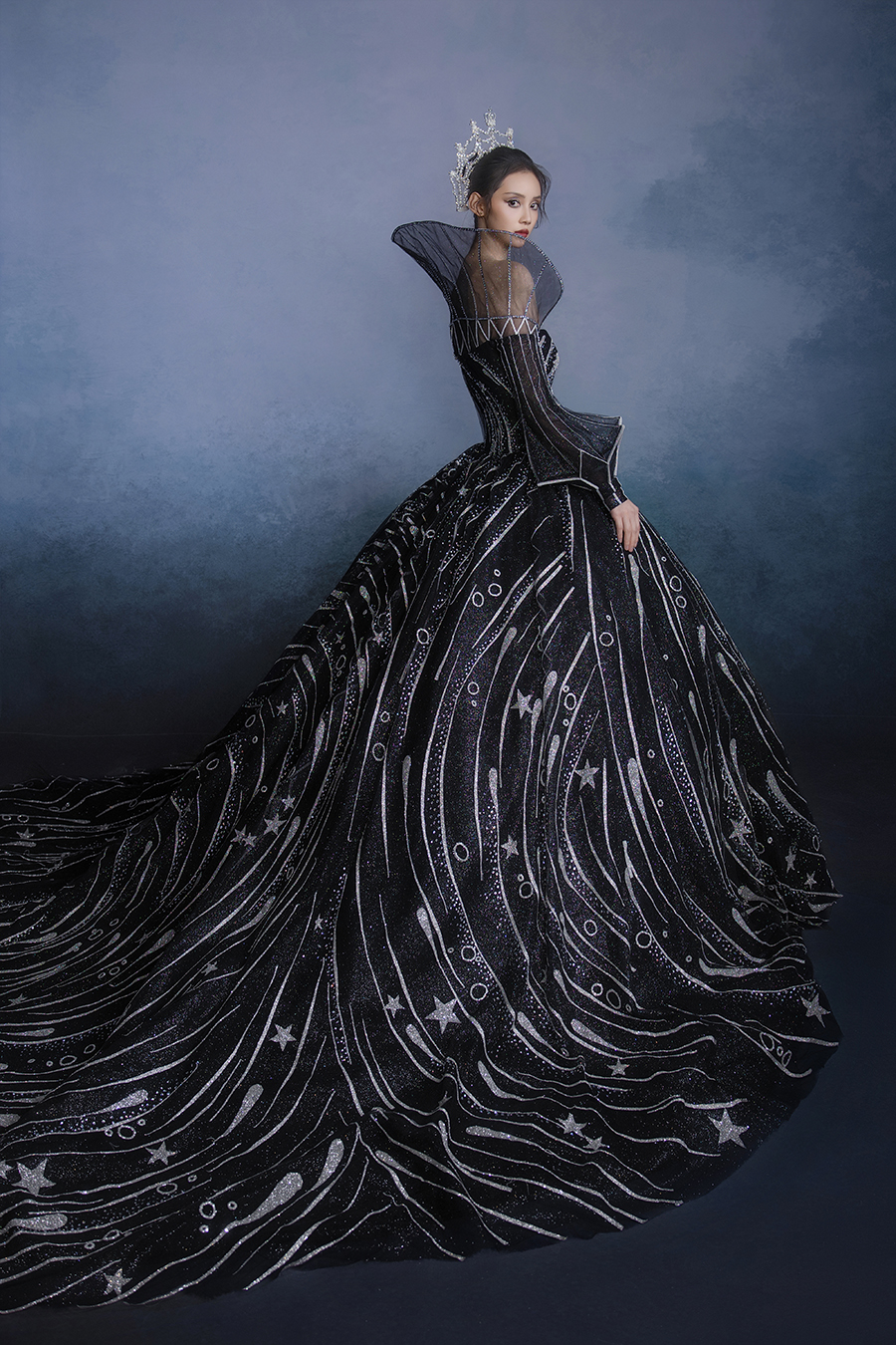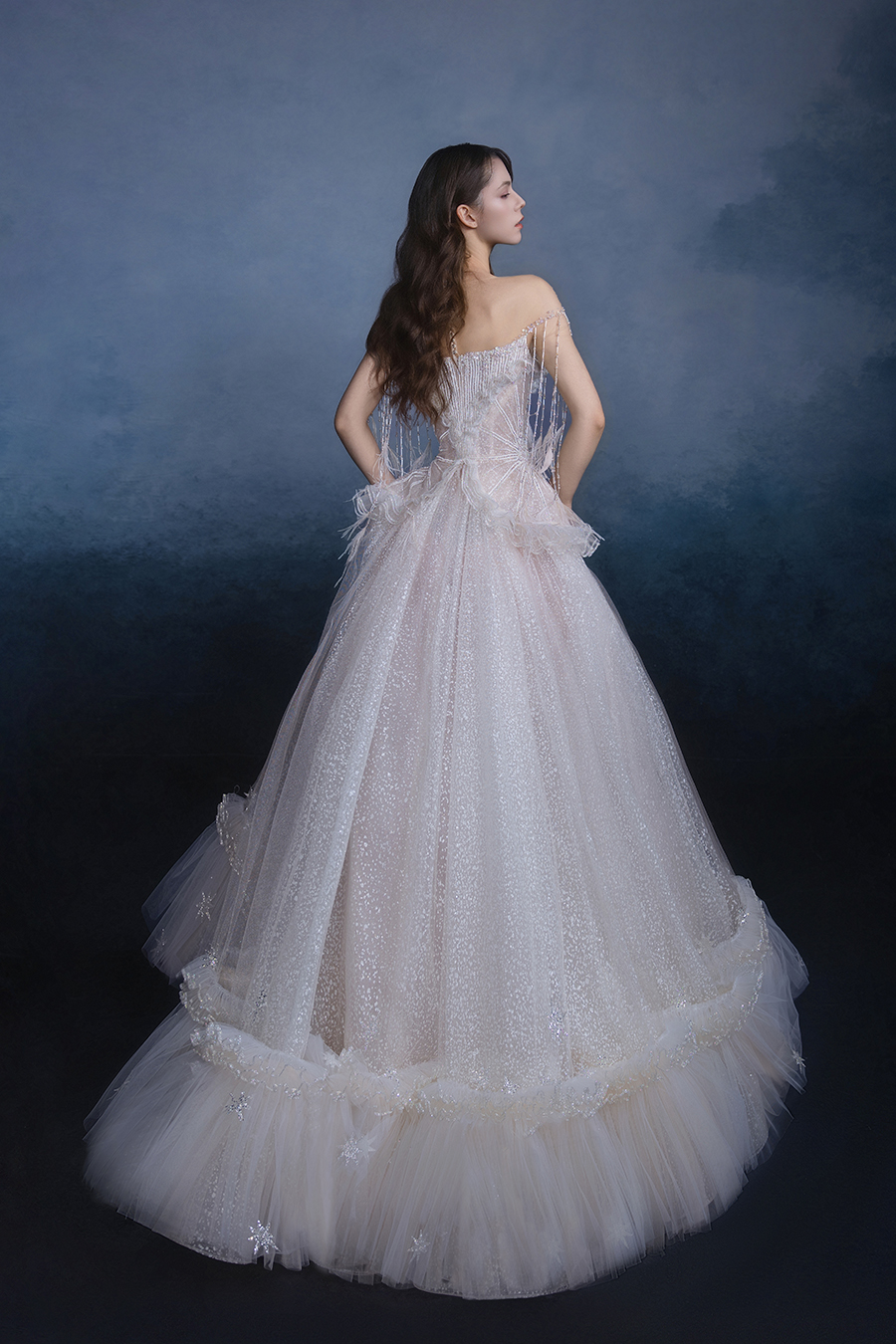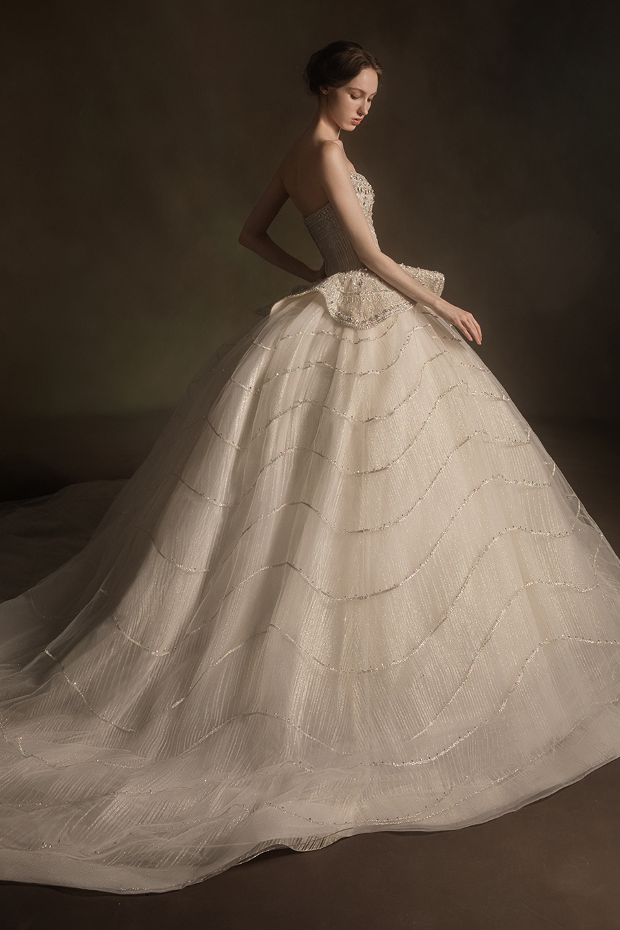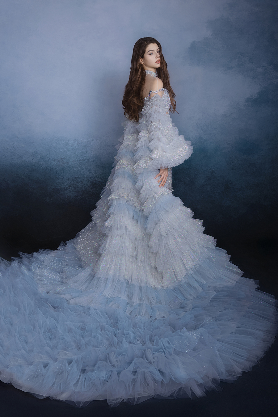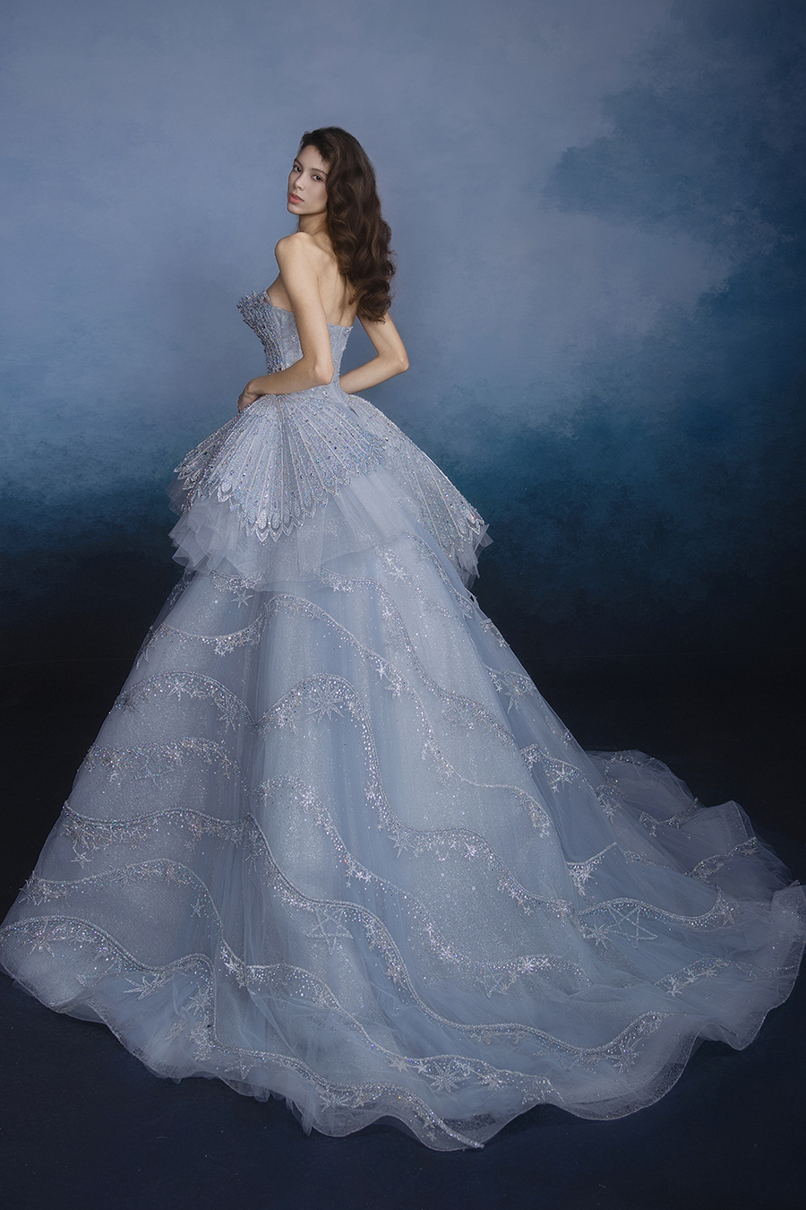 The brilliance of the stars falls from distant light years, unfolding like a swirling scroll, as time and space are immersed ingentle mystery. A light touch of the fingertips makes the stars twinkle, the Milky Way pours down, overflowing withromance. Every ray of light is a whisper from the stars, guiding us to encounter the breathtaking fusion of the universe,dreams, and romance, where we feel the real and profound allure of the starry sky.The Bridal By The Atelier 2025 Fall/Winter collection draws inspiration from the grandeur of Russian architecture and the dreamlike intertwining of stars. As the aurora described by Leo Tolstoy sweeps across the Neva River, the artisans are stitching this celestial phenomenon into the texture of the wedding gown. They skilfully capture the whispers of the galaxy,using fabric as a medium to replicate the beauty of celestial bodies, creating a dreamlike gown that dances with the stars.A variety of figurative decorative patterns are woven throughout the collection’s designs, such as “lightly drifting in the direction of star trails” and “ancient Russian architecture.” The designer skilfully employs techniques like pintucking, rhinestone application, pleating, and machine embroidery, deconstructing and recombining these elements to create magical artistic effects. Ice-blue aurora rhinestones and scattered star-like beadwork add a dazzling brilliance. Each gown is crafted with exceptional artistry, transforming the bride into the dreamy protagonist of the starry sky, radiating unique romance and embodying The Atelier’s signature celestial romanticism.roll, as time and space are immersed in gentle mystery. A light touch of the fingertips makes the stars twinkle, the Milky Way pours down, overflowing with romance. Every ray of light is a whisper from the stars, guiding us to encounter the breathtaking fusion of the universe, dreams, and romance, where we feel the real and profound allure of the starry sky