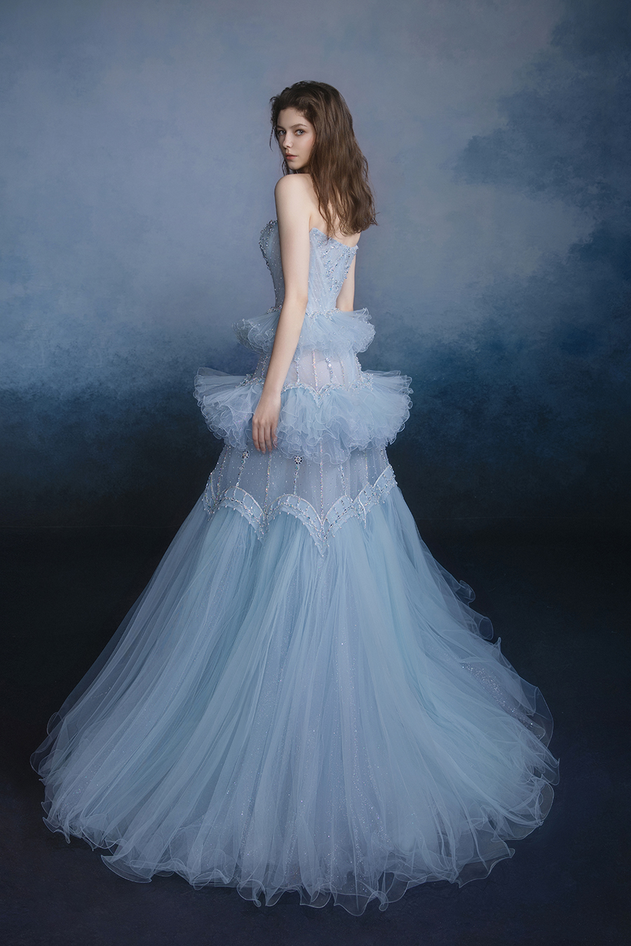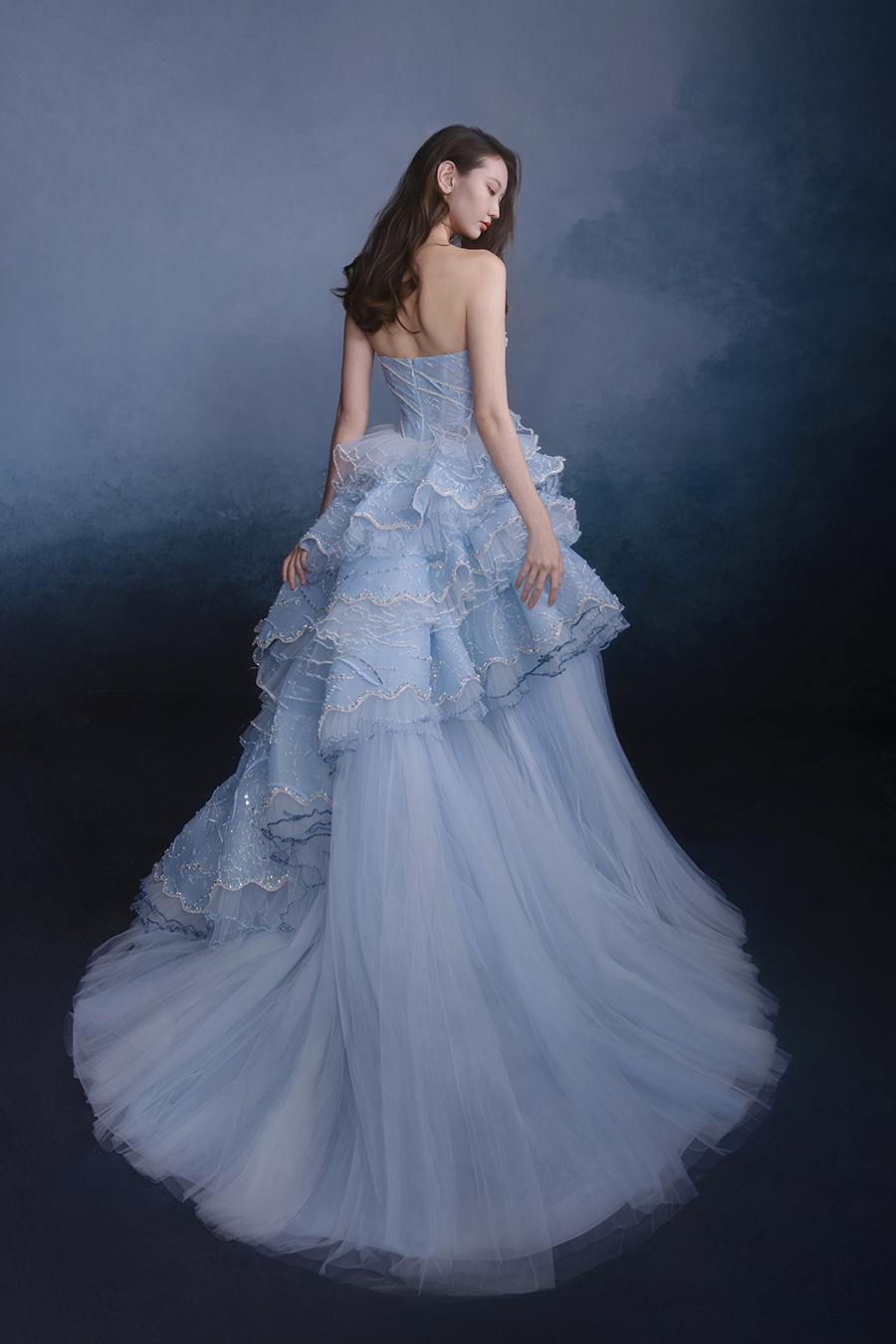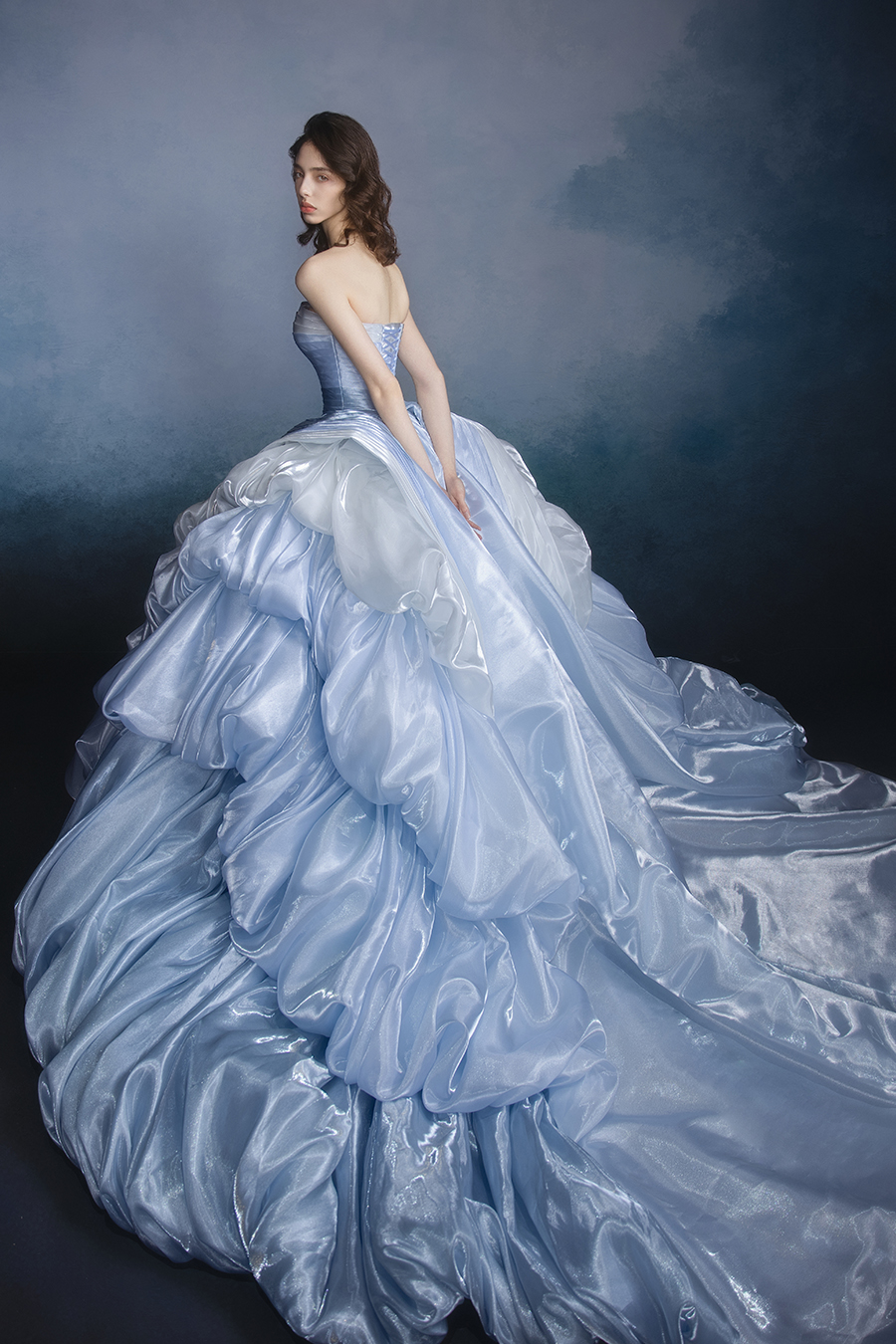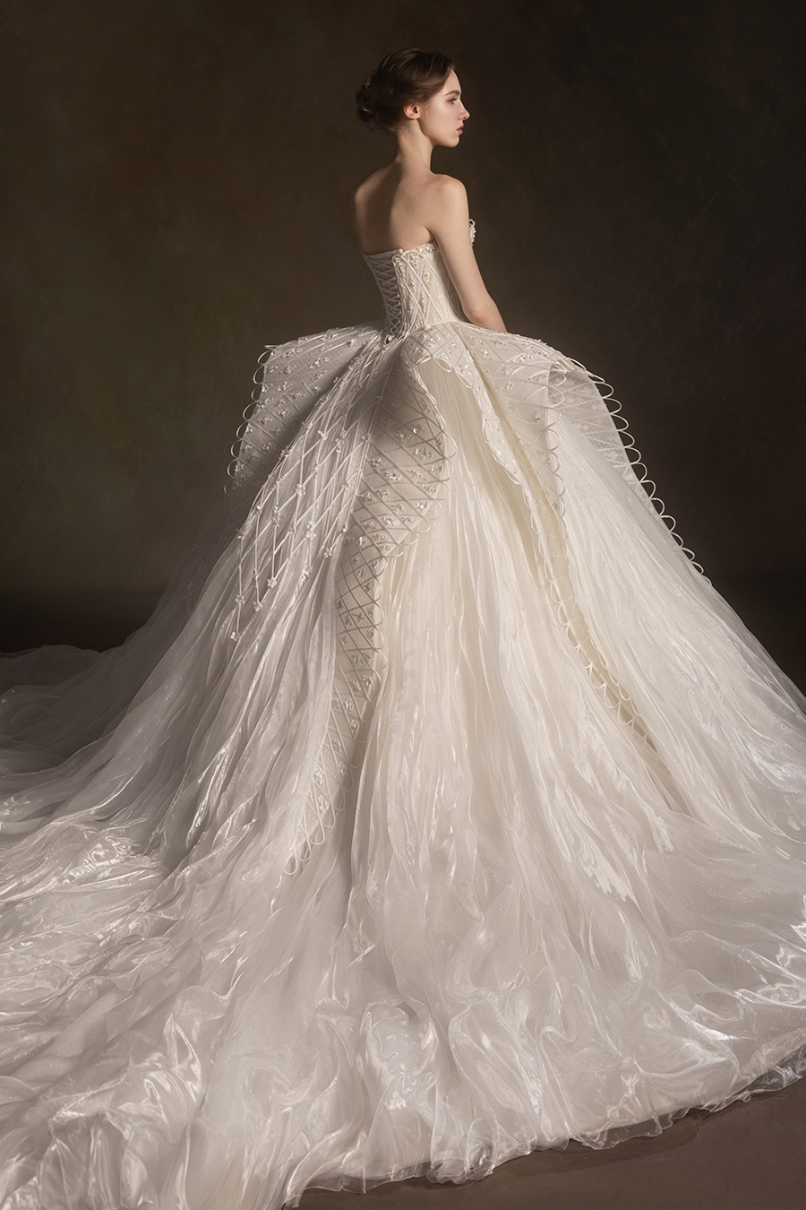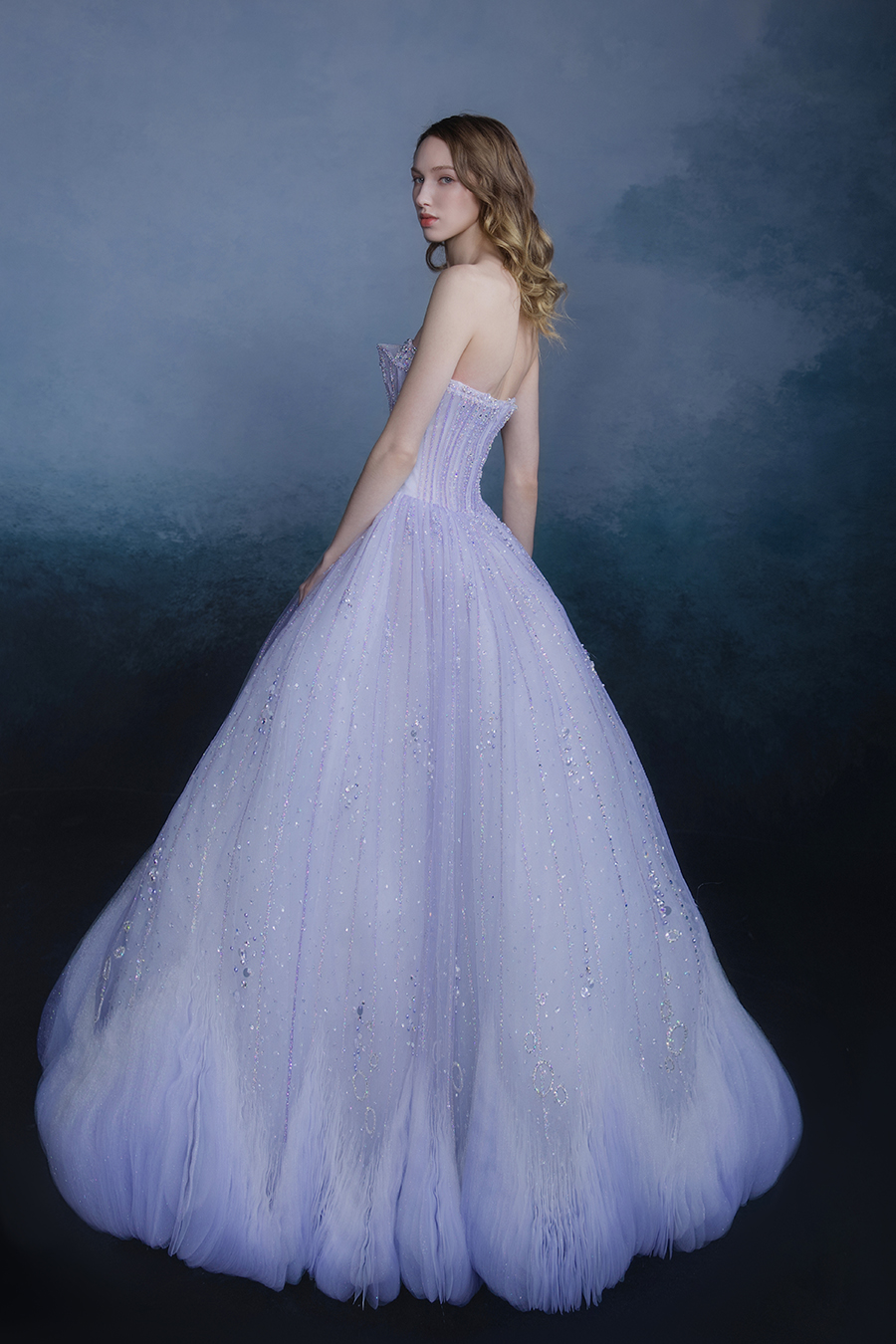 The brilliance of the stars falls from distant light years, unfolding like a swirling scroll, as time and space are immersed ingentle mystery. A light touch of the fingertips makes the stars twinkle, the Milky Way pours down, overflowing withromance. Every ray of light is a whisper from the stars, guiding us to encounter the breathtaking fusion of the universe,dreams, and romance, where we feel the real and profound allure of the starry sky.The Bridal By The Atelier 2025 Fall/Winter collection draws inspiration from the grandeur of Russian architecture and the dreamlike intertwining of stars. As the aurora described by Leo Tolstoy sweeps across the Neva River, the artisans are stitching this celestial phenomenon into the texture of the wedding gown. They skilfully capture the whispers of the galaxy,using fabric as a medium to replicate the beauty of celestial bodies, creating a dreamlike gown that dances with the stars.A variety of figurative decorative patterns are woven throughout the collection’s designs, such as “lightly drifting in the direction of star trails” and “ancient Russian architecture.” The designer skilfully employs techniques like pintucking, rhinestone application, pleating, and machine embroidery, deconstructing and recombining these elements to create magical artistic effects. Ice-blue aurora rhinestones and scattered star-like beadwork add a dazzling brilliance. Each gown is crafted with exceptional artistry, transforming the bride into the dreamy protagonist of the starry sky, radiating unique romance and embodying The Atelier’s signature celestial romanticism.roll, as time and space are immersed in gentle mystery. A light touch of the fingertips makes the stars twinkle, the Milky Way pours down, overflowing with romance. Every ray of light is a whisper from the stars, guiding us to encounter the breathtaking fusion of the universe, dreams, and romance, where we feel the real and profound allure of the starry sky