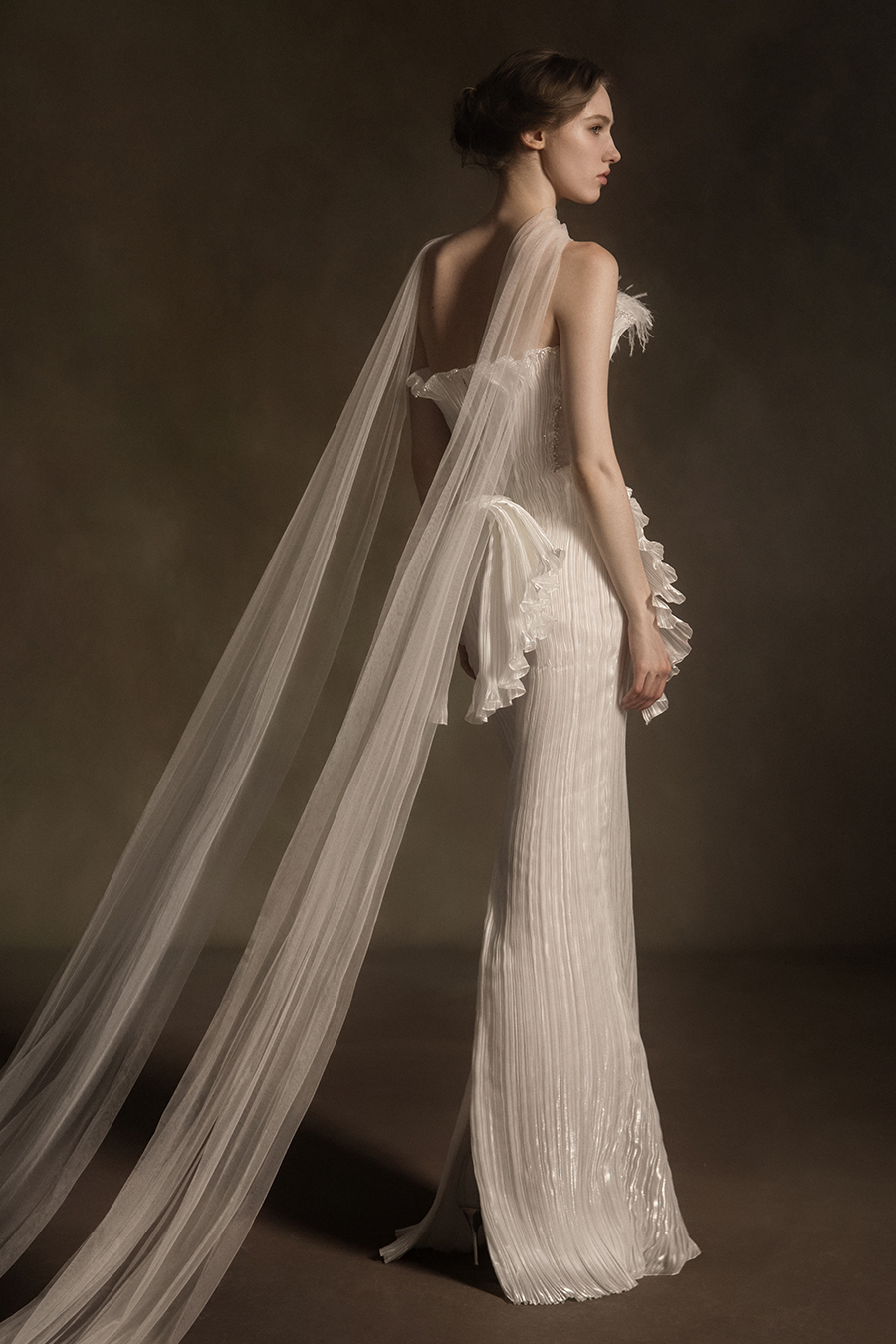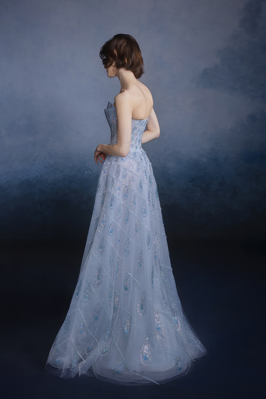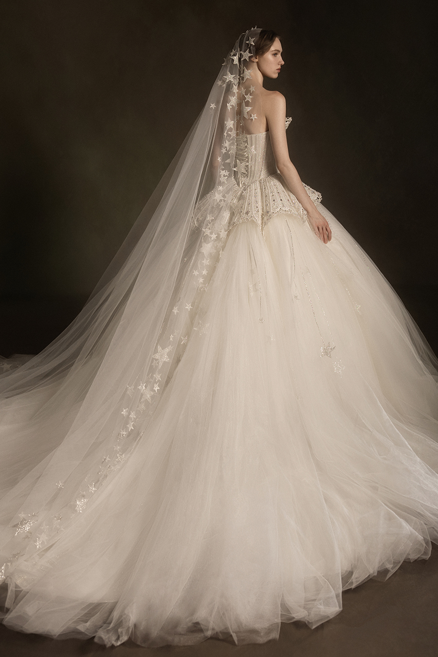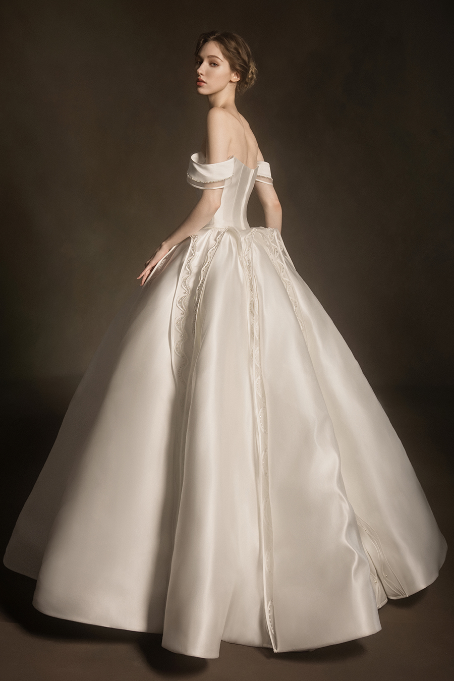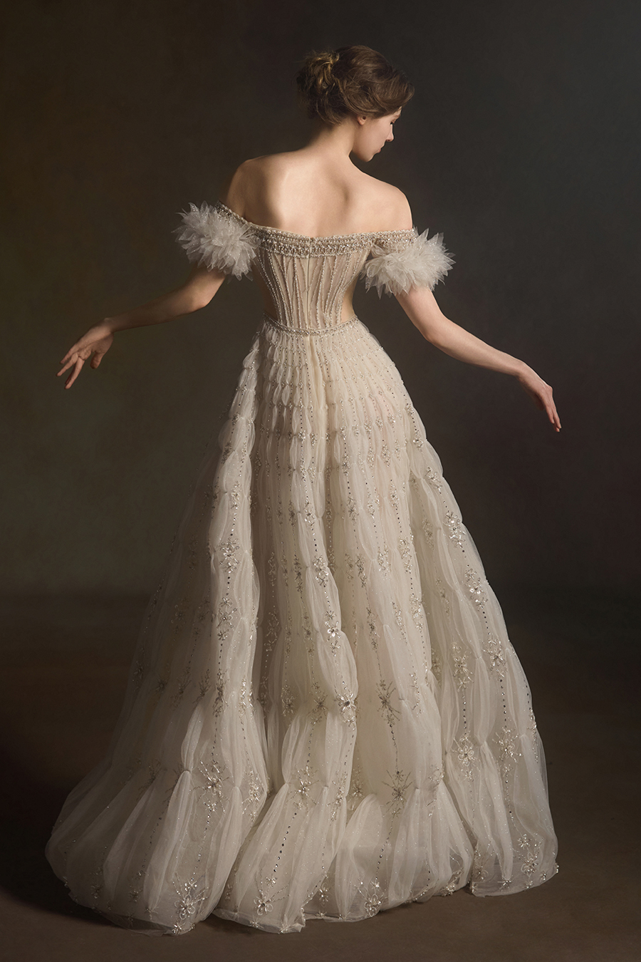The brilliance of the stars falls from distant light years, unfolding like a swirling scroll, as time and space are immersed ingentle mystery. A light touch of the fingertips makes the stars twinkle, the Milky Way pours down, overflowing withromance. Every ray of light is a whisper from the stars, guiding us to encounter the breathtaking fusion of the universe,dreams, and romance, where we feel the real and profound allure of the starry sky.The Bridal By The Atelier 2025 Fall/Winter collection draws inspiration from the grandeur of Russian architecture and the dreamlike intertwining of stars. As the aurora described by Leo Tolstoy sweeps across the Neva River, the artisans are stitching this celestial phenomenon into the texture of the wedding gown. They skilfully capture the whispers of the galaxy,using fabric as a medium to replicate the beauty of celestial bodies, creating a dreamlike gown that dances with the stars.A variety of figurative decorative patterns are woven throughout the collection’s designs, such as “lightly drifting in the direction of star trails” and “ancient Russian architecture.” The designer skilfully employs techniques like pintucking, rhinestone application, pleating, and machine embroidery, deconstructing and recombining these elements to create magical artistic effects. Ice-blue aurora rhinestones and scattered star-like beadwork add a dazzling brilliance. Each gown is crafted with exceptional artistry, transforming the bride into the dreamy protagonist of the starry sky, radiating unique romance and embodying The Atelier’s signature celestial romanticism.roll, as time and space are immersed in gentle mystery. A light touch of the fingertips makes the stars twinkle, the Milky Way pours down, overflowing with romance. Every ray of light is a whisper from the stars, guiding us to encounter the breathtaking fusion of the universe, dreams, and romance, where we feel the real and profound allure of the starry sky